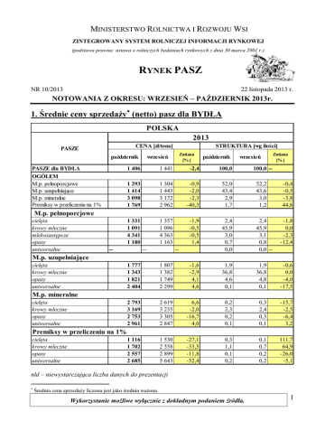 MINISTERSTWO ROLNICTWA I ROZWOJU WSI ZINTEGROWANY SYSTEM ROLNICZEJ INFORMACJI RYNKOWEJ (podstawa prawna: ustawa o rolniczych badaniach rynkowych z dnia 30 marca 2001 r.) RYNEK PASZ NR 10/2013 22 listopada 2013 r. NOTOWANIA Z OKRESU: WRZESIEŃ – PAŹDZIERNIK 2013r. 1. Średnie ceny sprzedaży (netto) pasz dla BYDŁA POLSKA 2013 CENA [zł/tona] PASZE październik PASZE dla BYDŁA OGÓŁEM M.p. pełnoporcjowe M.p. uzupełniające M.p. mineralne Premiksy w przeliczeniu na 1% STRUKTURA [wg ilości] Zmiana [% ] wrzesień październik wrzesień Zmiana [% ] 1 406 1 441 -2,4 100,0 100,0 -- 1 293 1 414 3 098 1 769 1 304 1 443 3 172 2 962 -0,9 -2,0 -2,3 -40,3 52,0 43,4 2,9 1,7 52,2 43,6 3,0 1,2 1 331 1 091 4 341 1 180 1 357 1 096 4 363 1 163 -1,9 -0,5 -0,5 1,4 2,4 45,9 3,0 0,7 0,0 2,4 45,9 3,1 0,8 0,0 -- -1,8 0,0 -2,3 -12,4 -0,4 -0,5 -3,8 44,8 M.p. pełnoporcjowe cielęta krowy mleczne mlekozastępcze opasy uniwersalne -- -- -- M.p. uzupełniające cielęta krowy mleczne opasy uniwersalne 1 777 1 343 1 821 2 404 1 807 1 382 1 749 2 299 -1,6 -2,9 4,1 4,6 1,9 36,8 4,6 0,1 1,9 36,8 4,8 0,1 -0,6 0,0 -4,0 -17,5 2 793 3 169 2 753 2 961 2 619 3 235 3 305 2 847 6,6 -2,0 -16,7 4,0 0,2 2,3 0,2 0,1 0,3 2,4 0,3 0,1 -15,7 -2,5 -6,4 3,2 1 116 1 702 2 557 2 685 1 530 2 558 2 899 5 643 -27,1 -33,5 -11,8 -52,4 0,3 1,1 0,1 0,2 0,1 0,7 0,2 0,2 111,7 64,9 -26,0 -5,1 M.p. mineralne cielęta krowy mleczne opasy uniwersalne Premiksy w przeliczeniu na 1% cielęta krowy mleczne opasy uniwersalne nld – niewystarczająca liczba danych do prezentacji Średnia cena sprzedaży liczona jest jako średnia ważona Wykorzystanie możliwe wyłącznie z dokładnym podaniem źródła. 1 Średnie ceny sprzedaży mieszanek paszowych pełnoporcjowych dla krów mlecznych [zł/tona] 1250 1200 1150 1100 1050 1000 I II III IV V VI 2012 VII VIII IX X XI XII 2013 Średnie ceny sprzedaży mieszanek paszowych uzupełniających dla krów mlecznych [zł/tona] 1500 1450 1400 1350 1300 1250 1200 1150 I II III IV V VI 2012 VII VIII 2013 IX X XI XII Średnie ceny sprzedaży mieszanek mineralnych dla krów mlecznych [zł/tona] 3250 3200 3150 3100 3050 3000 2950 I II III IV V 2012 VI VII VIII 2013 IX X XI XII XI XII Średnie ceny sprzedaży premiksów dla krów mlecznych [zł/tona] 3150 2950 2750 2550 2350 2150 1950 1750 1550 1350 I II III IV V 2012 VI VII VIII 2013 IX X Wykorzystanie możliwe wyłącznie z dokładnym podaniem źródła. 2 REGION WSCHODNI 2013 CENA [zł/tona] PASZE październik PASZE dla BYDŁA OGÓŁEM M.p. pełnoporcjowe M.p. uzupełniające M.p. mineralne Premiksy w przeliczeniu na 1% STRUKTURA [wg ilości] Zmiana [% ] wrzesień październik wrzesień Zmiana [% ] 1 323 1 356 -2,4 100,0 100,0 -- 1 289 1 275 3 198 3 043 1 303 1 304 3 374 3 437 -1,0 -2,3 -5,2 -11,5 48,2 49,6 1,4 0,8 47,9 49,6 1,7 0,8 0,7 -0,1 -16,3 -2,9 1 391 1 141 4 527 1 048 1 425 1 143 4 557 1 031 -2,4 -0,1 -0,6 1,6 2,0 44,0 2,0 0,2 0,0 2,0 43,4 2,1 0,4 0,0 -- 0,3 1,6 -6,1 -51,0 M.p. pełnoporcjowe cielęta krowy mleczne mlekozastępcze opasy uniwersalne -- -- -- M.p. uzupełniające cielęta krowy mleczne opasy uniwersalne 1 492 1 204 1 915 2 404 1 508 1 246 1 791 2 299 -1,1 -3,4 6,9 4,6 2,2 43,4 3,8 0,1 2,2 43,3 4,0 0,1 1,5 0,3 -4,4 -16,6 2 693 3 306 3 170 2 961 2 445 3 480 3 988 2 847 10,1 -5,0 -20,5 4,0 0,1 0,9 0,2 0,2 0,2 1,1 0,2 0,2 -43,4 -16,3 -7,1 4,3 3 586 3 755 2 938 6,8 -9,5 -11,5 0,0 0,4 0,2 0,1 0,0 0,5 0,3 0,0 -26,7 -4,7 -25,9 1534,9 M.p. mineralne cielęta krowy mleczne opasy uniwersalne Premiksy w przeliczeniu na 1% cielęta krowy mleczne opasy uniwersalne 3 831 3 397 2 600 nld nld -- Wykorzystanie możliwe wyłącznie z dokładnym podaniem źródła. 3 REGION ZACHODNI 2013 CENA [zł/tona] PASZE październik wrzesień PASZE dla BYDŁA OGÓŁEM M.p. pełnoporcjowe M.p. uzupełniające M.p. mineralne Premiksy w przeliczeniu na 1% STRUKTURA [wg ilości] Zmiana [% ] październik wrzesień Zmiana [% ] 1 593 1 638 -2,7 100,0 100,0 -- 1 299 1 939 3 045 1 200 1 306 1 982 3 038 2 548 -0,6 -2,1 0,2 -52,9 60,4 29,6 6,2 3,8 62,2 29,7 6,1 2,1 -2,9 -0,2 2,5 82,6 1 241 990 4 191 1 214 1 258 1 006 4 191 1 240 -1,3 -1,5 0,0 -2,1 3,1 50,1 5,5 1,7 0,0 3,3 51,8 5,5 1,6 0,0 -- -5,7 -3,3 -0,6 7,6 -0,5 -2,9 0,3 1,1 22,1 6,5 0,0 1,1 21,8 6,8 0,0 -- -7,4 1,4 -4,4 1,5 0,0 0,5 0,5 5,5 0,3 0,0 0,4 5,3 0,3 0,0 -- 11,1 2,2 -5,4 -10,0 -25,7 1,7 0,9 2,5 0,0 0,4 0,4 1,1 0,0 0,6 M.p. pełnoporcjowe cielęta krowy mleczne mlekozastępcze opasy uniwersalne -- -- -- M.p. uzupełniające cielęta krowy mleczne opasy uniwersalne 3 125 1 953 1 696 -- 3 140 2 010 1 692 -- -- M.p. mineralne cielęta krowy mleczne opasy uniwersalne 2 844 3 115 1 986 -- 2 801 3 114 1 977 -- -- Premiksy w przeliczeniu na 1% cielęta krowy mleczne opasy uniwersalne 917 1 037 1 103 nld 1 019 1 396 1 084 nld -- Wykorzystanie możliwe wyłącznie z dokładnym podaniem źródła. 140,3 127,8 0,1 -38,4 4 2. Średnie ceny sprzedaży (netto) pasz dla DROBIU POLSKA 2013 CENA [zł/tona] PASZE październik PASZE dla DROBIU M.p. pełnoporcjowe M.p. uzupełniające M.p. mineralne Premiksy Pasze dla BROJLERÓW Pasze dla INDYKÓW Pasze dla NIOSEK/KOGUTÓW Pasze UNIWERSALNE 1 359 1 312 2 491 4 385 2 782 1 436 1 513 1 107 1 446 wrzesień 1 385 1 335 2 517 4 512 3 053 1 460 1 590 1 121 1 649 STRUKTURA [wg ilości] Zmiana [% ] październik -1,9 -1,7 -1,0 -2,8 -8,9 -1,6 -4,9 -1,2 -12,3 Zmiana [% ] wrzesień 100,0 97,0 1,0 0,4 1,6 60,8 12,5 26,3 0,4 100,0 -97,1 -0,1 0,9 8,5 0,3 5,0 1,6 -0,6 60,5 0,4 11,9 5,2 27,0 -2,7 0,6 -22,7 REGION WSCHODNI 2013 CENA [zł/tona] PASZE październik PASZE dla DROBIU M.p. pełnoporcjowe M.p. uzupełniające M.p. mineralne Premiksy Pasze dla BROJLERÓW Pasze dla INDYKÓW Pasze dla NIOSEK/KOGUTÓW Pasze UNIWERSALNE 1 382 1 348 2 524 5 035 3 676 1 444 1 583 1 115 1 857 wrzesień 1 399 1 363 2 556 5 002 3 973 1 463 1 659 1 125 1 725 STRUKTURA [wg ilości] Zmiana [% ] październik -1,2 -1,1 -1,2 0,6 -7,5 -1,3 -4,6 -0,9 7,7 wrzesień 100,0 98,3 0,9 0,2 0,6 65,3 11,0 23,7 0,0 Zmiana [% ] 100,0 -98,3 0,0 