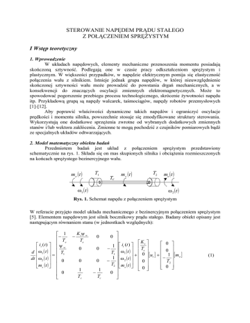 STEROWANIE NAPĘDEM PRĄDU STAŁEGO Z POŁĄCZENIEM SPRĘŻYSTYM I Wstęp teoretyczny 1. Wprowadzenie W układach napędowych, elementy mechaniczne przenoszenia momentu posiadają skończoną sztywność. Podlegają one w czasie pracy odkształceniom sprężystym i plastycznym. W większości przypadków, w napędzie elektrycznym pomija się elastyczność połączenia wału z silnikiem. Istnieje jednak grupa napędów, w której nieuwzględnienie skończonej sztywności wału może prowadzić do powstania drgań mechanicznych, a w konsekwencji do znaczących oscylacji zmiennych elektromagnetycznych. Może to spowodować pogorszenie przebiegu procesu technologicznego, skrócenie żywotności napędu itp. Przykładową grupą są napędy walcarek, taśmociągów, napędy robotów przemysłowych [1]-[12]. Aby poprawić właściwości dynamiczne takich napędów i ograniczyć oscylacje prędkości i momentu silnika, powszechnie stosuje się zmodyfikowane struktury sterowania. Wykorzystują one dodatkowe sprzężenia zwrotne od wybranych dodatkowych zmiennych stanów i/lub wektora zakłócenia. Zmienne te mogą pochodzić z czujników pomiarowych bądź ze specjalnych układów odtwarzających. 2. Model matematyczny obiektu badań Przedmiotem badań jest układ z połączeniem sprężystym przedstawiony schematycznie na rys. 1. Składa się on mas skupionych silnika i obciążenia rozmieszczonych na końcach sprężystego bezinercyjnego wału. me ( t ) T1 ω1 ( t ) Tc ms ( t ) T2 mo ( t ) ω2 (t ) Rys. 1. Schemat napędu z połączeniem sprężystym W referacie przyjęto model układu mechanicznego z bezinercyjnym połączeniem sprężystym [5]. Elementem napędowym jest silnik bocznikowy prądu stałego. Badany obiekt opisany jest następującym równaniem stanu (w jednostkach względnych): 1 − T e i t ( t ) ψ w d ω1 ( t ) T1 = dt ω2 ( t ) 0 ms ( t ) 0 − K tψ w Te 0 0 0 0 0 1 Tc − 1 Tc 0 Kt 0 1 it (t ) 0 − Te T1 ω1 ( t ) 0 + [ ut ] + 1 [ m o ] − 1 − ω 2 ( t ) 0 T2 T2 ms ( t ) 0 0 0 (1) gdzie: it – prąd twornika silnika napędowego (moment elektromagnetyczny), ω1 – prędkość silnika, ω2 – prędkość maszyny obciążającej, ms – moment skrętny, mo – moment obciążenia, T1 – mechaniczna stała czasowa silnika, T2 – mechaniczna stała czasowa maszyny obciążającej, TC – stała czasowa elementu sprężystego, Kt – współczynnik wzmocnienia obwodu twornika, ψw – strumień wzbudzenia silnika prądu stałego. Rozważa się kaskadową strukturę regulacji prędkości przedstawioną na rysunku 2. ut ( t ) ω z (t ) Filtr Regulator prędkości Regulator prądu Układ z połączeniem sprężystym ω2 (t ) ω1 (t ) Przekszta łtnik it ( t ) mo ( t ) Rys 2. Schemat kaskadowej struktury sterowania napędu prądu stałego Wewnętrzny obwód regulacji prądu twornika zawiera: regulator prądu, przekształtnik energoelektroniczny, obwód twornika silnika prądu stałego oraz układ pomiaru prądu. Regulator prądu stroi się w sposób umożliwiający szybką kontrolę momentu elektromagnetycznego (zwykle za pomocą kryterium modułu). Tak zoptymalizowany obwód regulacji posiada transmitancję operatorową członu inercyjnego. Ze względu na niewielką inercję układu wytwarzania momentu, w porównaniu do mechanicznych stałych czasowych układu napędowego, zoptymalizowaną pętlę regulacji prądu twornika (momentu elektromagnetycznego) można zastąpić członem o transmitancji operatorowej równej 1 [11]. Zewnętrzna, nadrzędna pętla sterowania obejmuje: regulator prędkości, zoptymalizowany obwód kształtowania momentu, część mechaniczną układu napędowego (część mechaniczna silnika, element sprężysty, część mechaniczna maszyny roboczej) oraz układ pomiaru prędkości. Parametry regulatora prędkości dobiera się zazwyczaj za pomocą kryterium symetrii. Jednak tak zoptymalizowany układ sterowania nie zapewnia tłumienia drgań prędkości mechanizmu roboczego i niezbędna staje się modyfikacja struktury sterowania prędkości przy wykorzystaniu dodatkowych sprzężeń zwrotnych. 3. Analiza struktur sterowania Rozważa się układ sterowania napędu z połączeniem sprężystym z dodatkowymi sprzężeniami zwrotnymi, przedstawiony na rysunku 3. W strukturze tej można zastosować następujące sprzężenia zwrotne: od wartości momentu skrętnego (k1), pochodnej momentu skrętnego (k2), różnicy prędkości obciążenia i silnika (k3). Układ dwumasowy mo ωz T1 me Tc ω1 ms T2 ω2 Gr k1 sk2 k3 Rys 3. Schemat układu napędowego z dodatkowymi sprzężeniami zwrotnymi Zmiany prędkości obciążenia takiego układu opisują następujące transmitancje: - transmitancja przewodnia prędkości obciążenia G pω 2 ( s ) : Gpω 2 ( s ) = ∆ω2 ( s ) Gr = 3 , 2 ∆ω z ( s ) s T1T2Tc + s T2Tc Gr (1 + k 3 ) + s( T1 + T2 (1 + k1 + sk 2 ) ) + Gr (2) - transmitancja zakłóceniowa prędkości obciążenia Gzω2 ( s ) : Gzω 2 ( s ) = ( ) ∆ ω2 ( s ) − s 2T1T2 + sTcGr (1 + k3 ) + (1 + k1 + sk 2 ) = 3 , ∆mo ( s ) s T1T2Tc + s 2 T2TcG r ( 1 + k3 ) + s ( T1 + T2 (1 + k1 + sk2 ) ) + Gr (3) KI + KP s gdzie: – transmitancja regulatora prędkości. W przypadku braku dodatkowych sprzężeń zwrotnych układ posiada współczynnik tłumienia drgań ξ i pulsacje rezonansową ω0 zależną od parametrów układu mechanicznego, określone następująco: 1 ω0 = , (4) T2 Tc Gr = 1 T2 . (5) 2 T1 Parametry regulatora prędkości typu PI dobiera się w sposób zapewniający istnienie biegunów podwójnych w równaniu charakterystycznym układu. Przy takim założeniu projektowym współczynniki części proporcjonalnej i całkującej oblicza się według następujących zależności: T Kp = 2 1 , (6) Tc ξ= T1 . (7) T2Tc Układ charakteryzuje się współczynnikiem tłumienia drgań zależnym od stosunku stałych czasowych: mechanizmu do silnika. W przypadku jego małej wartości, w przebiegu prędkości KI = mechanizmu występują słabo tłumione