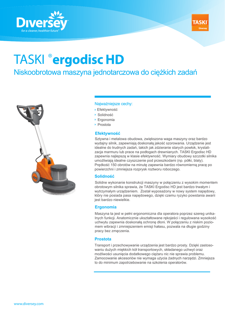TASKI ® Niskoobrotowa maszyna jednotarczowa do ciężkich zadań Najważniejsze cechy: Efektywność Solidność Ergonomia Prostota Efektywność Sztywna i metalowa obudowa, zwiększona waga maszyny oraz bardzo wydajny silnik, zapewniają doskonałą jakość szorowania. Urządzenie jest idealne do trudnych zadań, takich jak zdzieranie starych powłok, krystalizacja marmuru lub prace na podłogach drewnianych. TASKI Ergodisc HD zapewnia najlepszą w klasie efektywność. Wymiary obudowy szczotki silnika umożliwiają idealne czyszczenie pod przeszkodami (np. półki, blaty). Prędkość 150 obrotów na minutę zapewnia bardzo równomierną pracę po powierzchni i zmniejsza rozprysk roztworu roboczego. Solidność Solidne wykonanie konstrukcji maszyny w połączeniu z wysokim momentem obrotowym silnika sprawia, że TASKI Ergodisc HD jest bardzo trwałym i wytrzymałym urządzeniem. Został wyposażony w nowy system napędowy, który nie posiada pasa napędowego, dzięki czemu ryzyko powstania awarii jest bardzo niewielkie. Ergonomia Maszyna ta jest w pełni ergonomiczna dla operatora poprzez szereg unikalnych funkcji. Anatomicznie ukształtowane rękojeści i regulowana wysokość uchwytu zapewnia doskonałą ochronę dłoni. W połączeniu z niskim poziomem wibracji i zmniejszeniem emisji hałasu, pozwala na długie godziny pracy bez zmęczenia. Prostota Transport i przechowywanie urządzenia jest bardzo prosty. Dzięki zastosowaniu dużych miękkich kół transportowych, składanego uchwyt oraz możliwości usunięcia dodatkowego ciężaru nic nie sprawia problemu. Zamocowanie akcesoriów nie wymaga użycia żadnych narzędzi. Zmniejsza to do minimum zapotrzebowanie na szkolenia operatorów. www.diversey.com TASKI ergodisc HD Dane techniczne Opis Szerokość pracy Opis 43cm Wysokość silnika 35 cm Liczba obrotów 150 RPM Wysokość obudowy szczotki 8 cm Napięcie 230V/50Hz Klasa bezpieczeństwa II Zużycie energii 1.1 kW Certyfikaty CB-Protocol Waga 54 kg Obudowa urządzenia Aluminium Dodatkowe obciążenie 10kg Napęd Brak pasa napędowego Długość kabla 15 meter Urządzenie Model SKU TASKI ergodisc HD 7518199 Akcesoria Akcesoria i dodatkowe części SKU Ciężarek 10kg do ergodisc HD 7518579 Tarcza napędowa 43cm 8504410 Szczotka szorująca 43cm 8504750 Szczotka szorująca do betonu 43cm 8504800 Szczotka szorująca ścierna 43cm 8504780 Zbiornik na wodę 8504390 Dysk do szlifowania drewna 7510031 Dysk do szlifowania marmuru 8505090 Tarcza do mocowania padów szlifierskich 8503830 Dodatkowa informacja Możliwość zamontowania zbiornika na wodę, bezpośrednio do urządzenia jest bardzo ergonomicznym rozwiązaniem. Umożliwia to dozowanie roztworu na powierzchnie i minimalizuje efekt rozpryskiwania. Diversey Polska Sp. z o.o. ul. Fabryczna 5 00-446 Warszawa tel. 22 328 10 00 W celu uzyskania większej ilości informacji, prosimy o kontakt lub wejście na stronę www.diversey.com Copyright © 2011, Diversey, Inc.