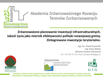 Zrównoważone planowanie inwestycji infrastrukturalnych. Jakośd życia jako miernik efektywności polityki rozwojowej gminy. Zintegrowane inwestycje terytorialne. mgr inż. Paweł Zawartka mgr Anna Skalny Główny Instytut Górnictwa tel.: 32 259 27 02 email: [email protected] Patronat honorowy: Sfinansowano ze środków Narodowego Funduszu Ochrony Środowiska i Gospodarki Wodnej Niniejszy materiał został opublikowany dzięki dofinansowaniu Narodowego Funduszu Ochrony Środowiska i Gospodarki Wodnej. Za jego treść odpowiada wyłącznie Główny Instytut Górnictwa Miasto które chce rozwijad się gospodarczo musi umied stworzyd swoim mieszkaocom dobre warunki życia. Jakośd życia Na jakośd życia w mieście składa się wiele czynników: jakośd usług medycznych i edukacyjnych, stan środowiska naturalnego, poczucie bezpieczeostwa. Inwesty Infrastruktura, którą dysponuje miasto: sprawny cje transport, zasoby mieszkaniowe, infrastruktura usługowa oraz media (energia, woda, internet) stanowi niezbędny warunek sprawnego funkcjonowania miasta. Infrastruktura Wysoka jakośd życia w mieście powoduje, że ludzie chętnie decydują się w nim mieszkad i pracowad, poszukiwani specjaliści odrzucają oferty przeniesienia się do innych ośrodków krajowych lub zagranicznych, a inwestorzy chętniej podejmują decyzję o ulokowaniu swojej działalności. Źródło: Raport na temat wielkich miast Polski Katowice, PwC 2011 O lokalizacji inwestycji często decydują czynniki takie jak: komunikacyjna dostępnośd miasta, jakośd lokalnej administracji, pierwsze wrażenia z pobytu. Lokowanie przedsięwzięd przez inwestorów rzutuje na szanse rozwojowe miasta. w w w.azrtz.gig.eu Infrastruktura (obiekty) nie stanowi wartości ekonomicznej, dopiero czyni to jej zdolnośd do zaspokajania potrzeb użytkowników. Źródło: Biała Księga Infrastruktury Infrastruktura: pełni funkcję usługową - sieci infrastruktury transportowej są narzędziem do realizacji zadao transportowych w procesach transportu ludzi i towarów, stanowi element zagospodarowania przestrzennego umożliwiając dostęp do obszarów czy poszczególnych obiektów, pełni funkcję integrującą rozwój obszaru, jest ważnym instrumentem wdrażania zasady zrównoważonego rozwoju, umożliwia rozwój i funkcjonowanie obszaru w sensie gospodarczym i społecznym umożliwiając tym samym wzrost cywilizacyjny. w w w.azrtz.gig.eu Dostępne badania pozwalają sądzić, że rozbudowa infrastruktury wspiera wzrost gospodarczy. I poziom Rozbudowa infrastruktury ma znaczący wpływ na wzrost gospodarczy jako podstawowy element procesu rozwoju miasta UMOCNIENIE FUNDAMENTÓW ROZWOJU GOSPODARCZEGO Duża dostępnośd dróg, sieci telekomunikacyjnych i energetycznych oraz infrastruktura inżynierii miejskiej jest elementem towarzyszącym procesowi rozwojowemu miasta WZROST STANDARDU ŻYCIA II poziom Infrastruktura wspiera rozwój miasta, a nie jest tylko produktem ubocznym procesu rozwojowego. w w w.azrtz.gig.eu Większośd współczesnych analiz pokazuje, że rozwój infrastruktury ma pozytywny efekt na wzrost PKB. Kraje rozwinięte mają dobre drogi o wysokiej przepustowości, szybkie koleje, rozpowszechnioną dostępnośd do Internetu itd. W krajach uboższych jest odwrotnie. Źródło: Biała Księga Infrastruktury w w w.azrtz.gig.eu Wysokie zasoby infrastruktury podnoszą produktywnośd kapitału prywatnego i obniżają koszty transakcyjne. Rozwój infrastruktury przyczynia się do rozwoju dróg rozprzestrzeniania się wiedzy, co sprzyja innowacjom i powstawaniu nowych technologii. Sied infrastrukturalna może inicjowad kontakty międzyludzkie na poziomie społeczności lokalnych i wspierad aktywnośd społeczną i przyczyniad się do wzmacniania kapitału społecznego. Pozytywny wpływ infrastruktury na wzrost gospodarczy przekłada się na wyższy poziom zatrudnienia. Źródło: Biała Księga Infrastruktury w w w.azrtz.gig.eu Koszty społeczne Koszty fiskalne - Wydatki na Wykorzystywanie przez infrastrukturę, finansowane Koszty polityczne władze wydatków na i Wysokie zasoby infrastruktury podnoszą produktywnośd kapitału prywatnego ze środków publicznych, Wspieranie rozwoju infrastrukturę do prowadzą do wzrostu stopy obszarów miejskich w celu obniżają koszty transakcyjne. wspierania określonych promowania gospodarki podatkowej, co może grup interesu może przyczyniad się do obniżenia opartej na wiedzy może przekładad się na wzrost podaży pracy i spadku prowadzid do wzrostu korupcji, klientelizmu i inwestycji w innych nierówności społecznych. osłabienie obywatelskiej obszarach gospodarki. kontroli nad władzą. Źródło: Biała Księga Infrastruktury w w w.azrtz.gig.eu Wysoki poziom produktywności kapitału publicznego jest tym silniejszy, im mniejsze są zasoby tego kapitału - w większości krajów znajdujących się na niskim lub średnim poziomie rozwoju korzyści z inwestycji w produktywny kapitał publiczny wyraźnie przekraczają koszty takich inwestycji. W szacowaniu korzyści i kosztów inwestycji publicznych należy brad pod uwagę koszty związane z nieefektywnością sektora publicznego, wynikające z kierowania części wydatków inwestycyjnych sektora publicznego na nieproduktywne cele. Inwestycje infrastrukturalne muszą prowadzid do wspierania rozwoju inteligentnych miast, przyciągających ludzi przedsiębiorczych i innowacyjnych, wspierających edukację i rozprzestrzenianie się wiedzy, a nie tylko do obniżania kosztów transportu. Tempo inwestycje infrastrukturalne powinno byd optymalne, bez nakładania na społeczeostwo nadmiernych kosztów, wynikających zarówno z utrzymania zasobów infrastrukturalnych, jak i negatywnego wpływu wydatków publicznych na jakośd instytucji publicznych. Źródło: Biała Księga Infrastruktury w w w.azrtz.gig.eu Analiza potrzeby inwestycyjnych miast Polski w perspektywie 2035r.: Potrzeby inwestycyjne (lub wyzwania inwestycyjne) to szacowana suma pieni