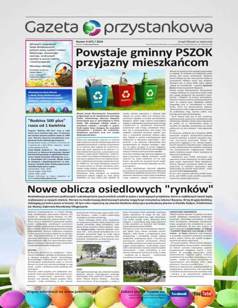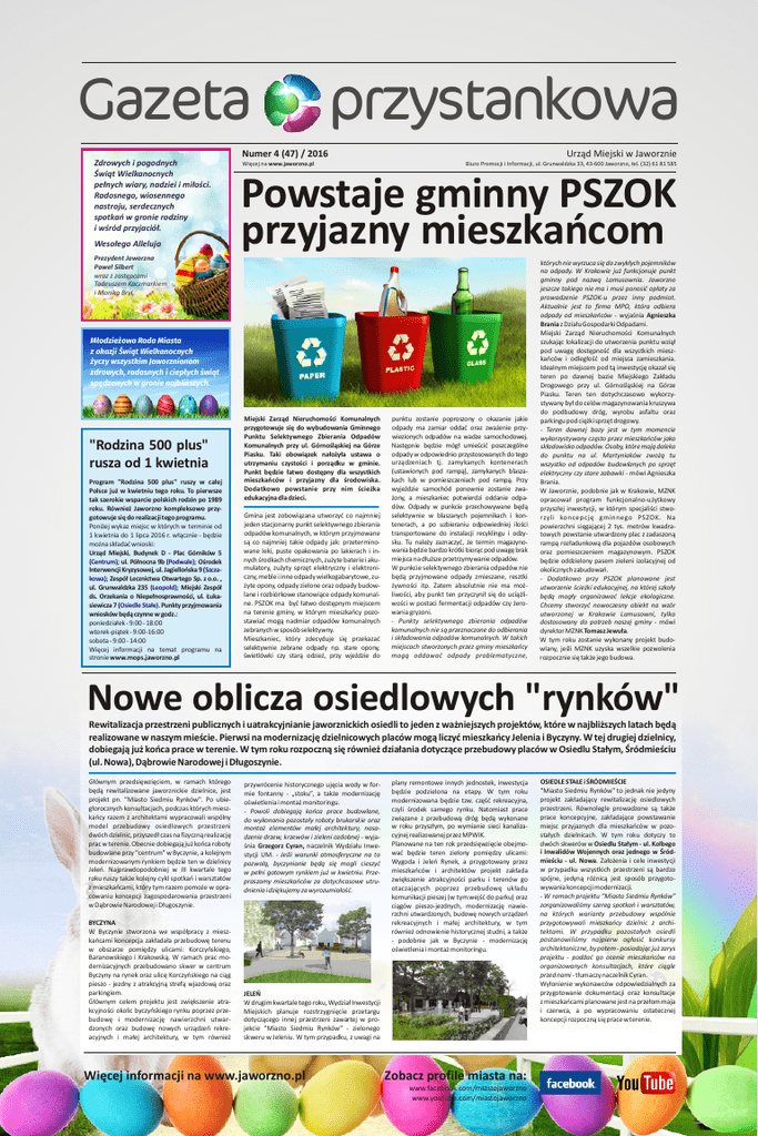 Gazeta Zdrowych i pogodnych Świąt Wielkanocnych pełnych wiary, nadziei i miłości. Radosnego, wiosennego nastroju, serdecznych spotkań w gronie rodziny i wśród przyjaciół. Wesołego Alleluja przystankowa Urząd Miejski w Jaworznie Numer 4 (47) / 2016 Więcej na www.jaworzno.pl Biuro Promocji i Informacji, ul. Grunwaldzka 33, 43-600 Jaworzno, tel. (32) 61 81 585 Powstaje gminny PSZOK przyjazny mieszkańcom Prezydent Jaworzna Paweł Silbert wraz z zastępcami Tadeuszem Kaczmarkiem i Moniką Bryl Młodzieżowa Rada Miasta z okazji Świąt Wielkanocnych życzy wszystkim Jaworznianom zdrowych, radosnych i ciepłych świąt spędzonych w gronie najbliższych. "Rodzina 500 plus" rusza od 1 kwietnia Program "Rodzina 500 plus" ruszy w całej Polsce już w kwietniu tego roku. To pierwsze tak szerokie wsparcie polskich rodzin po 1989 roku. Również Jaworzno kompleksowo przygotowuje się do realizacji tego programu. Poniżej wykaz miejsc w których w terminie od 1 kwietnia do 1 lipca 2016 r. włącznie - będzie można składać wnioski: Urząd Miejski, Budynek D - Plac Górników 5 (Centrum); ul. Północna 9b (Podwale); Ośrodek Interwencji Kryzysowej, ul. Jagiellońska 9 (Szczakowa); Zespół Lecznictwa Otwartego Sp. z o.o. , ul. Grunwaldzka 235 (Leopold); Miejski Zespół ds. Orzekania o Niepełnosprawności, ul. Łukasiewicza 7 (Osiedle Stałe). Punkty przyjmowania wniosków będą czynne w godz.: poniedziałek - 9:00 - 18:00 wtorek-piątek - 9:00-16:00 sobota - 9:00 - 14:00 Więcej informacji na temat programu na stronie www.mops.jaworzno.pl Miejski Zarząd Nieruchomości Komunalnych przygotowuje się do wybudowania Gminnego Punktu Selektywnego Zbierania Odpadów Komunalnych przy ul. Górnośląskiej na Górze Piasku. Taki obowiązek nałożyła ustawa o utrzymaniu czystości i porządku w gminie. Punkt będzie łatwo dostępny dla wszystkich mieszkańców i przyjazny dla środowiska. Dodatkowo powstanie przy nim ścieżka edukacyjna dla dzieci. Gmina jest zobowiązana utworzyć co najmniej jeden stacjonarny punkt selektywnego zbierania odpadów komunalnych, w którym przyjmowane są co najmniej takie odpady jak: przeterminowane leki, puste opakowania po lakierach i innych środkach chemicznych, zużyte baterie i akumulatory, zużyty sprzęt elektryczny i elektroniczny, meble i inne odpady wielkogabarytowe, zużyte opony, odpady zielone oraz odpady budowlane i rozbiórkowe stanowiące odpady komunalne. PSZOK ma być łatwo dostępnym miejscem na terenie gminy, w którym mieszkańcy pozostawiać mogą nadmiar odpadów komunalnych zebranych w sposób selektywny. Mieszkaniec, który zdecyduje się przekazać selektywnie zebrane odpady np. stare opony, świetlówki czy starą odzież, przy wjeździe do punktu zostanie poproszony o okazanie jakie odpady ma zamiar oddać oraz zważenie przywiezionych odpadów na wadze samochodowej. Następnie będzie mógł umieścić poszczególne odpady w odpowiednio przystosowanych do tego urządzeniach tj. zamykanych kontenerach (ustawionych pod rampą), zamykanych blaszakach lub w pomieszczeniach pod rampą. Przy wyjeździe samochód ponownie zostanie zważony, a mieszkaniec potwierdzi oddanie odpadów. Odpady w punkcie przechowywane będą selektywnie w blaszanych pojemnikach i kontenerach, a po uzbieraniu odpowiedniej ilości transportowane do instalacji recyklingu i odzysku. Tu należy zaznaczyć, że termin magazynowania będzie bardzo krótki biorąc pod uwagę brak miejsca na dłuższe przetrzymywanie odpadów. W punkcie selektywnego zbierania odpadów nie będą przyjmowane odpady zmieszane, resztki żywności itp. Zatem absolutnie nie ma możliwości, aby punkt ten przyczynił się do uciążliwości w postaci fermentacji odpadów czy żerowania gryzoni. - Punkty selektywnego zbierania odpadów komunalnych nie są przeznaczone do odbierania i składowania odpadów komunalnych. W takich miejscach stworzonych przez gminy mieszkańcy mogą oddawać odpady problematyczne, których nie wyrzuca się do zwykłych pojemników na odpady. W Krakowie już funkcjonuje punkt gminny pod nazwą Lamusownia. Jaworzno jeszcze takiego nie ma i musi ponosić opłaty za prowadzenie PSZOK-u przez inny podmiot. Aktualnie jest to firma MPO, która odbiera odpady od mieszkańców - wyjaśnia Agnieszka Brania z Działu Gospodarki Odpadami. Miejski Zarząd Nieruchomości Komunalnych szukając lokalizacji do utworzenia punktu wziął pod uwagę dostępność dla wszystkich mieszkańców i odległość od miejsca zamieszkania. Idealnym miejscem pod tą inwestycję okazał się teren po dawnej bazie Miejskiego Zakładu Drogowego przy ul. Górnośląskiej na Górze Piasku. Teren ten dotychczasowo wykorzystywany był do celów magazynowania kruszywa do podbudowy dróg, wyrobu asfaltu oraz parkingu pod ciężki sprzęt drogowy. - Teren dawnej bazy jest w tym momencie wykorzystywany często przez mieszkańców jako składowisko odpadów. Osoby, które mają daleko do punktu na ul. Martyniaków zwożą tu wszystko od odpadów budowlanych po sprzęt elektryczny czy stare zabawki - mówi Agnieszka Brania. W Jaworznie, podobnie jak w Krakowie, MZNK opracował program funkcjonalno-użytkowy przyszłej inwestycji, w którym specjaliści stworzyli koncepcję gminnego PSZOK. Na powierzchni sięgającej 2 tys. metrów kwadratowych powstanie utwardzony plac z zadaszoną rampą rozładunkową dla pojazdów osobowych oraz pomieszczeniem magazynowym. PSZOK będzie oddzielony pasem zieleni izolacyjnej od okolicznych zabudowań. - Dodatkowo przy PSZOK planowane jest utworzenie ścieżki edukacyjnej, na której szkoły będą mogły organizować lekcje ekologiczne. Chcemy stworzyć nowoczesny obiekt na wzór utworzonej w Krakowie Lamusowni, tylko dostosowany do potrzeb naszej gminy - mówi dyrektor MZNK Tomasz Jewuła. W tym roku zostanie wykonany projekt budowlany, jeśli MZNK uzyska wszelkie pozwolenia rozpocznie się także jego budowa. Nowe oblicza osiedlowych "rynków" Rewitalizacja prze