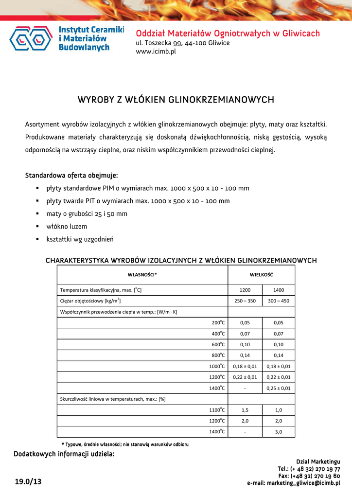 Oddział Materiałów Ogniotrwałych w Gliwicach ul. Toszecka 99, 44-100 Gliwice www.icimb.pl WYROBY Z WŁÓKIEN GLINOKRZEMIANOWYCH GLINOKRZEMIANOWYCH Asortyment wyrobów izolacyjnych z włókien glinokrzemianowych obejmuje: płyty, maty oraz kształtki. Produkowane materiały charakteryzują się doskonałą dźwiękochłonnością, niską gęstością, wysoką odpornością na wstrząsy cieplne, oraz niskim współczynnikiem przewodności cieplnej. Standardowa oferta obejmuje: płyty standardowe PIM o wymiarach max. 1000 x 500 x 10 - 100 mm płyty twarde PIT o wymiarach max. 1000 x 500 x 10 - 100 mm maty o grubości 25 i 50 mm włókno luzem kształtki wg uzgodnień CHARAKTERYSTYKA WYROBÓW WYRO BÓW IZOLACYJNYCH Z WŁÓKIEN W ŁÓKIEN GLINOKRZEMIANOWYCH GLINOKRZEMIANOWYCH WŁASNOŚCI* WIELKOŚĆ o Temperatura klasyfikacyjna, max. [ C] 1200 1400 250 – 350 300 – 450 o 0,05 0,05 o 0,07 0,07 o 0,10 0,10 o 0,14 0,14 o 0,18 ± 0,01 0,18 ± 0,01 o 0,22 ± 0,01 0,22 ± 0,01 o - 0,25 ± 0,01 o 1,5 1,0 o 2,0 2,0 o - 3,0 3 Ciężar objętościowy [kg/m ] Współczynnik przewodzenia ciepła w temp.: [W/m · K] 200 C 400 C 600 C 800 C 1000 C 1200 C 1400 C Skurczliwość liniowa w temperaturach, max.: [%] 1100 C 1200 C 1400 C * Typowe, średnie własności; nie stanowią warunków odbioru Dodatkowych informacji udziela: 19.0/13 Dział Marketingu Tel.: (+ 48 32) 270 19 77 Fax: (+48 32) 270 19 60 e- mail: [email protected] Oddział Materiałów Ogniotrwałych Ogniotrwałych w Gliwicach ul. Toszecka 99, 44-100 Gliwice www.icimb.pl WŁÓKNISTE MASY IZOLACYJNE IZOLACYJNE Włókniste masy izolacyjne WMI używane są do: izolowania powierzchni o skomplikowanych kształtach wypełniania szczelin i regeneracji zużytych wyłożeń formowania kształtek izolacyjnych lub izolacyjno – konstrukcyjnych CHARAKTERYSTYKA CHARAKTERYSTYKA MAS IZOLACYJNYCH IZOLACYJNYCH PARAMETRY UZYSKANE PO PO WYPALENIU W MAKSYMALNEJ MAKSYM ALNEJ TEMPERATURZE STOSOWANIA: S TOSOWANIA: WŁASNOŚCI* WMI 1200 WMI 1400 1200 1400 300 – 500 400 – 600 o 0,16 ± 0,01 0,25 ± 0,01 o 0,23 ± 0,01 0,27 ± 0,01 o - 0,34 ± 0,01 o 1,5 1,5 o 3,0 3,0 o - 3,5 - 4,0 o Temperatura stosowania, max. [ C] 3 Ciężar objętościowy [kg/m ] Współczynnik przewodzenia ciepła w temp.: [W/m · K] 1000 C 1200 C 1400 C Skurczliwość liniowa w temperaturach, max.: [%] 1100 C 1200 C 1400 C * Typowe, średnie własności; nie stanowią warunków odbioru Dodatkowych informacji udziela: Dział Marketingu Tel.: (+ 48 32) 270 19 77 Fax: (+48 32) 270 19 60 e- mail: [email protected]