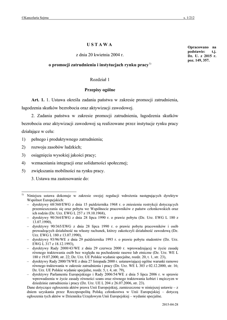©Kancelaria Sejmu s. 1/212 USTAWA Opracowano na podstawie: t.j. Dz. U. z 2015 r. poz. 149, 357. z dnia 20 kwietnia 2004 r. o promocji zatrudnienia i instytucjach rynku pracy 1) Rozdział 1 Przepisy ogólne Art. 1. 1. Ustawa określa zadania państwa w zakresie promocji zatrudnienia, łagodzenia skutków bezrobocia oraz aktywizacji zawodowej. 2. Zadania państwa w zakresie promocji zatrudnienia, łagodzenia skutków bezrobocia oraz aktywizacji zawodowej są realizowane przez instytucje rynku pracy działające w celu: 1) pełnego i produktywnego zatrudnienia; 2) rozwoju zasobów ludzkich; 3) osiągnięcia wysokiej jakości pracy; 4) wzmacniania integracji oraz solidarności społecznej; 5) zwiększania mobilności na rynku pracy. 3. Ustawa ma zastosowanie do: 1) Niniejsza ustawa dokonuje w zakresie swojej regulacji wdrożenia następujących dyrektyw Wspólnot Europejskich: – dyrektywy 68/360/EWG z dnia 15 października 1968 r. o zniesieniu restrykcji dotyczących przemieszczania się oraz pobytu we Wspólnocie pracowników z państw członkowskich oraz ich rodzin (Dz. Urz. EWG L 257 z 19.10.1968), – dyrektywy 90/364/EWG z dnia 28 lipca 1990 r. o prawie pobytu (Dz. Urz. EWG L 180 z 13.07.1990), – dyrektywy 90/365/EWG z dnia 28 lipca 1990 r. o prawie pobytu pracowników i osób prowadzących działalność na własny rachunek, którzy zakończyli działalność zawodową (Dz. Urz. EWG L 180 z 13.07.1990), – dyrektywy 93/96/WE z dnia 29 października 1993 r. o prawie pobytu studentów (Dz. Urz. EWG L 317 z 18.12.1993), – dyrektywy Rady 2000/43/WE z dnia 29 czerwca 2000 r. wprowadzającej w życie zasadę równego traktowania osób bez względu na pochodzenie rasowe lub etniczne (Dz. Urz. WE L 180 z 19.07.2000, str. 22; Dz. Urz. UE Polskie wydanie specjalne, rozdz. 20, t. 1, str. 23), – dyrektywy Rady 2000/78/WE z dnia 27 listopada 2000 r. ustanawiającej ogólne warunki ramowe równego traktowania w zakresie zatrudnienia i pracy (Dz. Urz. WE L 303 z 02.12.2000, str. 16; Dz. Urz. UE Polskie wydanie specjalne, rozdz. 5, t. 4, str. 79), – dyrektywy Parlamentu Europejskiego i Rady 2006/54/WE z dnia 5 lipca 2006 r. w sprawie wprowadzenia w życie zasady równości szans oraz równego traktowania kobiet i mężczyzn w dziedzinie zatrudnienia i pracy (Dz. Urz. UE L 204 z 26.07.2006, str. 23). Dane dotyczące ogłoszenia aktów prawa Unii Europejskiej, zamieszczone w niniejszej ustawie – z dniem uzyskania przez Rzeczpospolitą Polską członkostwa w Unii Europejskiej – dotyczą ogłoszenia tych aktów w Dzienniku Urzędowym Unii Europejskiej – wydanie specjalne. 2015-04-28 ©Kancelaria Sejmu 1) s. 2/212 obywateli polskich poszukujących i podejmujących zatrudnienie lub inną pracę zarobkową na terytorium Rzeczypospolitej Polskiej oraz zatrudnienie lub inną pracę zarobkową za granicą u pracodawców zagranicznych; 2) cudzoziemców zamierzających wykonywać lub wykonujących pracę na terytorium Rzeczypospolitej Polskiej: a) obywateli państw członkowskich Unii Europejskiej, b) obywateli państw Europejskiego Obszaru Gospodarczego nienależących do Unii Europejskiej, c) obywateli państw niebędących stronami umowy o Europejskim Obszarze Gospodarczym, którzy mogą korzystać ze swobody przepływu osób na podstawie umów zawartych przez te państwa ze Wspólnotą Europejską i jej państwami członkowskimi, d) posiadających w Rzeczypospolitej Polskiej status uchodźcy, e) posiadających w Rzeczypospolitej Polskiej zezwolenie na pobyt stały, f) posiadających w Rzeczypospolitej Polskiej zezwolenie na pobyt rezydenta długoterminowego Unii Europejskiej, g) posiadających w Rzeczypospolitej Polskiej zezwolenie na pobyt czasowy udzielone w związku z okolicznościami, o których mowa w art. 127, art. 151 ust. 1 lub 2 lub art. 186 ust. 1 pkt 3 ustawy z dnia 12 grudnia 2013 r. o cudzoziemcach (Dz. U. poz. 1650 oraz z 2014 r. poz. 463 i 1004), h) posiadających w Rzeczypospolitej Polskiej zezwolenie na pobyt czasowy udzielone w związku z okolicznościami, o których mowa w art. 144, art. 159 ust. 1, art. 160, art. 161, art. 176, art. 186 ust. 1 pkt 1, 2, 4 i 5 lub art. 187 ustawy z dnia 12 grudnia 2013 r. o cudzoziemcach, ha) posiadających zezwolenie na pobyt czasowy, o którym mowa w art. 114 ust. 1 albo art. 126 ust. 1, albo wizę wydaną w celu wykonywania pracy na terytorium Rzeczypospolitej Polskiej, i) posiadających w Rzeczypospolitej Polskiej zgodę na pobyt ze względów humanitarnych lub zgodę na pobyt tolerowany, j) korzystających w Rzeczypospolitej Polskiej z ochrony czasowej, k) ubiegających się w Rzeczypospolitej Polskiej o nadanie statusu uchodźcy i małżonków, w imieniu których występują z wnioskiem o nadanie statusu uchodźcy, którzy posiadają zaświadczenie wydane na podstawie art. 36 ustawy z dnia 13 czerwca 2003 r. o udzielaniu cudzoziemcom ochrony na 2015-04-28 ©Kancelaria Sejmu s. 3/212 terytorium Rzeczypospolitej Polskiej (Dz. U. z 2012 r. poz. 680, z 2013 r. poz. 1650 oraz z 2014 r. poz. 1004), l) 3) którym udzielono ochrony uzupełniającej w Rzeczypospolitej Polskiej; cudzoziemców – członków rodzin cudzoziemców, o których mowa w pkt 2 lit. a–c; 4) cudzoziemców – członków rodzin obywateli polskich, którzy uzyskali zezwolenie na pobyt czasowy na terytorium Rzeczypospolitej Polskiej albo po złożeniu wniosku o udzielenie zezwolenia na pobyt czasowy, zezwolenia na pobyt stały lub zezwolenia na pobyt rezydenta długoterminowego Unii Europejskiej przebywają na terytorium Rzeczypospolitej Polskiej na podstawie art. 108 ust. 1 pkt 2 lub art. 206 ust. 1 pkt 2 ustawy z dnia 12 grudnia 2013 r. o cudzoziemcach lub na podstawie umieszczonego w dokumencie podróży odcisku stempla, który potwierdza złożenie wniosku o udzielenie zezwolenia na pobyt rezydenta długoterminowego Unii Europejskiej, jeżeli bezpośrednio przed złożeniem wniosku o udzielenie zezwolenia na pobyt czasowy, zezwolenia na pobyt stały lub zezwolenia na
