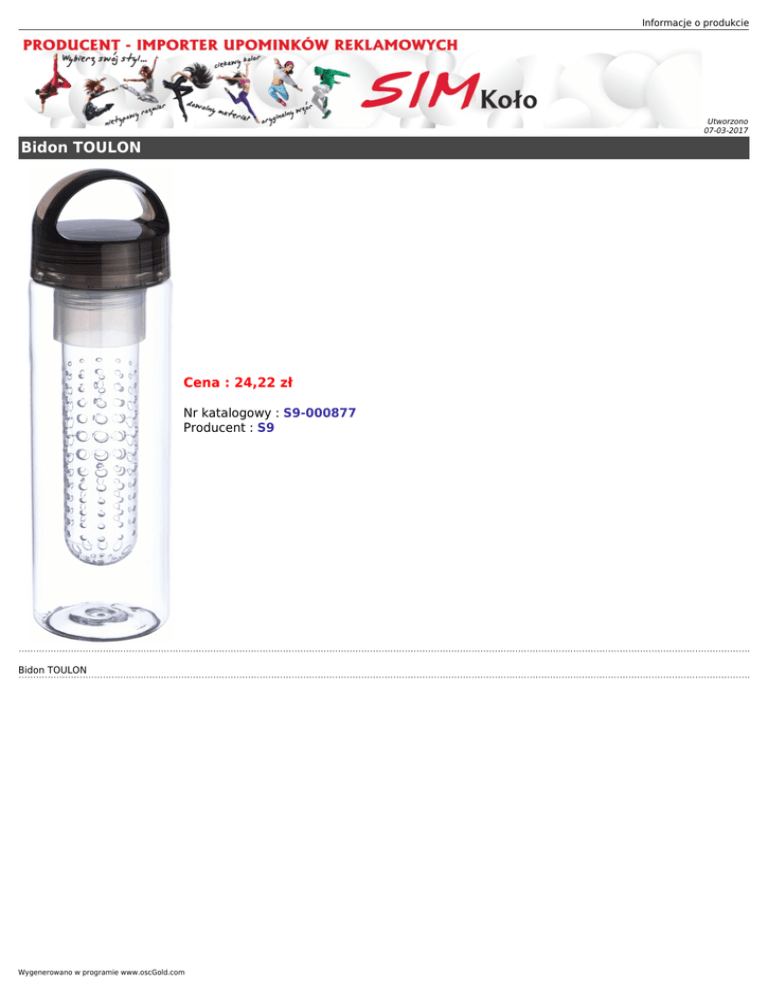 Informacje o produkcie Utworzono 07-03-2017 Bidon TOULON Cena : 24,22 zł Nr katalogowy : S9-000877 Producent : S9 Bidon TOULON Wygenerowano w programie www.oscGold.com