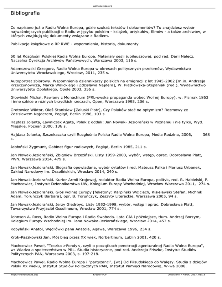 wolnaeuropa.org Bibliografia Co napisano już o Radiu Wolna Europa, gdzie szukać tekstów i dokumentów? Tu znajdziesz wybór najważniejszych publikacji o Radiu w języku polskim - książek, artykułów, filmów - a także archiwów, w których znajdują się dokumenty związane z Radiem. Publikacje książkowe o RP RWE - wspomnienia, historia, dokumenty 50 lat Rozgłośni Polskiej Radia Wolna Europa. Materiały sesji jubileuszowej, pod red. Darii Nałęcz, Naczelna Dyrekcja Archiwów Państwowych, Warszawa 2003, 116 s. Adamczewski Grzegorz, Radio Wolna Europa w okresach politycznych przełomów, Wydawnictwo Uniwersytetu Wrocławskiego, Wrocław, 2011, 235 s. Autoportret zbiorowy. Wspomnienia dziennikarzy polskich na emigracji z lat 1945-2002 [m.in. Andrzeja Krzeczunowicza, Marka Walickiego i Zdzisława Najdera], W. Piątkowska-Stepaniak (red.), Wydawnictwo Uniwersytetu Opolskiego, Opole 2003, 356 s. Głowiński Michał, Pawiany z Monachium (PRL-owska propaganda wobec Wolnej Europy), w: Pismak 1863 i inne szkice o różnych brzydkich rzeczach, Open, Warszawa 1995, 206 s. Grotowicz Wiktor, Oleś Stanisław [Załuski Piotr], Czy Polaków stać na optymizm? Rozmowy ze Zdzisławem Najderem, Pogląd, Berlin 1988, 103 s. Hajdasz Jolanta, Ławniczak Agata, Polak z oddali: Jan Nowak- Jeziorański w Poznaniu i nie tylko, Wyd. Miejskie, Poznań 2000, 136 s. Hajdasz Jolanta, Szczekaczka czyli Rozgłośnia Polska Radia Wolna Europa, Media Rodzina, 2006, s. 368 Jabłoński Zygmunt, Gabinet figur radiowych, Pogląd, Berlin 1985, 211 s. Jan Nowak-Jeziorański, Zbigniew Brzeziński. Listy 1959-2003, wybór, wstęp, oprac. Dobrosława Platt, PWN, Warszawa 2014, 479 s. Jan Nowak-Jeziorański. Biografia opowiadana, wybór cytatów i red. Mateusz Palka i Mariusz Urbanek, Zakład Narodowy im. Ossolińskich, Wrocław 2014, 240 s. Jan Nowak-Jeziorański. Kurier Armii Krajowej, redaktor Radia Wolna Europa, polityk, red. R. Habielski, P. Machcewicz, Instytut Dziennikarstwa UW, Kolegium Europy Wschodniej, Wrocław-Warszawa 2011, 274 s. Jan Nowak-Jeziorański. Głos wolnej Europy [felietony: Karpiński Wojciech, Kisielewski Stefan, Michnik Adam, Toruńczyk Barbara], opr. B. Toruńczyk, Zeszyty Literackie, Warszawa 2005, 94 s. Jan Nowak-Jeziorański, Jerzy Giedroyc. Listy 1952-1998, wybór, wstęp i oprac. Dobrosława Platt, Towarzystwo Przyjaciół Ossolineum, Wrocław 2001, 774 s. Johnson A. Ross, Radio Wolna Europa i Radio Swoboda. Lata CIA i późniejsze, tłum. Andrzej Borzym, Kolegium Europy Wschodniej im. Jana Nowaka-Jeziorańskiego, Wrocław 2014, 457 s. Kobyliński Anatol, Wędrówki pana Anatola, Agawa, Warszawa 1996, 234 s. Krok-Paszkowski Jan, Mój bieg przez XX wiek, Norbertinum, Lublin 2001, 420 s. Machcewicz Paweł, "Teczka >Fondy<, czyli o początkach penetracji agenturalnej Radia Wolna Europa", w: Władza a społeczeństwo w PRL. Studia historyczne, pod red. Andrzeja Friszke, Instytut Studiów Politycznych PAN, Warszawa 2003, s. 197-218. Machcewicz Paweł, Radio Wolna Europa i "partyzanci", [w:] Od Piłsudskiego do Wałęsy. Studia z dziejów Polski XX wieku, Instytut Studiów Politycznych PAN, Instytut Pamięci Narodowej, W-wa 2008. http://wolnaeuropa.org Kreator PDF Utworzono 7 March, 2017, 01:13 wolnaeuropa.org Machcewicz Paweł, "Monachijska menażeria". Walka z Radiem Wolna Europa 1950-1989, Instytut Pamięci Narodowej, Instytut Studiów Politycznych PAN, Warszawa 2007, 443 s. Machcewicz Paweł, Radio Wolna Europa wobec wydarzeń w Polsce i na Węgrzech jesienią 1956 roku, [w:] Październik 1956. Początek erozji systemu, red. M. Jabłonowski, S. Stępka, Pułtusk 2007. Machcewicz Paweł, Emigracja w polityce międzynarodowej, Druga Wielka Emigracja 1945-1990, T. II [rozdział o RWE], Biblioteka Więzi, Warszawa 1999, 262 s. Maj 2012 miesiącem Rozgłośni Polskiej Radia Wolna Europa, Kancelaria Senatu, Warszawa 2012, 64 s. Nowak-Jeziorański Jan, Wojna w eterze, Znak, Kraków 2005, 711 s. PRL atakuje Radio Wolna Europa. Teksty, rysunki i karykatury z prasy, radia, telewizji i wydawnictw książkowych, wybór i wstęp Alina Grabowska, Towarzystwo Przyjaciół Ossolineum, Wrocław 2002, 144 s. Puddington Arch, Rozgłośnie wolności. Tryumf Radia Wolna Europa i Radia Swoboda w zimnej wojnie, tłum. Andrzej Borzym, Uniwersytet Mikołaja Kopernika, Toruń 2009, s. 422. czytaj Radio Wolna Europa w polityce polskiej i zachodniej. Materiały konferencji naukowej Warszawa 30.11. 1.12.2007, red. Andrzej Borzym i Jeremi Sadowski, Stowarzyszenie Wolnego Słowa, Warszawa 2009, s. 221. do pobrania tutaj Rozpędowski Henryk, Był chamsin, Aneks, Londyn 1994, 288 s. Semelin Jacques, Wolność w eterze, UMCS, Lublin 1999, 330 s. Sokopp Edward M., Pisane na kolanie: pamiętnik bez patosu, Antyk, Warszawa, Komorów 1997, 353 s. Tatarowski Konrad W., Literatura i pisarze w programie Rozgłośni Polskiej Radia Wolna Europa, Universitas, Kraków 2005, 322 s. + CD. Tatarowski Konrad W., Aksjologia i polityka w pisarstwie i działalności Jana Nowaka-Jeziorańskiego, Wydawnictwo Uniwersytetu Łódzkiego, Łódź 2010, 265 s. Tyszkiewicz Jakub, Otwarte okno w żelaznej kurtynie. Polityka administracji prezydenta Eisenhowera wobec Polski (październik 1956-styczeń 1961), Wrocław 2003, s. 368. Tyszkiewicz Jan, Gwiazdy i melodie. Arystokrata bez krawata, Świat Książki, Warszawa 2006, 351 s. Unger Leopold, Intruz [rozdział o RWE], Prószyński i S-ka, Warszawa 2001, 408 s. Urban George R., Radio Wolna Europa i walka o demokrację. Moja wojna w czasach zimnej wojny, tłum. Maciej Antosiewicz, Prószyński i S-ka, Warszawa 2000, 285 s. czytaj Wejs-Milewska Violetta, Radio Wolna Europa na emigracyjnych szlakach pisarzy: Gustaw HerlingGrudziński, Tadeusz Nowakowski, Roman Palester, Czesław Straszewicz, Tymon Terlecki, Arcana, Kraków 2008, 762 s. Wokół Rozgłośni Polskiej Radia Wolna Europa. Materiały konferencji naukowej, pod red. Władysława Stępniaka, Naczelna Dyrekcja Archiwów Państwowych, Warszawa 2