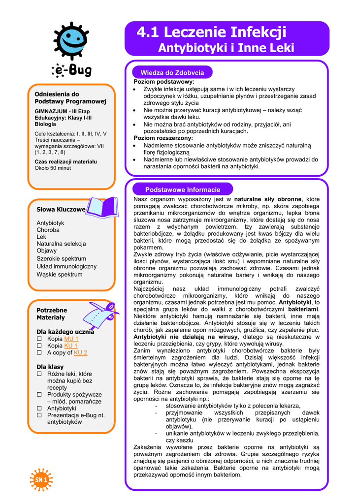 4.1 Leczenie Infekcji Antybiotyki i Inne Leki Wiedza do Zdobycia Odniesienia do Podstawy Programowej GIMNAZJUM - III Etap Edukacyjny: Klasy I-III Biologia Cele kształcenia: I, II, III, IV, V Treści nauczania – wymagania szczegółowe: VII (1, 2, 3, 7, 8) Czas realizacji materiału Około 50 minut Poziom podstawowy: Zwykłe infekcje ustępują same i w ich leczeniu wystarczy odpoczynek w łóżku, uzupełnianie płynów i przestrzeganie zasad zdrowego stylu życia Nie można przerywać kuracji antybiotykowej – należy wziąć wszystkie dawki leku. Nie można brać antybiotyków od rodziny, przyjaciół, ani pozostałości po poprzednich kuracjach. Poziom rozszerzony: Nadmierne stosowanie antybiotyków może zniszczyć naturalną florę fizjologiczną Nadmierne lub niewłaściwe stosowanie antybiotyków prowadzi do narastania oporności bakterii na antybiotyki. Podstawowe Informacje Słowa Kluczowe Antybiotyk Choroba Lek Naturalna selekcja Objawy Szerokie spektrum Układ immunologiczny Wąskie spektrum Zakażenie Potrzebne Materiały Dla każdego ucznia Kopia MU 1 Kopia KU 1 A copy of KU 2 Dla klasy Różne leki, które można kupić bez recepty Produkty spożywcze – miód, pomarańcze Antybiotyki Prezentacja e-Bug nt. antybiotyków Nasz organizm wyposażony jest w naturalne siły obronne, które pomagają zwalczać chorobotwórcze mikroby, np. skóra zapobiega przenikaniu mikroorganizmów do wnętrza organizmu, lepka błona śluzowa nosa zatrzymuje mikroorganizmy, które dostają się do nosa razem z wdychanym powietrzem, łzy zawierają substancje bakteriobójcze, w żołądku produkowany jest kwas bójczy dla wielu bakterii, które mogą przedostać się do żołądka ze spożywanym pokarmem. Zwykle zdrowy tryb życia (właściwe odżywianie, picie wystarczającej ilości płynów, wystarczająca ilość snu) i wspomniane naturalne siły obronne organizmu pozwalają zachować zdrowie. Czasami jednak mikroorganizmy pokonują naturalne bariery i wnikają do naszego organizmu. Najczęściej nasz układ immunologiczny potrafi zwalczyć chorobotwórcze mikroorganizmy, które wnikają do naszego organizmu, czasami jednak potrzebna jest mu pomoc. Antybiotyki, to specjalna grupa leków do walki z chorobotwórczymi bakteriami. Niektóre antybiotyki hamują namnażanie się bakterii, inne mają działanie bakteriobójcze. Antybiotyki stosuje się w leczeniu takich chorób, jak zapalenie opon mózgowych, gruźlica, czy zapalenie płuc. Antybiotyki nie działają na wirusy, dlatego są nieskuteczne w leczeniu przeziębienia, czy grypy, które wywołują wirusy. Zanim wynaleziono antybiotyki chorobotwórcze bakterie były śmiertelnym zagrożeniem dla ludzi. Dzisiaj większość infekcji bakteryjnych można łatwo wyleczyć antybiotykami, jednak bakterie znów stają się poważnym zagrożeniem. Powszechna ekspozycja bakterii na antybiotyki sprawia, że bakterie stają się oporne na tę grupę leków. Oznacza to, że infekcje bakteryjne znów mogą zagrażać życiu. Rożne zachowania pomagają zapobiegają szerzeniu się oporności na antybiotyki np.: - stosowanie antybiotyków tylko z polecenia lekarza, - przyjmowanie wszystkich przepisanych dawek antybiotyku (nie przerywanie kuracji po ustąpieniu objawów), - unikanie antybiotyków w leczeniu zwykłego przeziębienia, czy kaszlu Zakażenia wywołane przez bakterie oporne na antybiotyki są poważnym zagrożeniem dla zdrowia. Grupie szczególnego ryzyka znajdują się pacjenci o obniżonej odporności, u nich znacznie trudniej opanować takie zakażenia. Bakterie oporne na antybiotyki mogą przekazywać oporność innym bakteriom. 4.1 Antybiotyki i Inne Leki Potrzebne Będą... (30 min) 1. Przygotuj różne rzeczy, które kojarzą się z lekami, lub uważane są za leki, np. Środki przeciwbólowe, aspirynę, środki na kaszel i przeziębienie, miód, antybiotyki, kremy antyseptyczne, miętę, sok pomarańczowy, czosnek, imbir, napoje probiotyczne itd. 2. Ściągnij prezentację nt. antybiotyków i antybiotykooporności ze strony www.e-bug.eu. Wprowadzenie (15 min) 1. 2. 3. 4. 5. Rozłóż przygotowane leki i żywność na ławce. Zapytaj uczniów, które z tych produktów są lekami. Wyjaśnij, że leki zdefiniowano jako: substancja pochodzenia naturalnego lub syntetycznego, wprowadzana do organizmu w celu podtrzymania zdrowia, zapobiegania chorobie, złagodzenia jej objawów, lub wyleczenia jej. Poproś uczniów, aby podzielili zgromadzone przedmioty na dwie grupy: jedną środków, które uważająca leki, drugą, które uważają, że nie są to leki. Uczniowie najprawdopodobniej oddzielą środki chemiczne od żywnościowych. Wytłumacz, że wiele produktów spożywczych może również mieć działanie lecznicze (miód używany jest jako środek przeciwbakteryjny, i wiele osób wierzy, że pomaga w leczeniu zapalenia gardła, mięta wspomaga trawienie, imbir i czosnek mają również działanie przeciwbakteryjne, sok pomarańczowy zawiera duże ilości witaminy C). Te naturalne produkty spożywcze o działaniu leczniczym wchodzi w skład wielu leków. Wytłumacz uczniom, że zdrowa dieta pomaga zapobiec chorobom i uniknąć wizyty u lekarza, np. regularne jedzenie owoców i warzyw zawierających witaminę C obniża ryzyko przeziębienia. Podkreśl, że leki powinny być stosowane tylko w leczeniu choroby, na którą zostały przepisane. Zapytaj uczniów, jak im się wydaje, kiedy powinniśmy stosować antybiotyki. Wyjaśnij, że antybiotyki stosujemy WYŁĄCZNIE w leczeniu zakażeń bakteryjnych i nie są skuteczne w leczeniu zakażeń wirusowych, czy grzybiczych. Na stronie www.e-bug.eu dostępna jest prezentacja nt. odkrycia antybiotyków i zjawiska antybiotykooporności. Ćwiczenie Podstawowe (25 min) 1. 2. 3. 4. Ćwiczenie przewidziane jest dla małych 3-5 osobowych grup uczniów. Rozdaj uczniom kopie MU 1, KU 1 i KU 2. Historyjkę przedstawiona w MU 1 można przeczytać przed całą klasą, wyświetlić rzutnikiem na tablicy, 