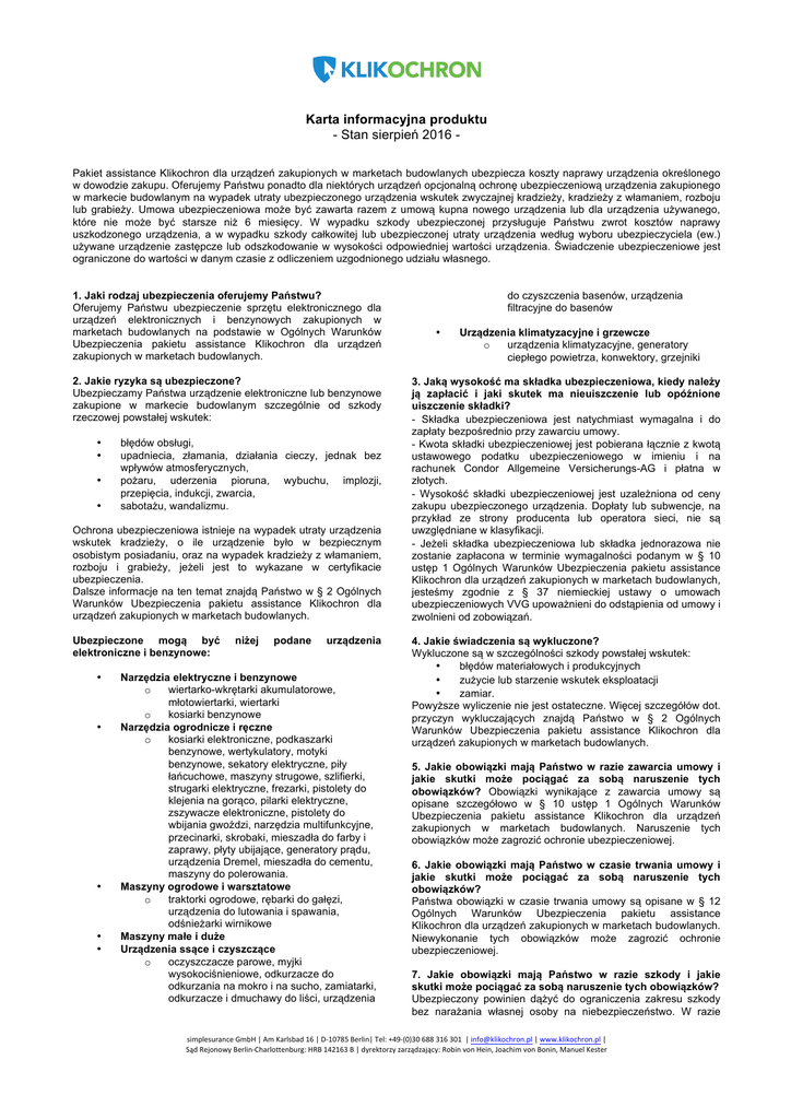 Karta informacyjna produktu - Stan sierpień 2016 Pakiet assistance Klikochron dla urządzeń zakupionych w marketach budowlanych ubezpiecza koszty naprawy urządzenia określonego w dowodzie zakupu. Oferujemy Państwu ponadto dla niektórych urządzeń opcjonalną ochronę ubezpieczeniową urządzenia zakupionego w markecie budowlanym na wypadek utraty ubezpieczonego urządzenia wskutek zwyczajnej kradzieży, kradzieży z włamaniem, rozboju lub grabieży. Umowa ubezpieczeniowa może być zawarta razem z umową kupna nowego urządzenia lub dla urządzenia używanego, które nie może być starsze niż 6 miesięcy. W wypadku szkody ubezpieczonej przysługuje Państwu zwrot kosztów naprawy uszkodzonego urządzenia, a w wypadku szkody całkowitej lub ubezpieczonej utraty urządzenia według wyboru ubezpieczyciela (ew.) używane urządzenie zastępcze lub odszkodowanie w wysokości odpowiedniej wartości urządzenia. Świadczenie ubezpieczeniowe jest ograniczone do wartości w danym czasie z odliczeniem uzgodnionego udziału własnego. 1. Jaki rodzaj ubezpieczenia oferujemy Państwu? Oferujemy Państwu ubezpieczenie sprzętu elektronicznego dla urządzeń elektronicznych i benzynowych zakupionych w marketach budowlanych na podstawie w Ogólnych Warunków Ubezpieczenia pakietu assistance Klikochron dla urządzeń zakupionych w marketach budowlanych. 2. Jakie ryzyka są ubezpieczone? Ubezpieczamy Państwa urządzenie elektroniczne lub benzynowe zakupione w markecie budowlanym szczególnie od szkody rzeczowej powstałej wskutek: • • • • błędów obsługi, upadniecia, złamania, działania cieczy, jednak bez wpływów atmosferycznych, pożaru, uderzenia pioruna, wybuchu, implozji, przepięcia, indukcji, zwarcia, sabotażu, wandalizmu. Ochrona ubezpieczeniowa istnieje na wypadek utraty urządzenia wskutek kradzieży, o ile urządzenie było w bezpiecznym osobistym posiadaniu, oraz na wypadek kradzieży z włamaniem, rozboju i grabieży, jeżeli jest to wykazane w certyfikacie ubezpieczenia. Dalsze informacje na ten temat znajdą Państwo w § 2 Ogólnych Warunków Ubezpieczenia pakietu assistance Klikochron dla urządzeń zakupionych w marketach budowlanych. Ubezpieczone mogą być elektroniczne i benzynowe: • • • • • niżej podane urządzenia Narzędzia elektryczne i benzynowe o wiertarko-wkrętarki akumulatorowe, młotowiertarki, wiertarki o kosiarki benzynowe Narzędzia ogrodnicze i ręczne o kosiarki elektroniczne, podkaszarki benzynowe, wertykulatory, motyki benzynowe, sekatory elektryczne, piły łańcuchowe, maszyny strugowe, szlifierki, strugarki elektryczne, frezarki, pistolety do klejenia na gorąco, pilarki elektryczne, zszywacze elektroniczne, pistolety do wbijania gwoździ, narzędzia multifunkcyjne, przecinarki, skrobaki, mieszadła do farby i zaprawy, płyty ubijające, generatory prądu, urządzenia Dremel, mieszadła do cementu, maszyny do polerowania. Maszyny ogrodowe i warsztatowe o traktorki ogrodowe, rębarki do gałęzi, urządzenia do lutowania i spawania, odśnieżarki wirnikowe Maszyny małe i duże Urządzenia ssące i czyszczące o oczyszczacze parowe, myjki wysokociśnieniowe, odkurzacze do odkurzania na mokro i na sucho, zamiatarki, odkurzacze i dmuchawy do liści, urządzenia do czyszczenia basenów, urządzenia filtracyjne do basenów • Urządzenia klimatyzacyjne i grzewcze o urządzenia klimatyzacyjne, generatory ciepłego powietrza, konwektory, grzejniki 3. Jaką wysokość ma składka ubezpieczeniowa, kiedy należy ją zapłacić i jaki skutek ma nieuiszczenie lub opóźnione uiszczenie składki? - Składka ubezpieczeniowa jest natychmiast wymagalna i do zapłaty bezpośrednio przy zawarciu umowy. - Kwota składki ubezpieczeniowej jest pobierana łącznie z kwotą ustawowego podatku ubezpieczeniowego w imieniu i na rachunek Condor Allgemeine Versicherungs-AG i płatna w złotych. - Wysokość składki ubezpieczeniowej jest uzależniona od ceny zakupu ubezpieczonego urządzenia. Dopłaty lub subwencje, na przykład ze strony producenta lub operatora sieci, nie są uwzględniane w klasyfikacji. - Jeżeli składka ubezpieczeniowa lub składka jednorazowa nie zostanie zapłacona w terminie wymagalności podanym w § 10 ustęp 1 Ogólnych Warunków Ubezpieczenia pakietu assistance Klikochron dla urządzeń zakupionych w marketach budowlanych, jesteśmy zgodnie z § 37 niemieckiej ustawy o umowach ubezpieczeniowych VVG upoważnieni do odstąpienia od umowy i zwolnieni od zobowiązań. 4. Jakie świadczenia są wykluczone? Wykluczone są w szczególności szkody powstałej wskutek: • błędów materiałowych i produkcyjnych • zużycie lub starzenie wskutek eksploatacji • zamiar. Powyższe wyliczenie nie jest ostateczne. Więcej szczegółów dot. przyczyn wykluczających znajdą Państwo w § 2 Ogólnych Warunków Ubezpieczenia pakietu assistance Klikochron dla urządzeń zakupionych w marketach budowlanych. 5. Jakie obowiązki mają Państwo w razie zawarcia umowy i jakie skutki może pociągać za sobą naruszenie tych obowiązków? Obowiązki wynikające z zawarcia umowy są opisane szczegółowo w § 10 ustęp 1 Ogólnych Warunków Ubezpieczenia pakietu assistance Klikochron dla urządzeń zakupionych w marketach budowlanych. Naruszenie tych obowiązków może zagrozić ochronie ubezpieczeniowej. 6. Jakie obowiązki mają Państwo w czasie trwania umowy i jakie skutki może pociągać za sobą naruszenie tych obowiązków? Państwa obowiązki w czasie trwania umowy są opisane w § 12 Ogólnych Warunków Ubezpieczenia pakietu assistance Klikochron dla urządzeń zakupionych w marketach budowlanych. Niewykonanie tych obowiązków może zagrozić ochronie ubezpieczeniowej. 7. Jakie obowiązki mają Państwo w razie szkody i jakie skutki może pociągać za sobą naruszenie tych obowiązków? Ubezpieczony powinien dążyć do ograniczenia zakresu szkody bez narażania własnej osoby na niebezpieczeństwo. W razie simplesuranceGmbH|AmKarlsba