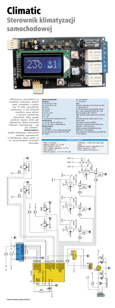 Climatic Sterownik klimatyzacji samochodowej Klimatyzacja samochodowa to urządzenie podnoszące komfort jazdy, szczególnie w upalne dni. W wielu samochodach zastosowany w niej sterownik umożliwia pracę jedynie z ręcznym ustawianiem parametrów. Pełną wygodę uzyskamy dopiero wtedy, gdy klimatyzacja będzie pracowała całkowicie automatycznie – tak jak „Climatic”. Rekomendacje: projekt dedykujemy właścicielom pojazdów wyposażonych w klimatyzację, którzy gotowi są na unowocześnienie konstrukcji sterownika. Schemat ideowy układu Climatic WYKAZ ELEMENTÓW Rezystory R1, R3, R5, R7: 2,2 kV R2, R4, R6, R8: 4,7 kV R9: 22 kV R10: 3,3 kV R11: 910 V R12, R13: 270 V R14: 1,2 kV R15: 1 kV P1: potencjometr montażowy 10 kV Kondensatory C1, C3, C5: 100 nF, ceramiczny C2, C4: 100 mF/25 V, elektrolityczny Półprzewodniki U1: ATmega8 U2: DS18S20 (+2 szt. przyłączone do magistrali za pośrednictwem złącza OUT/END) U3: 78L05 D1...D4: 1N4148 T1...T4: BC547 Inne DISPLAY: wyświetlacz LCD Artronic 6x1 BIG L1: dławik 100 mH FT: filtr EMI Murata typu DSS306–55F223 REL1...REL3: przekaźnik HFKW–012–1ZW REL4: przekaźnik JRC–27F/012S PWR: gniazdo męskie kątowe 4–pin (NSL25– 4W) OUT/ENG: gniazdo męskie kątowe 3–pin (NSL25–3W) CON: złącze śrubowe AK500/7 UP, AUTO: przełącznik podświetlany typu PB6149L–1–102 (czerwony) DOWN: przełącznik podświetlany typu PB6149L–4–102 (niebieski) ECO: przełącznik podświetlany typu PB6149L– 3–102 (zielony) PODSTAWOWE PARAMETRY • Płytka o wymiarach • Napięcie zasilania: 12...15 VDC • Prąd obciążenia: 100 mA • Zakres regulacji temperatury: 15...25°C • Skok regulacji: 1°C • Histereza regulacji: –1,0/+1,5°C dla trybu schładzania, –1,5/0,0°C dla trybu ogrzewania • Dokładność pomiaru temperatury: 0,5°C • Zakres pomiarowy: 0...99°C • Liczba punktów pomiarowych: 3