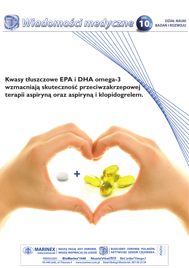 10 Kwasy tłuszczowe EPA i DHA omega-3 wzmacniają skuteczność przeciwzakrzepowej terapii aspiryną oraz aspiryną i klopidogrelem. NASZĄ PASJĄ JEST ZDROWIE, NASZĄ INSPIRACJĄ SĄ LUDZIE PRODUCENT: 93-446 Łódź, ul. Placowa 4 www.marinex.com.pl BUDUJEMY ZDROWIE POLAKÓW, AKTYWUJĄC GENOM CZŁOWIEKA. Dział Obsługi Klienta tel.: 801 00 25 50 MARINEX INTERNATIONAL OPIERAMY SIĘ NA FAKTACH NAUKOWYCH Kwasy tłuszczowe EPA i DHA omega-3 wzmacniają skuteczność przeciwzakrzepowej terapii aspiryną oraz aspiryną i klopidogrelem. Wyniki dwóch najnowszych badań klinicznych opublikowanych w prestiżowym czasopiśmie medycznym Journal of American College of Cardiology jednoznacznie pokazują, że kwasy EPA + DHA omega-3 stanową niezbędny składnik żywieniowy w terapii przeciwzakrzepowej. Wzmacniają one skuteczność działania leków takich jak aspiryna i klopidogrel, ograniczają ich niekorzystne działania uboczne dodatkowo uruchamiając w organizmie szereg prozdrowotnych mechanizmów przeciwmiażdżycowych, przeciwzapalnych i antyarytmicznych. Aspiryna (kwas acetylosalicylowy) od wielu lat stosowana jest w chorobach układu krążenia jako podstawowy lek o działaniu przeciwpłytkowym, obniżającym nadmierną krzepliwość krwi (zapobiega zakrzepom). Wyniki dziesiątek badań obejmujących w sumie wiele tysięcy pacjentów kardiologicznych wskazują jednak, że nawet do 40% z nich może wykazywać oporność na działanie standardowej dawki (75mg) aspiryny, przez co jej przyjmowanie może nie przynosić żadnych efektów6, 7, 8, 9, 10, 11. Oporni pacjenci nie zdają sobie sprawy, że stosują lek w dawce która na nich nie działa, przez co ich zdrowie i życie, mimo przyjmowania leku, jest dalej zagrożone. Na istotne znaczenie zjawiska oporności na leki przeciwpłytkowe zwraca uwagę również Polskie Towarzystwo Kardiologiczne12. Omega-3 chronią serce i układ krążenia przed Jedynym wyjściem stosowanym do tej pory przez negatywnymi skutkami stosowania leków. lekarzy w przypadku takich pacjentów było znaczne zwiększenie dawki leku. Skutkowało to co prawda podniesieniem skuteczności terapii, niestety pojawiały się dotkliwe skutki uboczne przyjmowania dużych dawek aspiryny, przede wszystkim uszkodzenia błony śluzowej żołądka mogące prowadzić do choroby wrzodowej. W świetle najnowszych badań naukowych, okazuje się, że istnieje inne znacznie skuteczniejsze i mniej dotkliwe rozwiązanie problemu braku skuteczności stosowania standardowej dawki aspiryny. Informacje przeznaczone dla specjalistów i personelu medycznego MARINEX INTERNATIONAL OPIERAMY SIĘ NA FAKTACH NAUKOWYCH Wyniki badania naukowców z USA i Izraela1 pokazują, że najlepszym wyjściem dla pacjentów opornych na działanie aspiryny jest włączenie do standardowej terapii, odpowiedniej ilości kwasów tłuszczowych EPA + DHA omega-3, zamiast wielokrotnego podnoszenia dawki stosowanego leku. Skuteczność przeciwpłytkowej terapii skojarzonej polegającej na stosowaniu standardowej dawki aspiryny 75 mg w połączeniu z 2,4 grama kwasów EPA + DHA omega-3 dziennie jest znacznie wyższa niż nawet 4-krotne zwiększenie ilości przyjmowanej aspiryny. W przytoczonym badaniu wzięło udział 30 pacjentów ze stabilną chorobą wieńcową, wykazujących oporność na działanie aspiryny w dawce 75 mg. Pacjenci podzieleni zostali na dwie podgrupy, z których pierwsza przez okres miesiąca otrzymywała 75 mg aspiryny i 2,4 grama EPA + DHA omega-3 (4 kapsułki), druga zaś przyjmowała jedynie aspirynę w dawce zwiększonej do 325 mg. U wszystkich osób, przed jak i po zakończeniu badania, przeprowadzono testy badające reaktywność agregacyjną (krzepliwość) płytek krwi oraz stężenie tromboksanu B2 w osoczu (stabilny metabolit tromboksanu A2) będące również odzwierciedleniem aktywności płytek krwi. WYNIKI Okazało się, że u osób przyjmujących aspirynę i kwasy tłuszczowe EPA + DHA omega-3 odnotowano średni spadek zdolności agregacyjnych (krzepliwości) płytek na poziomie 20%, podczas gdy w grupie przyjmującej 4-krotnie zwiększoną dawkę samej aspiryny, spadek ten wyniósł jedynie 14%. Badanie stężenia tromboksanu B2 (TXB2) w osoczu ujawniło jeszcze korzystniejszy wpływ kwasów tłuszczowych EPA + DHA grupy omega-3 na terapię aspiryną. W grupie pacjentów stosujących aspirynę i kw. tł. omega-3 po miesięcznej terapii, uzyskano redukcję stężenia tromboksanu na poziomie 57%, w porównaniu do jedynie 40% redukcji otrzymanej po zastosowaniu samej aspiryny (325 mg). Marinex International X 2010 MARINEX INTERNATIONAL OPIERAMY SIĘ NA FAKTACH NAUKOWYCH Uzyskane wyniki pozwalają stwierdzić, że kwasy EPA + DHA omega-3 stosowane w odpowiedniej dawce pozwalają na skuteczniejsze działanie aspiryny jednocześnie uruchamiają w organizmie naturalne mechanizmy przeciwzakrzepowe. Wbudowują się w błony wszystkich komórek i oddziaływując na ekspresje genów oraz aktywność enzymów (np. COX) zmniejszają produkcję prozakrzepowych i prozapalnych czynników takich jak tromboksan A2 (TXA2) czy prostaglandyna E2 (PGE2). Zwiększają z kolei produkcję prostaglandyny E3 (PGE3), oraz rezolwin i protektyn, które są inhibitorami agregacji płytek oraz wykazują silne działania przeciwzapalne. Jak widać na podstawie przeprowadzonego badania dużo większe korzyści w zakresie ograniczania krzepliwości krwi płyną ze stosowania terapii skojarzonej. A zatem, kwasy tłuszczowe EPA + DHA omega-3 jako niezbędny składnik żywienia, powinny stanowić stały element w terapii ograniczającej krzepliwość krwi u pacjentów z chorobami układu krążenia. Potwierdzaniem powyższych wniosków są również wyniki najnowszego badania klinicznego polskich naukowców z Instytutu Kardiologii Uniwersytetu Jagielońskiego2. Jego celem było sprawdzenie czy kwasy tłuszczowe EPA + DHA omega-3 są również w stanie zwiększyć skuteczność terapii przeciwpłytkowej prowadzonej z zastos