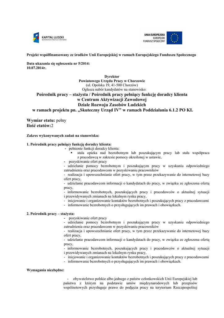 Projekt współfinansowany ze środków Unii Europejskiej w ramach Europejskiego Funduszu Społecznego Data ukazania się ogłoszenia nr 5/2014: 10.07.2014r. Dyrektor Powiatowego Urzędu Pracy w Chorzowie (ul. Opolska 19, 41-500 Chorzów) Ogłasza nabór kandydatów na stanowisko: Pośrednik pracy – stażysta / Pośrednik pracy pełniący funkcję doradcy klienta w Centrum Aktywizacji Zawodowej Dziale Rozwoju Zasobów Ludzkich w ramach projektu pn. „Skuteczny Urząd IV” w ramach Poddziałania 6.1.2 PO KL Wymiar etatu: pełny Ilość etatów:2 Zakres wykonywanych zadań na stanowisku: 1. Pośrednik pracy pełniący funkcję doradcy klienta: - pełnienie funkcji doradcy klienta:  stała opieka nad bezrobotnym lub poszukującym pracy lub stała współpraca z pracodawcą w zakresie pomocy określonej w ustawie, - pozyskiwanie ofert pracy - udzielanie pomocy bezrobotnym i poszukującym pracy w uzyskaniu odpowiedniego zatrudnienia oraz pracodawcom w pozyskiwaniu pracowników - realizacja i upowszechnianie ofert pracy, w tym przez przekazywanie do internetowej bazy ofert pracy, - udzielanie pracodawcom informacji o kandydatach do pracy, w związku ze zgłoszona ofertą pracy, - informowanie bezrobotnych, poszukujących pracy i pracodawców o aktualnej sytuacji i przewidywanych zmianach na lokalnym rynku pracy, - inicjowanie i organizowanie kontaktów bezrobotnych i poszukujących pracy z pracodawcami - informowanie bezrobotnych o przysługujących im prawach i obowiązkach. 2. Pośrednik pracy – stażysta: - pozyskiwanie ofert pracy - udzielanie pomocy bezrobotnym i poszukującym pracy w uzyskaniu odpowiedniego zatrudnienia oraz pracodawcom w pozyskiwaniu pracowników - realizacja i upowszechnianie ofert pracy, w tym przez przekazywanie do internetowej bazy ofert pracy, - udzielanie pracodawcom informacji o kandydatach do pracy, w związku ze zgłoszona ofertą pracy, - informowanie bezrobotnych, poszukujących pracy i pracodawców o aktualnej sytuacji i przewidywanych zmianach na lokalnym rynku pracy, - inicjowanie i organizowanie kontaktów bezrobotnych i poszukujących pracy z pracodawcami - informowanie bezrobotnych o przysługujących im prawach i obowiązkach. Wymagania niezbędne: - obywatelstwo polskie albo jednego z państw członkowskich Unii Europejskiej lub państwa z którym na podstawie umów międzynarodowych lub przepisów wspólnotowych przysługuje prawo do podjęcia pracy na terytorium Rzeczpospolitej Polskiej i znajomość języka polskiego potwierdzona odpowiednim dokumentem określonym w przepisach o Służbie Cywilnej. - pełna zdolność do czynności prawnych oraz korzystanie z pełni praw publicznych - niekaralność - nieposzlakowana opinia - stan zdrowia pozwalający na zatrudnienie na określonym stanowisku - wykształcenie wyższe zawodowe (licencjat) lub magisterskie - znajomość ustawy o promocji zatrudnienia i instytucjach rynku pracy - znajomość kodeksu postępowania administracyjnego - znajomość ustawy o pracownikach samorządowych - znajomość ustawy o samorządzie gminnym - umiejętność obsługi programu MS Office - doświadczenie zawodowe: pośrednik pracy – stażysta: nie dotyczy pośrednik pracy :co najmniej 12 miesięcy w zakresie pośrednictwa pracy Wymagania dodatkowe: - preferowane wykształcenie z zakresu nauk społecznych , politycznych, pedagogiki, psychologii, marketingu biegła obsługa komputera dobra organizacja pracy wysokie kompetencje społeczne komunikatywność, odporność na stres, odpowiedzialność, dokładność, empatia wysoka kultura osobista , chęć podnoszenia kwalifikacji, Warunki pracy: - miejsce pracy – Chorzów, ul. Opolska 19 – parter, budynek bez windy, zaopatrzony w podjazd oraz toaletę dla osób niepełnosprawnych, praca na przedmiotowym stanowisku nie jest narażona na występowanie uciążliwych i szkodliwych warunków pracy. Praca będzie wymagała wychodzenia w teren. Wskaźnik zatrudnienia: W miesiącu poprzedzającym datę upublicznienia ogłoszenia wskaźnik zatrudnienia osób niepełnosprawnych w Powiatowym Urzędzie Pracy w Chorzowie, w rozumieniu przepisów o rehabilitacji zawodowej i społecznej oraz zatrudnianiu osób niepełnosprawnych jest niższy niż 6%. Wymagane dokumenty i oświadczenia: - list motywacyjny, - życiorys – curriculum vitae z dokładnym opisem przebiegu pracy zawodowej, - kserokopie dokumentów potwierdzających wykształcenie (poświadczone przez kandydata za zgodność z oryginałem) - kserokopie zaświadczeń o ukończonych kursach i szkoleniach (poświadczone przez kandydata za zgodność z oryginałem) - kserokopie świadectw pracy (poświadczone przez kandydata za zgodność z oryginałem), - oryginał kwestionariusza osobowego dla osoby ubiegającej się o zatrudnienie, - oświadczenie kandydata o nie skazaniu prawomocnym wyrokiem sądu za umyślne przestępstwo ścigane z oskarżenia publicznego lub umyślne przestępstwo skarbowe, o wyrażeniu zgody na przetwarzanie danych osobowych do celów rekrutacji, o nieprowadzeniu działalności gospodarczej bądź o profilu prowadzonej działalności gospodarczej, o posiadaniu zdolności do czynności prawnych oraz korzystaniu z pełni praw publicznych. - osoby, które zamierzają skorzystać z uprawnienia, o którym mowa w art. 13a ust. 2 ustawy o pracownikach samorządowych są obowiązane do złożenia wraz z dokumentami kopii dokumentu potwierdzającego niepełnosprawność Dokumenty aplikacyjne: list motywacyjny oraz CV powinny być opatrzone klauzulą: Wyrażam zgodę na przetwarzanie moich danych osobowych zawartych w mojej ofercie pracy dla potrzeb niezbędnych do realizacji procesu rekrutacji, zgodnie z ustawą z dnia 29.08.1997r. o ochronie danych osobowych. Wymagane dokumenty winny być przez kandydata własnoręcznie podpisane i złożone osobiście w sekretariacie Urzędu lub doręczone listownie w terminie do dnia 21.07.2014r. pod adresem : Powiatowy Urząd Pracy Ul. Opolska 19 41-500 Chorzów w zakle