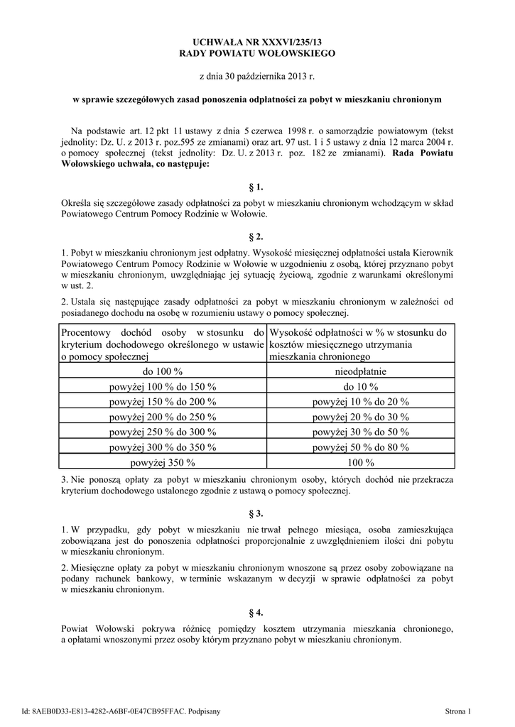 UCHWAŁA NR XXXVI/235/13 RADY POWIATU WOŁOWSKIEGO z dnia 30 października 2013 r. w sprawie szczegółowych zasad ponoszenia odpłatności za pobyt w mieszkaniu chronionym Na podstawie art. 12 pkt 11 ustawy z dnia 5 czerwca 1998 r. o samorządzie powiatowym (tekst jednolity: Dz. U. z 2013 r. poz.595 ze zmianami) oraz art. 97 ust. 1 i 5 ustawy z dnia 12 marca 2004 r. o pomocy społecznej (tekst jednolity: Dz. U. z 2013 r. poz. 182 ze zmianami). Rada Powiatu Wołowskiego uchwała, co następuje: § 1. Określa się szczegółowe zasady odpłatności za pobyt w mieszkaniu chronionym wchodzącym w skład Powiatowego Centrum Pomocy Rodzinie w Wołowie. § 2. 1. Pobyt w mieszkaniu chronionym jest odpłatny. Wysokość miesięcznej odpłatności ustala Kierownik Powiatowego Centrum Pomocy Rodzinie w Wołowie w uzgodnieniu z osobą, której przyznano pobyt w mieszkaniu chronionym, uwzględniając jej sytuację życiową, zgodnie z warunkami określonymi w ust. 2. 2. Ustala się następujące zasady odpłatności za pobyt w mieszkaniu chronionym w zależności od posiadanego dochodu na osobę w rozumieniu ustawy o pomocy społecznej. Procentowy dochód osoby w stosunku do Wysokość odpłatności w % w stosunku do kryterium dochodowego określonego w ustawie kosztów miesięcznego utrzymania o pomocy społecznej mieszkania chronionego do 100 % nieodpłatnie powyżej 100 % do 150 % do 10 % powyżej 150 % do 200 % powyżej 10 % do 20 % powyżej 200 % do 250 % powyżej 20 % do 30 % powyżej 250 % do 300 % powyżej 30 % do 50 % powyżej 300 % do 350 % powyżej 50 % do 80 % powyżej 350 % 100 % 3. Nie ponoszą opłaty za pobyt w mieszkaniu chronionym osoby, których dochód nie przekracza kryterium dochodowego ustalonego zgodnie z ustawą o pomocy społecznej. § 3. 1. W przypadku, gdy pobyt w mieszkaniu nie trwał pełnego miesiąca, osoba zamieszkująca zobowiązana jest do ponoszenia odpłatności proporcjonalnie z uwzględnieniem ilości dni pobytu w mieszkaniu chronionym. 2. Miesięczne opłaty za pobyt w mieszkaniu chronionym wnoszone są przez osoby zobowiązane na podany rachunek bankowy, w terminie wskazanym w decyzji w sprawie odpłatności za pobyt w mieszkaniu chronionym. § 4. Powiat Wołowski pokrywa różnicę pomiędzy kosztem utrzymania mieszkania chronionego, a opłatami wnoszonymi przez osoby którym przyznano pobyt w mieszkaniu chronionym. Id: 8AEB0D33-E813-4282-A6BF-0E47CB95FFAC. Podpisany Strona 1 § 5. Traci moc uchwała Rady Powiatu Wołowskiego Nr XXVIII/193/13 z dnia 24 stycznia 2013 r. w sprawie szczegółowych zasad ponoszenia odpłatności za pobyt w mieszkaniu chronionym dla pełnoletnich wychowanków opuszczających placówki opiekuńczo-wychowawcze i rodziny zastępcze. § 6. Wykonanie uchwały powierza się Zarządowi Powiatu Wołowskiego. § 7. Uchwała podlega ogłoszeniu w Dzienniku Urzędowym Województwa Dolnośląskiego i wchodzi w życie po upływie 14 dni od dnia jej ogłoszenia. Przewodniczący Rady Powiatu Wołowskiego Zbigniew Skorupa Id: 8AEB0D33-E813-4282-A6BF-0E47CB95FFAC. Podpisany Strona 2 Uzasadnienie do uchwały Rady Powiatu w sprawie szczegółowych zasad ponoszenia odpłatności za pobyt w mieszkaniu chronionym. W związku ze skargą Wojewody Dolnośląskiego na uchwałę Rady Powiatu Wołowskiego Nr XXVIII/193/13 z dnia 24 stycznia 2013 r. w sprawie szczegółowych zasad ponoszenia odpłatności za pobyt w mieszkaniu chronionym dla pełnoletnich wychowanków opuszczających placówki opiekuńczo-wychowawcze i rodziny zastępcze opracowany został nowy projekt uchwały eliminujący zakwestionowaneprzez organ nadzoru zapisy. W przedmiotowym projekcie uchwały zrezygnowano z części dotychczasowych zapisów, regulujących szczegółowo kwestie związane z ponoszeniem odpłatności za pobyt w mieszkaniu chronionym. W ocenie organu nadzoru Rada Powiatu nie była upoważniona do wprowadzania niektórych regulacji określających na przykład, że ustalenie wysokości odpłatności za pobyt w mieszkaniu chronionym,odbywa się w drodze decyzji administracyjnejoraz kto jest organem uprawnionym do wydania takiej decyzji. Skrócony został również tytuł uchwały, w stosunku do poprzedniej uchwały zrezygnowano z zapisu określającego krąg osób, korzystających z mieszkania chronionego. Zapis art. 97 ust. 5 ustawy z dnia 12 marca 2004 r. o pomocy społecznej (tekst jednolity: Dz. U. z 2013 r. poz. 182 ze zmianami) nie upoważnia bowiem rady powiatu do wprowadzania takiej regulacji. Ponadto w tabeli zamieszczonej w § 2 projektu uchwały w rubryce określającej wysokość odpłatności w % w stosunku do kosztów miesięcznego utrzymania mieszkania chronionego wprowadzono przedziały „od” - „do”, rezygnując z dotychczasowej regulacji określającej kategorycznie procent opłaty ponoszonej przez mieszkańca. Umożliwi to w pełni realizację zasady wyrażonej w § 2 ust. 1 projektu uchwały, zgodnie z którą wysokość miesięcznej odpłatności za pobyt w mieszkaniu chronionym ustala się w uzgodnieniu z osobą, której przyznano pobyt w mieszkaniu chronionym, uwzględniając jej sytuację życiową i zasady określone w uchwale. Przedmiotowy projekt uchwały w przedłożonym brzmieniu został zredagowany po konsultacji z organem nadzoru. Id: 8AEB0D33-E813-4282-A6BF-0E47CB95FFAC. Podpisany Strona 1