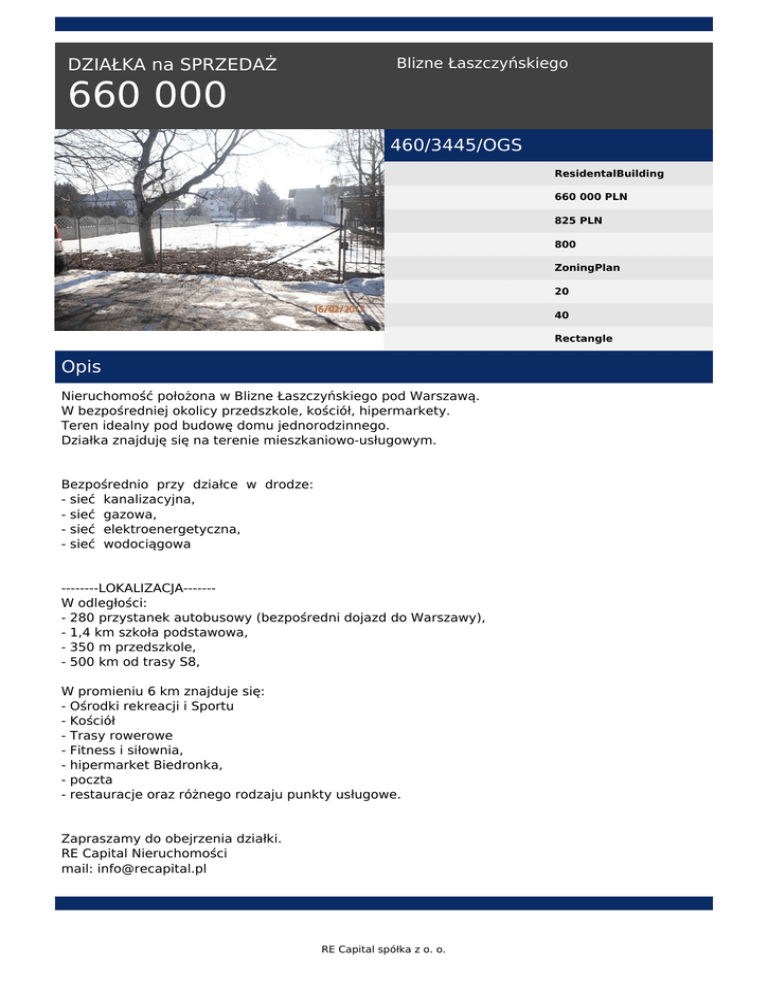 DZIAŁKA na SPRZEDAŻ Blizne Łaszczyńskiego 660 000 460/3445/OGS ResidentalBuilding 660 000 PLN 825 PLN 800 ZoningPlan 20 40 Rectangle Opis Nieruchomość położona w Blizne Łaszczyńskiego pod Warszawą. W bezpośredniej okolicy przedszkole, kościół, hipermarkety. Teren idealny pod budowę domu jednorodzinnego. Działka znajduję się na terenie mieszkaniowo-usługowym. Bezpośrednio przy działce w drodze: - sieć kanalizacyjna, - sieć gazowa, - sieć elektroenergetyczna, - sieć wodociągowa --------LOKALIZACJA------W odległości: - 280 przystanek autobusowy (bezpośredni dojazd do Warszawy), - 1,4 km szkoła podstawowa, - 350 m przedszkole, - 500 km od trasy S8, W promieniu 6 km znajduje się: - Ośrodki rekreacji i Sportu - Kościół - Trasy rowerowe - Fitness i siłownia, - hipermarket Biedronka, - poczta - restauracje oraz różnego rodzaju punkty usługowe. Zapraszamy do obejrzenia działki. RE Capital Nieruchomości mail: [email protected] RE Capital spółka z o. o. Juliusz Kwiatkowski tel. +48530985656 tel. 225353628 email: [email protected] RE Capital spółka z o. o. Powered by TCPDF (www.tcpdf.org)