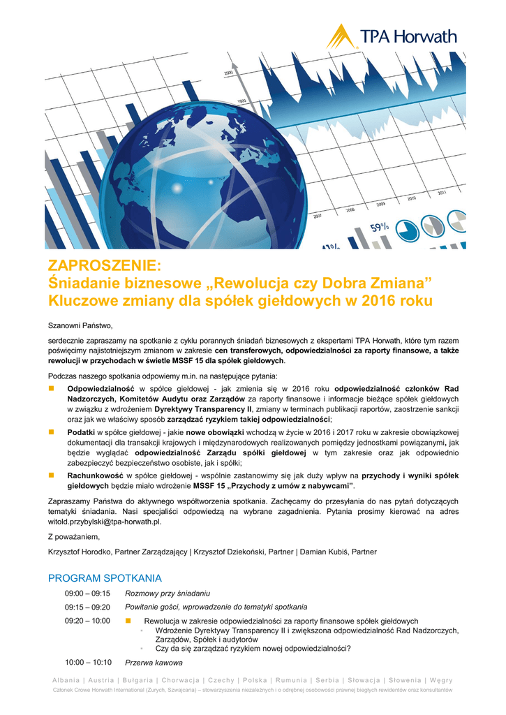 ZAPROSZENIE: Śniadanie biznesowe „Rewolucja czy Dobra Zmiana” Kluczowe zmiany dla spółek giełdowych w 2016 roku Szanowni Państwo, serdecznie zapraszamy na spotkanie z cyklu porannych śniadań biznesowych z ekspertami TPA Horwath, które tym razem poświęcimy najistotniejszym zmianom w zakresie cen transferowych, odpowiedzialności za raporty finansowe, a także rewolucji w przychodach w świetle MSSF 15 dla spółek giełdowych. Podczas naszego spotkania odpowiemy m.in. na następujące pytania: Odpowiedzialność w spółce giełdowej - jak zmienia się w 2016 roku odpowiedzialność członków Rad Nadzorczych, Komitetów Audytu oraz Zarządów za raporty finansowe i informacje bieżące spółek giełdowych w związku z wdrożeniem Dyrektywy Transparency II, zmiany w terminach publikacji raportów, zaostrzenie sankcji oraz jak we właściwy sposób zarządzać ryzykiem takiej odpowiedzialności; Podatki w spółce giełdowej - jakie nowe obowiązki wchodzą w życie w 2016 i 2017 roku w zakresie obowiązkowej dokumentacji dla transakcji krajowych i międzynarodowych realizowanych pomiędzy jednostkami powiązanymi, jak będzie wyglądać odpowiedzialność Zarządu spółki giełdowej w tym zakresie oraz jak odpowiednio zabezpieczyć bezpieczeństwo osobiste, jak i spółki; Rachunkowość w spółce giełdowej - wspólnie zastanowimy się jak duży wpływ na przychody i wyniki spółek giełdowych będzie miało wdrożenie MSSF 15 „Przychody z umów z nabywcami”. Zapraszamy Państwa do aktywnego współtworzenia spotkania. Zachęcamy do przesyłania do nas pytań dotyczących tematyki śniadania. Nasi specjaliści odpowiedzą na wybrane zagadnienia. Pytania prosimy kierować na adres [email protected]. Z poważaniem, Krzysztof Horodko, Partner Zarządzający | Krzysztof Dziekoński, Partner | Damian Kubiś, Partner PROGRAM SPOTKANIA 09:00 – 09:15 Rozmowy przy śniadaniu 09:15 – 09:20 Powitanie gości, wprowadzenie do tematyki spotkania 09:20 – 10:00 Rewolucja w zakresie odpowiedzialności za raporty finansowe spółek giełdowych Wdrożenie Dyrektywy Transparency II i zwiększona odpowiedzialność Rad Nadzorczych, Zarządów, Spółek i audytorów ▪ Czy da się zarządzać ryzykiem nowej odpowiedzialności? ▪ 10:00 – 10:10 Przerwa kawowa A l b a n i a | A us t r i a | B u ł g a r i a | C h o r wa c j a | C ze c h y | P o lsk a | R um u n i a | S e r b i a | S ł owa c j a | S ł o we n i a | W ę g r y Członek Crowe Horwath International (Zurych, Szwajcaria) – stowarzyszenia niezależnych i o odrębnej osobowości prawnej biegłych rewidentów oraz konsultantów 10:10 – 10:50 Rewolucja w cenach transferowych Nowe rodzaje obowiązkowej dokumentacji cen transferowych (local file, master file, country-by-country reporting), nowe obowiązki sprawozdawcze (analizy porównawcze, CIT-TP, oświadczenie o posiadaniu dokumentacji), zmieniające się podejście władz skarbowych do kwestii kontroli cen transferowych. ▪ Jak ograniczyć ryzyka i odpowiedzialność osobistą i spółki? ▪ 10:50 – 11:00 Przerwa kawowa 11:00 – 11:45 ▪ ▪ 11:45 – 12:00 Rewolucja w przychodach Jak zabezpieczyć przychody przed niekontrolowaną zmianą MSSF 15 „Przychody z umów z nabywcami” i wpływ na wycenę przychodów z umów z klientami Podsumowanie i dyskusja PROWADZĄCY Damian Kubiś | Partner, Doradca Podatkowy Posiada duże doświadczenie doradcze, które zawdzięcza uczestnictwu w wielu kompleksowych projektach obejmujących następujące obszary: podatek dochodowy od osób prawnych, VAT, badania typu due diligence, projekty transfer pricing (ustalanie cen rynkowych, dokumentacja podatkowa). Krzysztof Dziekoński | Partner, Biegły Rewident, ACCA Specjalizuje się w obsłudze giełdowych grup kapitałowych raportujących zgodnie z MSSF, w projektach IPO (prospekty emisyjne, przekształcenia sprawozdań finansowych na MSSF, konsolidacje), jak również doradztwie i rachunkowej obsłudze przy połączeniach i przekształceniach przedsiębiorstw. Piotr Zając | Manager, Doradca Podatkowy Specjalizuje się w doradztwie transakcyjnym, optymalizacji podatkowej oraz międzynarodowym prawie podatkowym. Posiada również szerokie doświadczenie w zakresie przygotowywania dokumentacji cen transferowych, reprezentowania klientów w kontaktach z organami podatkowymi oraz przed sądami administracyjnymi. Maciej Krokosiński | Dyrektor w Dziale Audytu i Doradztwa Biznesowego Specjalizuje się w badaniu oraz świadczeniu usług atestacyjnych dla spółek z branży nieruchomości oraz budowlanej, raportujących zgodnie z polskimi oraz międzynarodowymi standardami sprawozdawczości finansowej. Bogate doświadczenie zawdzięcza uczestnictwu w badaniach oraz przeglądach największych grup kapitałowych oraz doradztwie i rachunkowej obsłudze przy połączeniach i przekształceniach przedsiębiorstw. Bartosz Seweryn | Manager, Biegły Rewident Specjalizuje się w projektach z zakresu badań oraz przeglądów rocznych sprawozdań finansowych, przeglądów typu due diligence oraz procesów kontroli wewnętrznej. Ponadto, jest zaangażowany w pozostałe doradztwo dotyczące między innymi przygotowanie pakietów konsolidacyjnych. REJESTRACJA POZNAŃ 17 maja 2016 (wtorek) TPA Horwath Poznań ul. Murawa 12-18 61-655 Poznań KATOWICE 19 maja 2016 (czwartek) TPA Horwath Katowice al. Korfantego 141 B 40-154 Katowice WARSZAWA 24 maja 2016 (wtorek) TPA Horwath Warszawa ul. Przyokopowa 33 01-208 Warszawa R.S.V.P. Uprzejmie prosimy o potwierdzenie obecności: 1. poprzez kliknięcie przycisku "Zgłaszam się" z właściwą datą i nazwą miasta, które znajdują się w treści maila 2. lub poprzez skorzystanie z LINKU DO REJESTRACJI W celu poprawnej rejestracji prosimy o podanie następujących danych w treści wiadomości: imię, nazwisko, adres e-mail, nr telefonu, nazwa firmy, stanowisko i/lub wstawienie sygnatury e-mail z tymi danymi. UWAGA: Udział w spotkaniu jest bezpłatny. Liczba 