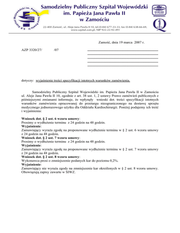 Zamość, dnia 19 marca 2007 r. AZP 3320/27/ /07 .............................................................................. .............................................................................. .............................................................................. .............................................................................. .............................................................................. dotyczy: wyjaśnienie treści specyfikacji istotnych warunków zamówienia. Samodzielny Publiczny Szpital Wojewódzki im. Papieża Jana Pawła II w Zamościu ul. Aleje Jana Pawła II 10, zgodnie z art. 38 ust. 1, 2 ustawy Prawo zamówień publicznych z późniejszymi zmianami informuje, że wpłynęły wnioski dot. treści specyfikacji istotnych warunków zamówienia opracowanej do przetargu nieograniczonego na dostawę sprzętu medycznego jednorazowego użytku dla Oddziału Kardiochirurgii. Poniżej podajemy ich treść i wyjaśnienia: Wniosek dot. § 2 ust. 6 wzoru umowy: Prosimy o wydłużenie terminu z 24 godzin na 48 godzin. Wyjaśnienie: Zamawiający wyraża zgodę na proponowane wydłużenie terminu w § 2 ust. 6 wzoru umowy z 24 godzin na 48 godzin. Wniosek dot. § 2 ust. 7 wzoru umowy: Prosimy o wydłużenie terminu z 24 godzin na 48 godzin. Wyjaśnienie: Zamawiający wyraża zgodę na proponowane wydłużenie terminu w § 2 ust. 7 wzoru umowy z 24 godzin na 48 godzin. Wniosek dot. § 2 ust. 8 wzoru umowy: Wykonawca prosi o zmniejszenie podanych kar do poziomu 0,2%. Wyjaśnienie: Zamawiający nie wyraża zgody na zmniejszenie kar określonych w § 2 ust. 8 wzoru umowy. Obowiązują zapisy zawarte w SIWZ.