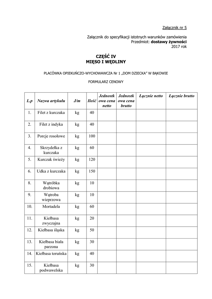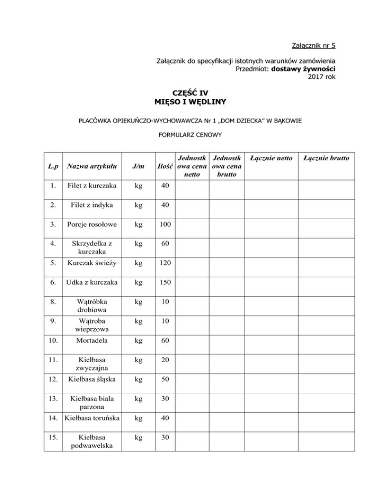 Załącznik nr 5 Załącznik do specyfikacji istotnych warunków zamówienia Przedmiot: dostawy żywności 2017 rok CZĘŚĆ IV MIĘSO I WĘDLINY PLACÓWKA OPIEKUŃCZO-WYCHOWAWCZA Nr 1 „DOM DZIECKA” W BĄKOWIE FORMULARZ CENOWY Jednostk Jednostk Ilość owa cena owa cena netto brutto L.p Nazwa artykułu J/m 1. Filet z kurczaka kg 40 2. Filet z indyka kg 40 3. Porcje rosołowe kg 100 4. Skrzydełka z kurczaka kg 60 5. Kurczak świeży kg 120 6. Udka z kurczaka kg 150 8. Wątróbka drobiowa kg 10 9. Wątroba wieprzowa kg 10 10. Mortadela kg 60 11. Kiełbasa zwyczajna kg 20 12. Kiełbasa śląska kg 50 13. Kiełbasa biała parzona kg 30 kg 40 kg 30 14. Kiełbasa toruńska 15. Kiełbasa podwawelska Łącznie netto Łącznie brutto Jednostk Jednostk Ilość owa cena owa cena netto brutto L.p Nazwa artykułu J/m 16. Kiełbasa piwna kg 20 17. Kiełbasa jałowcowa kg 20 18. Kiełbasa żywiecka wieprzowa kg 10 19. Kiełbasa żywiecka drobiowa kg 10 20. Kiełbasa krakowska kg 30 21. Szynka gotowana kg 50 22. Mielonka wieprzowa kg 20 23. Mielonka z indyka kg 20 24. Ogonówka parzona kg 10 25. Ogonówka wędzona kg 20 25. Polędwica sopocka kg 20 26. Mielonka kg 20 27. Parówki z szynki kg 30 28. Serdelki kg 70 29. Parówki cielęce kg 20 30. Berlinki kg 90 31. Szynka konserwowa kg 10 32. Pasztetowa wędzona kg 20 Łącznie netto Łącznie brutto Jednostk Jednostk Ilość owa cena owa cena netto brutto L.p Nazwa artykułu J/m 33. Pasztetowa zwykła kg 20 34. Pasztet pieczony kg 20 35. Czarny salceson kg 10 36. Metka kg 30 37. Kaszanka kg 30 38. Boczek wędzony kg 40 39 Boczek świeży, bez żeber i skóry kg 20 40. Mielone wieprzowe kg 150 41. Gulaszowe wieprzowe kg 50 42. Karkówka wieprzowa bez kości kg 70 43. Schab wieprzowy bez kości kg 80 44. Żeberka wieprzowe paski kg 70 45. Wołowina zrazowa kg 20 46. Łopatka wieprzowa kg 30 Łącznie netto Łącznie brutto R A Z EM W wędlinach oznaczonych w zestawieniu ilościowo wartościowym nie dopuszcza się obecności MOM – mięsa oddzielonego mechanicznie
