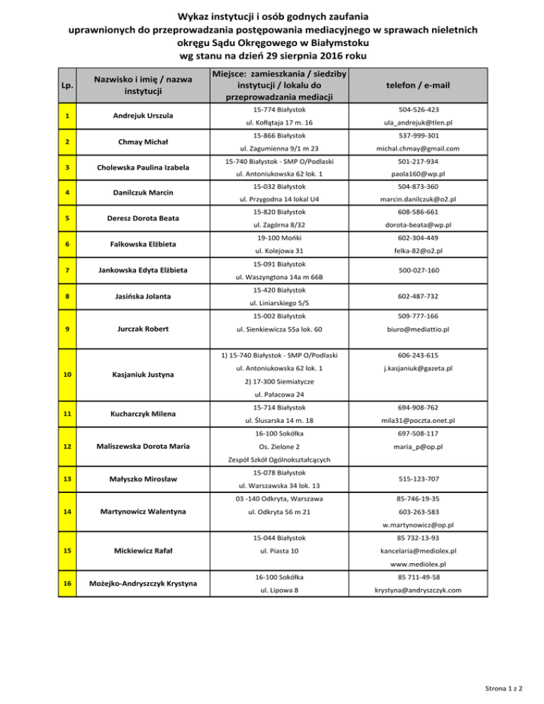 Wykaz instytucji i osób godnych zaufania uprawnionych do przeprowadzania postępowania mediacyjnego w sprawach nieletnich okręgu Sądu Okręgowego w Białymstoku wg stanu na dzień 29 sierpnia 2016 roku Lp. Nazwisko i imię / nazwa instytucji 1 Andrejuk Urszula 2 Chmay Michał 3 Cholewska Paulina Izabela 4 Danilczuk Marcin 5 Deresz Dorota Beata 6 Falkowska Elżbieta 7 Jankowska Edyta Elżbieta 8 Jasińska Jolanta 9 10 Jurczak Robert Kasjaniuk Justyna Miejsce: zamieszkania / siedziby instytucji / lokalu do przeprowadzania mediacji telefon / e-mail 15-774 Białystok 504-526-423 ul. Kołłątaja 17 m. 16 [email protected] 15-866 Białystok 537-999-301 ul. Zagumienna 9/1 m 23 [email protected] 15-740 Białystok - SMP O/Podlaski 501-217-934 ul. Antoniukowska 62 lok. 1 [email protected] 15-032 Białystok 504-873-360 ul. Przygodna 14 lokal U4 [email protected] 15-820 Białystok 608-586-661 ul. Zagórna 8/32 [email protected] 19-100 Mońki 602-304-449 ul. Kolejowa 31 [email protected] 15-091 Białystok ul. Waszyngtona 14a m 66B 15-420 Białystok ul. Liniarskiego 5/5 500-027-160 602-487-732 15-002 Białystok 509-777-166 ul. Sienkiewicza 55a lok. 60 [email protected] 1) 15-740 Białystok - SMP O/Podlaski 606-243-615 ul. Antoniukowska 62 lok. 1 [email protected] 2) 17-300 Siemiatycze ul. Pałacowa 24 11 12 Kucharczyk Milena Maliszewska Dorota Maria 15-714 Białystok 694-908-762 ul. Ślusarska 14 m. 18 [email protected] 16-100 Sokółka 697-508-117 Os. Zielone 2 [email protected] Zespół Szkół Ogólnokształcących 13 14 Małyszko Mirosław Martynowicz Walentyna 15-078 Białystok ul. Warszawska 34 lok. 13 515-123-707 03 -140 Odkryta, Warszawa 85-746-19-35 ul. Odkryta 56 m 21 603-263-583 [email protected] 15 Mickiewicz Rafał 15-044 Białystok 85 732-13-93 ul. Piasta 10 [email protected] www.mediolex.pl 16 Możejko-Andryszczyk Krystyna 16-100 Sokółka 85 711-49-58 ul. Lipowa 8 [email protected] Strona 1 z 2 Lp. Nazwisko i imię / nazwa instytucji 1 17 Andrejuk Urszula Polasik Marzanna Joanna Miejsce: zamieszkania / siedziby instytucji / lokalu do przeprowadzania mediacji telefon / e-mail 11-500 Giżycko Gajewo 87 428-49-20 ul. Poziomkowa 8 503-966-484 [email protected] 18 Przybyłowska Jagoda Malwina 19 Romanek Iwona Urszula 20 Standowicz Elżbieta Jadwiga 21 Szwed Eliza Jolanta 22 Siniakowicz Elżbieta 15-085 Białystok 500-215-441 ul. Branickiego 17 lok. 306 [email protected] 18-300 Zambrów ul. Świętokrzyska 2 m 12 660-470-541 15-863 Białystok 85-652-24-06 ul. Radzymińska 44 m. 21 kom. 608-380-581 11-500 Giżycko 87 428-49-20 ul. Traugutta 10 m. 3 606-759-963 17-300 Siemiatycze 85 655-56-89 ul. Ogrodowa 40 664-871-355 [email protected] 23 Stowarzyszenie Mediator 24 Trypuć Marek 25 Trzyna Katarzyna 26 Wojnowska Dorota 27 Zarzecki Wiesław 15-094 Białystok ul. M. Skłodowskiej-Curie 3 603-263-583 11-510 Wydminy 87 428-49-20 Dworcowa 3 „B” m. 4 504-086-596 17-100 Bielsk Podlaski ul. Bohaterów Września 15 502-159-386 15-550 Białystok 502-384-618 ul. Stokrotki 10 [email protected] 16-100 Sokółka ul. Grodzieńska 150 85 675-20-87 Strona 2 z 2
