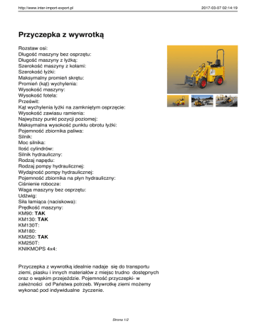 http://www.inter-import-export.pl 2017-03-07 02:14:19 Przyczepka z wywrotką Rozstaw osi: Długość maszyny bez osprzętu: Długość maszyny z łyżką: Szerokość maszyny z kołami: Szerokość łyżki: Maksymalny promień skrętu: Promień (kąt) wychylenia: Wysokość maszyny: Wysokość fotela: Prześwit: Kąt wychylenia łyżki na zamkniętym osprzęcie: Wysokość zawiasu ramienia: Najwyższy punkt pozycji poziomej: Maksymalna wysokość punktu obrotu łyżki: Pojemność zbiornika paliwa: Silnik: Moc silnika: Ilość cylindrów: Silnik hydrauliczny: Rodzaj napędu: Rodzaj pompy hydraulicznej: Wydajność pompy hydraulicznej: Pojemność zbiornika na płyn hydrauliczny: Ciśnienie robocze: Waga maszyny bez osprzętu: Udźwig: Siła łamiąca (naciskowa): Prędkość maszyny: KM90: TAK KM130: TAK KM130T: KM180: KM250: TAK KM250T: KNIKMOPS 4x4: Przyczepka z wywrotką idealnie nadaje się do transportu ziemi, piasku i innych materiałów z miejsc trudno dostępnych oraz o wąskim przejeździe. Pojemność przyczepki- w zależności od Państwa potrzeb. Wywrotkę ziemi możemy wykonać pod indywidualne życzenie. Strona 1/2 http://www.inter-import-export.pl 2017-03-07 02:14:19 Strona 2/2