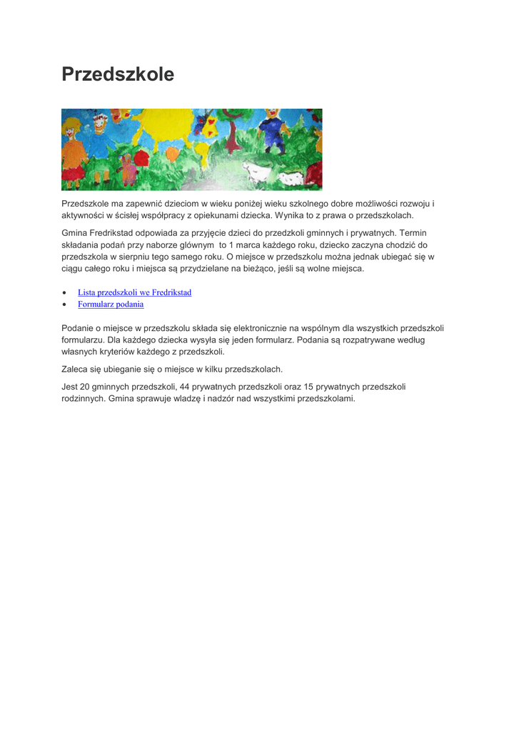 Przedszkole Przedszkole ma zapewnić dzieciom w wieku poniżej wieku szkolnego dobre możliwości rozwoju i aktywności w ścisłej współpracy z opiekunami dziecka. Wynika to z prawa o przedszkolach. Gmina Fredrikstad odpowiada za przyjęcie dzieci do przedzkoli gminnych i prywatnych. Termin składania podań przy naborze glównym to 1 marca każdego roku, dziecko zaczyna chodzić do przedszkola w sierpniu tego samego roku. O miejsce w przedszkolu można jednak ubiegać się w ciągu całego roku i miejsca są przydzielane na bieżąco, jeśli są wolne miejsca. Lista przedszkoli we Fredrikstad Formularz podania Podanie o miejsce w przedszkolu składa się elektronicznie na wspólnym dla wszystkich przedszkoli formularzu. Dla każdego dziecka wysyła się jeden formularz. Podania są rozpatrywane według własnych kryteriów każdego z przedszkoli. Zaleca się ubieganie się o miejsce w kilku przedszkolach. Jest 20 gminnych przedszkoli, 44 prywatnych przedszkoli oraz 15 prywatnych przedszkoli rodzinnych. Gmina sprawuje wladzę i nadzór nad wszystkimi przedszkolami.