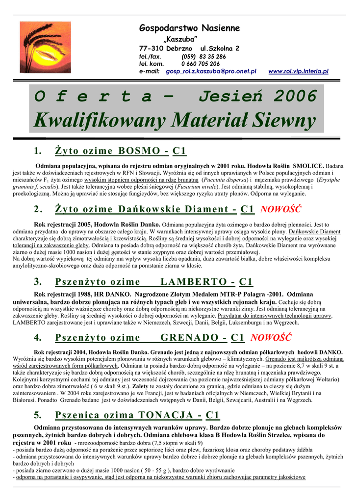 Gospodarstwo Nasienne „Kaszuba” 77-310 Debrzno ul.Szkolna 2 tel./fax. (059) 83 35 286 tel. kom. 0 660 705 206 e-mail: [email protected] O f e r t a – www.rol.vip.interia.pl Jesień 2006 Kwalifikowany Materiał Siewny 1. Ży to oz ime B OSMO - C 1 Odmiana populacyjna, wpisana do rejestru odmian oryginalnych w 2001 roku. Hodowla Roślin SMOLICE. Badana jest także w doświadczeniach rejestrowych w RFN i Słowacji. Wyróżnia się od innych uprawianych w Polsce populacyjnych odmian i mieszańców F1 żyta ozimego wysokim stopniem odporności na rdzę brunatną (Puccinia dispersa) i mączniaka prawdziwego (Erysiphe graminis f. secalis). Jest także tolerancyjna wobec pleśni śniegowej (Fusarium nivale). Jest odmianą stabilną, wysokoplenną i proekologiczną. Można ją uprawiać nie stosując fungicydów, bez większego ryzyka utraty plonów. Odporna na wyleganie. 2. Ży to oz ime D ańkow skie D iament - C 1 NOWOŚĆ Rok rejestracji 2005, Hodowla Roślin Danko. Odmiana populacyjna żyta ozimego o bardzo dobrej plenności. Jest to odmiana przydatna do uprawy na obszarze całego kraju. W warunkach intensywnej uprawy osiąga wysokie plony. Dańkowskie Diament charakteryzuje się dobrą zimotrwałością i krzewistością. Rośliny są średniej wysokości i dobrej odporności na wyleganie oraz wysokiej tolerancji na zakwaszenie gleby. Odmiana ta posiada dobrą odporność na większość chorób żyta. Dańkowskie Diament ma wyrównane ziarno o dużej masie 1000 nasion i dużej gęstości w stanie zsypnym oraz dobrej wartości przemiałowej. Na dobrą wartość wypiekową tej odmiany ma wpływ wysoka liczba opadania, duża zawartość białka, dobre właściwości kompleksu amylolityczno-skrobiowego oraz duża odporność na porastanie ziarna w kłosie. 3. Psz enży to oz ime L A MBE R T O - C 1 Rok rejestracji 1988, HR DANKO. Nagrodzone Złotym Medalem MTR-P Polagra -2001. Odmiana uniwersalna, bardzo dobrze plonująca na różnych typach gleb i we wszystkich rejonach kraju. Cechuje się dobrą odpornością na wszystkie ważniejsze choroby oraz dobrą odpornością na niekorzystne warunki zimy. Jest odmianą tolerancyjną na zakwaszenie gleby. Rośliny są średniej wysokości o dobrej odporności na wyleganie. Przydatna do intensywnych technologii uprawy. LAMBERTO zarejestrowane jest i uprawiane także w Niemczech, Szwecji, Danii, Belgii, Luksemburgu i na Węgrzech. 4. Psz enży to oz ime GR E NA D O - C 1 NOWOŚĆ Rok rejestracji 2004, Hodowla Roślin Danko. Grenado jest jedną z najnowszych odmian półkarłowych hodowli DANKO. Wyróżnia się bardzo wysokim potencjałem plonowania w różnych warunkach glebowo – klimatycznych. Grenado jest najkrótszą odmianą wśród zarejestrowanych form półkarłowych. Odmiana ta posiada bardzo dobrą odporność na wyleganie – na poziomie 8,7 w skali 9 st. a także charakteryzuje się bardzo dobrą odpornością na większość chorób, szczególnie na rdzę brunatną i mączniaka prawdziwego. Kolejnymi korzystnymi cechami tej odmiany jest wczesność dojrzewania (na poziomie najwcześniejszej odmiany półkarłowej Woltario) oraz bardzo dobra zimotrwałość ( 6 w skali 9.st.). Zalety te zostały docenione za granicą, gdzie odmiana ta cieszy się dużym zainteresowaniem . W 2004 roku zarejestrowano je we Francji, jest w badaniach oficjalnych w Niemczech, Wielkiej Brytanii i na Białorusi. Ponadto Grenado badane jest w doświadczeniach wstępnych w Danii, Belgii, Szwajcarii, Australii i na Węgrzech. 5. Psz enica oz ima T ON AC JA - C 1 Odmiana przystosowana do intensywnych warunków uprawy. Bardzo dobrze plonuje na glebach kompleksów pszennych, żytnich bardzo dobrych i dobrych. Odmiana chlebowa klasa B Hodowla Roślin Strzelce, wpisana do rejestru w 2001 roku - mrozoodporność bardzo dobra (7,5 stopni w skali 9) - posiada bardzo dużą odporność na porażenie przez septoriozę liści oraz plew, fuzariozę kłosa oraz choroby podstawy źdźbła - odmiana przystosowana do intensywnych warunków uprawy bardzo dobrze i dobrze plonuje na glebach kompleksów pszennych, żytnich bardzo dobrych i dobrych - posiada ziarno czerwone o dużej masie 1000 nasion ( 50 - 55 g ), bardzo dobre wyrównanie - odporna na porastanie i osypywanie, stąd jest odporna na niekorzystne warunki zbioru zachowując parametry jakościowe