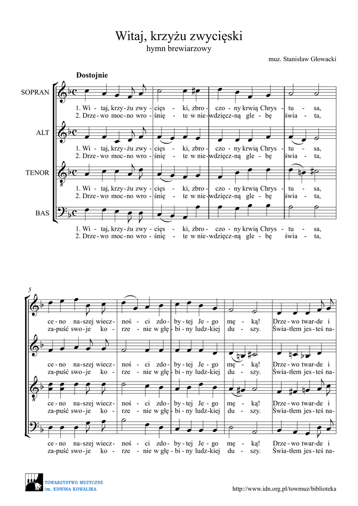 Witaj, krzyżu zwycięski hymn brewiarzowy muz. Stanisław Głowacki ° & bc œ Dostojnie SOPRAN j œ œ œj œ ˙ 1. Wi - taj, krzy - żu zwy - cięs 2. Drze - wo moc - no wro - śnię ALT TENOR & bc œ œ #œ - œ œ œ œ ˙ œ œ œ œ œ ˙ ki, zbro - czo - ny krwią Chrys - tu te w nie - wdzięcz - ną gle - bę świa - j j œ œ œ œ œ œ œ œ œ ˙ sa, ta, 1. Wi - taj, krzy - żu zwy - cięs 2. Drze - wo moc - no wro - śnię - ki, zbro - czo - ny krwią Chrys - tu te w nie - wdzięcz - ną gle - bę świa - sa, ta, 2. Drze - wo moc - no wro - śnię - te w nie - wdzięcz - ną gle - bę - tu świa - sa, ta, ki, zbro - czo - ny krwią Chrys - tu te w nie - wdzięcz - ną gle - bę świa - sa, ta, jœ œ œ œ œ b c œ œ & J œ œ œ œ œ œ ‹ 1. Wi - taj, krzy - żu zwy - cięs - ki, zbro - czo - ny krwią Chrys ? c œ BAS ¢ b œ œ œ œ J J œ œ œ 1. Wi - taj, krzy - żu zwy - cięs 2. Drze - wo moc - no wro - śnię ° œ œ œ œ œ &b J J œ j j &b œ œ œ œ œ ˙ 5 - œ œ œ œ œ œ œ œ œ œ œ ˙ ˙ ce - no na - szej wiecz - noś - ci zdo - by - tej Je - go mę - ką! za-puść swo - je ko - rze - nie w głę - bi - ny ludz - kiej du - szy. œ œ œ œ œ œ œ #˙ nœ œ œ nœ #˙ ˙ ˙ j j œ œ œ œœ Drze - wo twar-de i Świa - tłem jes - teś na- œ nœ bœ œ ce - no na - szej wiecz - noś - ci zdo - by - tej Je - go mę - ką! za-puść swo - je ko - rze - nie w głę - bi - ny ludz - kiej du - szy. Drze - wo twar-de i Świa - tłem jes - teś na- - ci zdo - by - tej Je - go mę - ką! rze - nie w głę - bi - ny ludz - kiej du - szy. Drze - wo twar-de i Świa - tłem jes - teś na- œ œ œ œ œ ˙ &b œ œ J J ‹ ce - no na - szej wiecz - noś za-puść swo - je ko - ? œ œ œ œ œJ J ¢ b ˙ œ œ œ œ œ œ œ #œ ˙ œ œ œ œ œ œ ˙ ˙ ce - no na - szej wiecz - noś - ci zdo - by - tej Je - go mę - ką! za-puść swo - je ko - rze - nie w głę - bi - ny ludz - kiej du - szy. jœ œ œ #œ nœ J j œ œ œ œ œ J Drze - wo twar-de i Świa - tłem jes - teś na- http://www.idn.org.pl/towmuz/biblioteka ° &b ˙ œ œ &b ˙ œ œ &b ˙ ‹ szors œ œ 2 10 szors - tkie, na dzie - i na szors - tkie, na dzie - i na dzie ? ˙ ¢ b - tkie, na - i na œ œ szors - tkie, na dzie - i na ° ˙ &b 14 œ œ œ œ To - bie mrocz - nej œ œ œ œ To - bie mrocz - nej To - bie mrocz - nej To - bie mrocz - nej œ œ nać nia swych i &b œ œ nać nia #œ &b œ ‹ jed - œ œ œ ? œ ¢ b jed pie - œ - nać nia œ nać nia wi - siał dro - dze œ œ œ œ - pie wi - siał dro - dze œ œ œ œ jed pie jed pie wi - siał dro - dze swych i œ swych i œ swych i wi - siał dro - dze œ œ bra - ci por - tem œ œ bra - ci por - tem œ œ œ œ bra - ci por - tem bra - ci por - tem œ œ œ j œj œ ˙ n˙ Je ży - zus, cia, a - by z Oj - cem po si - łą w no - cy cier - j œ œ œ œj œ œ œ œ ˙ Je ży ˙ Je ży ˙ - zus, cia, a - by z Oj - cem po si - łą w no - cy cier - j œ œ œ œ œJ ˙ - zus, cia, a - by z Oj - cem po si - łą w no - cy cier - œ œ œ œ œ J J ˙ Je ży œ - zus, cia, œ a - by z Oj - cem po si - łą w no - cy cier - ˙ mar - no - traw dla zbłą - ka - ˙ nych. nych. ™™ ˙ ™™ ™™ œ œ œ bœ nych. nych. œ œ œ - œ ˙ œ œ ˙ mar - no - traw dla zbłą - ka mar - no - traw dla zbłą - ka mar - no - traw dla zbłą - ka - nych. nych. - nych. nych. ˙ ™™ http://www.idn.org.pl/towmuz/biblioteka ° œ j ˙ j b œ œ œœ & 17 Bo - gu w Trój - cy jed - ne - œ #œ œ œ œ œ - ˙ mu niech za - wsze bę - dzie chwa - ła. j œj œ &b œ œ œ œ œ œ œ œ œ œ nœ Bo - gu w Trój - cy jed - ne ˙ œ œ œ œ œ J J Ca - ła zie - mia niech j j œ œ œ œ œ œ œ ˙ mu niech za - wsze bę - dzie chwa - ła. Ca - ła zie - mia niech jœ œ œ œ nœ #˙ œ œ b œ œ & J œ œ œ œ œ œ ‹ Bo - gu w Trój-cy jed - ne - mu niech za-wsze bę- dzie chwa - ła. ? œ œ œ œœ ¢ b J J œ œ œ Bo - gu w Trój - cy jed - ne ° œ &b 22 sła œ - &b ˙ sła &b ‹ ? ˙ ¢ b sła wi œ - ˙ sła œ wi œ - wi œ - wi œ - œ œ œ œ œ œ œ œ œ naj - święt - szy œ œ œ naj - święt - szy œ œ œœ œœ œ œ œ J J Ca - ła zie - mia niech ˙ œ œ œ œ œJ J mu niech za - wsze bę - dzie chwa - ła. naj - święt - szy œ ˙ œ naj - święt - szy œ znak œ znak œ znak œ znak œ ˙ œ ˙™ œ ˙™ zba - zba - zba - œ zba - wie wie wie - - - Ca - ła zie - mia niech - #œ - ˙ wie ˙ w nia. w - nia. œ w - ˙ 3 nia. w - nia. http://www.idn.org.pl/towmuz/biblioteka ° wolniej &b ˙ 4 26 Ø CODA A &b ˙ A &b ‹ ˙ - ˙ men, a - ˙ ˙ ˙ A ? ˙ ¢ b A men, œ - men, ˙ - men, a œ - - a ˙ a men, a ˙ ˙ men, œ ˙ - men, ˙ - w ˙ rit. men, œ a w - - ˙ a - ˙ - ˙ ˙ - a - ˙ men. #w men. w - men. w - men. Błonie, 14.II.2005 r. http://www.idn.org.pl/towmuz/biblioteka