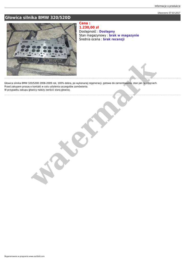 Informacje o produkcie Utworzono 07-03-2017 Głowica silnika BMW 320/520D Cena : 1.230,00 zł er m ar k Dostępność : Dostępny Stan magazynowy : brak w magazynie Średnia ocena : brak recenzji w at Głowica silnika BMW 320/520D 2006-2009 rok, 100% dobra, po wykonanej regeneracji, gotowa do zamontowania, stan jak na zdjęciach. Przed zakupem proszę o kontakt w celu ustalenia szczegułów zamówienia. W przypadku zakupu głowicy należy zwrócić starą głowicę. Wygenerowano w programie www.oscGold.com