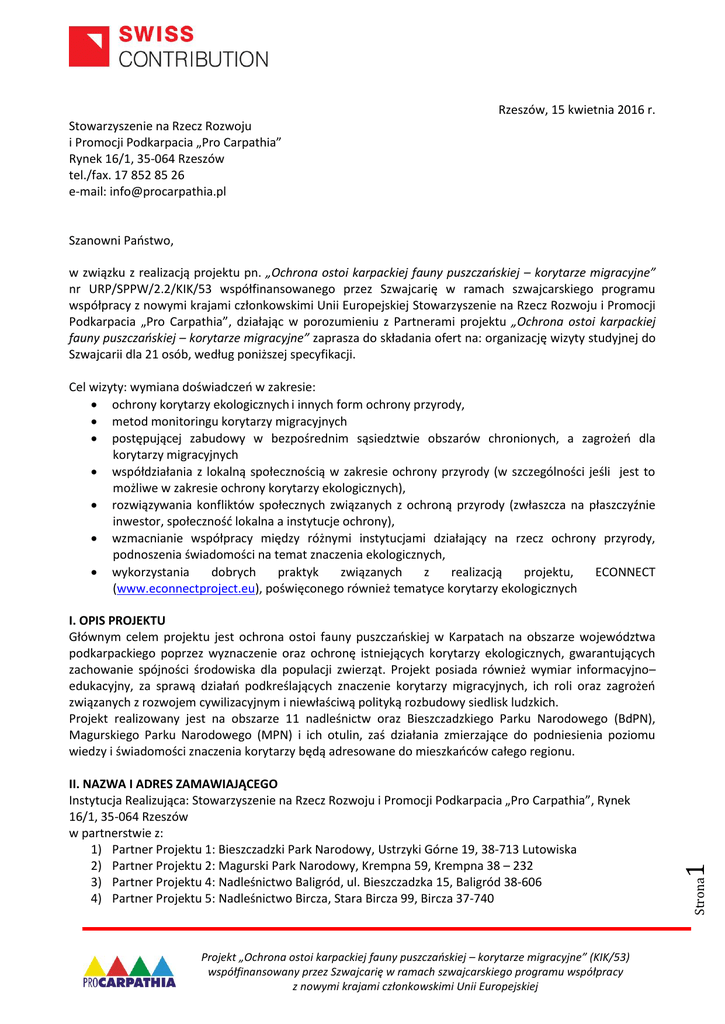 Rzeszów, 15 kwietnia 2016 r. Stowarzyszenie na Rzecz Rozwoju i Promocji Podkarpacia „Pro Carpathia” Rynek 16/1, 35-064 Rzeszów tel./fax. 17 852 85 26 e-mail: [email protected] Szanowni Państwo, w związku z realizacją projektu pn. „Ochrona ostoi karpackiej fauny puszczańskiej – korytarze migracyjne” nr URP/SPPW/2.2/KIK/53 współfinansowanego przez Szwajcarię w ramach szwajcarskiego programu współpracy z nowymi krajami członkowskimi Unii Europejskiej Stowarzyszenie na Rzecz Rozwoju i Promocji Podkarpacia „Pro Carpathia”, działając w porozumieniu z Partnerami projektu „Ochrona ostoi karpackiej fauny puszczańskiej – korytarze migracyjne” zaprasza do składania ofert na: organizację wizyty studyjnej do Szwajcarii dla 21 osób, według poniższej specyfikacji. Cel wizyty: wymiana doświadczeń w zakresie: ochrony korytarzy ekologicznych i innych form ochrony przyrody, metod monitoringu korytarzy migracyjnych postępującej zabudowy w bezpośrednim sąsiedztwie obszarów chronionych, a zagrożeń dla korytarzy migracyjnych współdziałania z lokalną społecznością w zakresie ochrony przyrody (w szczególności jeśli jest to możliwe w zakresie ochrony korytarzy ekologicznych), rozwiązywania konfliktów społecznych związanych z ochroną przyrody (zwłaszcza na płaszczyźnie inwestor, społeczność lokalna a instytucje ochrony), wzmacnianie współpracy między różnymi instytucjami działający na rzecz ochrony przyrody, podnoszenia świadomości na temat znaczenia ekologicznych, wykorzystania dobrych praktyk związanych z realizacją projektu, ECONNECT (www.econnectproject.eu), poświęconego również tematyce korytarzy ekologicznych Projekt „Ochrona ostoi karpackiej fauny puszczańskiej – korytarze migracyjne” (KIK/53) współfinansowany przez Szwajcarię w ramach szwajcarskiego programu współpracy z nowymi krajami członkowskimi Unii Europejskiej Strona II. NAZWA I ADRES ZAMAWIAJĄCEGO Instytucja Realizująca: Stowarzyszenie na Rzecz Rozwoju i Promocji Podkarpacia „Pro Carpathia”, Rynek 16/1, 35-064 Rzeszów w partnerstwie z: 1) Partner Projektu 1: Bieszczadzki Park Narodowy, Ustrzyki Górne 19, 38-713 Lutowiska 2) Partner Projektu 2: Magurski Park Narodowy, Krempna 59, Krempna 38 – 232 3) Partner Projektu 4: Nadleśnictwo Baligród, ul. Bieszczadzka 15, Baligród 38-606 4) Partner Projektu 5: Nadleśnictwo Bircza, Stara Bircza 99, Bircza 37-740 1 I. OPIS PROJEKTU Głównym celem projektu jest ochrona ostoi fauny puszczańskiej w Karpatach na obszarze województwa podkarpackiego poprzez wyznaczenie oraz ochronę istniejących korytarzy ekologicznych, gwarantujących zachowanie spójności środowiska dla populacji zwierząt. Projekt posiada również wymiar informacyjno– edukacyjny, za sprawą działań podkreślających znaczenie korytarzy migracyjnych, ich roli oraz zagrożeń związanych z rozwojem cywilizacyjnym i niewłaściwą polityką rozbudowy siedlisk ludzkich. Projekt realizowany jest na obszarze 11 nadleśnictw oraz Bieszczadzkiego Parku Narodowego (BdPN), Magurskiego Parku Narodowego (MPN) i ich otulin, zaś działania zmierzające do podniesienia poziomu wiedzy i świadomości znaczenia korytarzy będą adresowane do mieszkańców całego regionu. 5) Partner Projektu 6: Nadleśnictwo Cisna, Cisna 87A, Cisna 38-607 6) Partner Projektu 7: Nadleśnictwo Dukla, ul. Popardy 44, Równe 38-451 7) Partner Projektu 8: Nadleśnictwo Komańcza, Komańcza 125, Komańcza 38-543 8) Partner Projektu 9: Nadleśnictwo Lesko, Łączki 8, Lesko 38-600 9) Partner Projektu 10: Nadleśnictwo Lutowiska, 38-713 Lutowiska 4 10) Partner Projektu 11: Nadleśnictwo Rymanów, ul. Dworska 38, Rymanów 38-480 11) Partner Projektu 12: Nadleśnictwo Stuposiany, Stuposiany 4, Lutowiska 38-713 12) Partner Projektu 13: Nadleśnictwo Ustrzyki Dolne, ul. Rynek 6, Ustrzyki Dolne 38-700 13) Partner Projektu 16: Nadleśnictwo Kołaczyce, Nawsie Kołaczyckie 317, 38-213 Kołaczyce Zgodnie z zawartym porozumieniem pomiędzy Partnerami, Wykonawca obciąży kosztami wizyty podmioty wskazane powyżej. Koszt przypadający na Partnera Projektu = (Koszty całej wizyty studyjnej / Liczbę wszystkich osób uczestniczących w wizycie studyjne) * liczba osób uczestniczących w wizycie studyjnej po stronie Partnera Projektu. 1) Instytucja Realizująca: Stowarzyszenie na Rzecz Rozwoju i Promocji Podkarpacia „Pro Carpathia”: 6 osób 2) Partner Projektu 1: Bieszczadzki Park Narodowy: 2 osoby 3) Partner Projektu 2: Magurski Park Narodowy: 2 osoby 4) Partner Projektu 4: Nadleśnictwo Baligród: 1 osoba 5) Partner Projektu 5: Nadleśnictwo Bircza: 1 osoba 6) Partner Projektu 6: Nadleśnictwo Cisna: 1 osoba 7) Partner Projektu 7: Nadleśnictwo Dukla: 1 osoba 8) Partner Projektu 8: Nadleśnictwo Komańcza: 1 osoba 9) Partner Projektu 9: Nadleśnictwo Lesko: 1 osoba 10) Partner Projektu 10: Nadleśnictwo Lutowiska: 1 osoba 11) Partner Projektu 11: Nadleśnictwo Rymanów: 1 osoba 12) Partner Projektu 12: Nadleśnictwo Stuposiany: 1 osoba 13) Partner Projektu 13: Nadleśnictwo Ustrzyki Dolne: 1 osoba 14) Partner Projektu 16: Nadleśnictwo Kołaczyce: 1 osoba III. TRYB ZAMÓWIENIA Postępowanie prowadzone jest w trybie zapytania ofertowego w toku realizacji projektu „Ochrona ostoi karpackiej fauny puszczańskiej – korytarze migracyjne” nr KIK/53 z zachowaniem zasady konkurencyjności. Projekt „Ochrona ostoi karpackiej fauny puszczańskiej – korytarze migracyjne” (KIK/53) współfinansowany przez Szwajcarię w ramach szwajcarskiego programu współpracy z nowymi krajami członkowskimi Unii Europejskiej Strona Wykonawca musi uwzględnić w programie wizyty studyjnej spotkania w następujących miejscach: Kanton Graubunden - wizyta terenowa w Szwajcarskim Parku Narodowym oraz spotkanie z przedstawicielami Parku (w tym prezentacja doświadczeń związanych z projektem ECONNECT, prezentacja Parku oraz prowadzonych w nim projektów), Kanton Valais - wizyta terenowa i spo