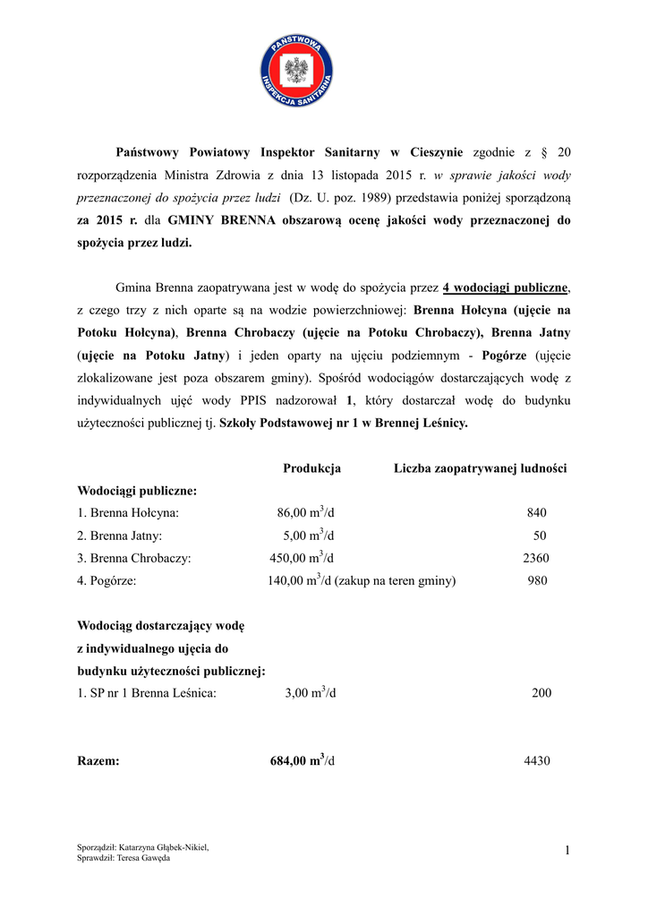 Państwowy Powiatowy Inspektor Sanitarny w Cieszynie zgodnie z § 20 rozporządzenia Ministra Zdrowia z dnia 13 listopada 2015 r. w sprawie jakości wody przeznaczonej do spożycia przez ludzi (Dz. U. poz. 1989) przedstawia poniżej sporządzoną za 2015 r. dla GMINY BRENNA obszarową ocenę jakości wody przeznaczonej do spożycia przez ludzi. Gmina Brenna zaopatrywana jest w wodę do spożycia przez 4 wodociągi publiczne, z czego trzy z nich oparte są na wodzie powierzchniowej: Brenna Hołcyna (ujęcie na Potoku Hołcyna), Brenna Chrobaczy (ujęcie na Potoku Chrobaczy), Brenna Jatny (ujęcie na Potoku Jatny) i jeden oparty na ujęciu podziemnym - Pogórze (ujęcie zlokalizowane jest poza obszarem gminy). Spośród wodociągów dostarczających wodę z indywidualnych ujęć wody PPIS nadzorował 1, który dostarczał wodę do budynku użyteczności publicznej tj. Szkoły Podstawowej nr 1 w Brennej Leśnicy. Produkcja Liczba zaopatrywanej ludności Wodociągi publiczne: 1. Brenna Hołcyna: 2. Brenna Jatny: 3. Brenna Chrobaczy: 4. Pogórze: 86,00 m3/d 840 5,00 m3/d 50 450,00 m3/d 2360 3 140,00 m /d (zakup na teren gminy) 980 Wodociąg dostarczający wodę z indywidualnego ujęcia do budynku użyteczności publicznej: 1. SP nr 1 Brenna Leśnica: Razem: Sporządził: Katarzyna Głąbek-Nikiel, Sprawdził: Teresa Gawęda 3,00 m3/d 200 684,00 m3/d 4430 1 Na teren gminy, wodę przeznaczoną do spożycia dostarczają następujący producenci wody: 1) Zakład Budżetowy Gospodarki Komunalnej w Brennej, ul. Wyzwolenia 34, 43-438 Brenna (producent wody dla wodociągów Brenna Hołcyna, Brenna Jatny oraz Pogórze – od studzienki zakupowej w Górkach Małych) 2) Spółka Wodna Brenna – Chrobaczy – Centrum, ul. Wyzwolenia 75, 43-438 Brenna (producent wody dla wodociągu Brenna Chrobaczy) 3) Wodociągi Ziemi Cieszyńskiej Sp. z o.o. w Ustroniu, ul. Myśliwska 10, 43- 450 Ustroń (producent wody m.in. dla wodociągu Pogórze – do studzienki zakupowej w Górkach Małych) 4) Szkoła Podstawowa nr 1 im. Janusza Korczaka w Brennej, ul. Leśnica 103 43-438 Brenna (Podmiot wykorzystujący wodę pochodzącą z indywidualnego ujęcia w budynku użyteczności publicznej). W 2015r., około 40% mieszkańców gminy korzystało z wody pochodzącej z wodociągów będących pod stała kontrolą zarówno Państwowej Inspekcji Sanitarnej jak i przedsiębiorców wodociągowych. W stosunku do ubiegłego roku, liczba mieszkańców korzystających z wody wodociągowej zwiększyła się o 2% (miał na to wpływ wzrost ogólnej liczby mieszkańców w gminie, jak również wzrost liczy ludności korzystającej z wody wodociągowej). Badania jakości wody prowadzone były regularnie przez cały rok, zarówno przez Państwową Inspekcję Sanitarną, jak i właściwych przedsiębiorców wodociągowych, w 11 punktach monitoringowych zlokalizowanych u odbiorców wody (8) oraz w stacjach uzdatniania wody (3). Realizując monitoring kontrolny i przeglądowy pobrano łącznie 36 próbek wody: w tym 35 do badań mikrobiologicznych i 35 do badań fizykochemicznych (18 w ramach kontroli urzędowej PPIS w Cieszynie oraz 17 w ramach kontroli wewnętrznej przedsiębiorców wodociągowych). Z 35 pobranych do badań mikrobiologicznych próbek wody, kwestionowano 1 próbkę pochodzącą z wodociągu Pogórze, pobraną przez ZBGK w Brennej, w ramach kontroli wewnętrznej. Badanie wykazało nieprawidłowe zmiany dla ogólnej liczby mikroorganizmów w 22 +/- 2 st. C po 72 h. Kwestionowany parametr należał do grupy dodatkowych wymagań mikrobiologicznych, jakim powinna odpowiadać woda do spożycia. Przedsiębiorca Sporządził: Katarzyna Głąbek-Nikiel, Sprawdził: Teresa Gawęda 2 wodociągowy natychmiast podjął działania naprawcze, przeprowadził płukanie w rejonie punktu poboru próbki wody, po których pobrał próbkę wody do badań powtórnych, z których przedstawił niekwestionowany wynik. W związku z powyższym przekroczenie to było krótkotrwałe i uznane zostało za incydentalne. Z 35 pobranych próbek wody do badań fizykochemicznych kwestionowano 7 próbek. Przyczynę powyższego stanowiły niskie stężenie magnezu i niskie wartości twardości ogólnej pobranych próbek wody. Niskie wartości magnezu w wodzie wodociągowej na terenie Gminy Brenna stwierdzane były już w latach ubiegłych, w związku z powyższym w dalszym ciągu celowym jest stosowanie przez mieszkańców żywności bogatej lub wzbogaconej w przyswajalny magnez. Wyniki badań twardości ogólnej wody nie wykazały zmian w stosunku do lat ubiegłych. Reasumując wodociągi w gminie Brenna dostarczają swoim odbiorcom wodę miękką i bardzo miękką. Wodociąg Brenna Chrobaczy Brenna Hołcyna Brenna Jatny Pogórze Szkoła Podstawowa nr 1 im. Janusza Korczaka w Brennej Twardość wody woda bardzo miękka woda bardzo miękka woda bardzo miękka woda miękka woda bardzo miękka W związku ze stwierdzanymi niskimi stężeniami magnezu oraz twardości ogólnej przedsiębiorcy wodociągowi nie podejmowali działań naprawczych, gdyż obowiązujący akt prawny nie nakłada na przedsiębiorców wodociągowych obowiązku uzupełniania tych wartości do wymagalnej wartości minimalnej. Sporządził: Katarzyna Głąbek-Nikiel, Sprawdził: Teresa Gawęda 3 Po przeanalizowaniu wszystkich wyników badań wody przeznaczonej do spożycia, wykonanych w okresie od 1 stycznia 2015 r. do 31 grudnia 2015 r. PPIS w Cieszynie stwierdził przydatność wody do spożycia dostarczanej przez nadzorowane wodociągi mieszkańcom gminy Brenna Wodociąg Jakość wody Sposób uzdatniania i dezynfekcji wody przydatna do spożycia ujęcie powierzchniowe, sposób uzdatniania: filtracja, dezynfekcja chemiczna, dezynfekcja fizyczna przydatna do spożycia ujęcie powierzchniowe, sposób uzdatniania: filtracja, dezynfekcja chemiczna, przydatna do spożycia ujęcie powierzchniowe, sposób uzdatniania: filtracja, dezynfekcja fizyczna przydatna do spożycia ujęcie podziemne, sposób u