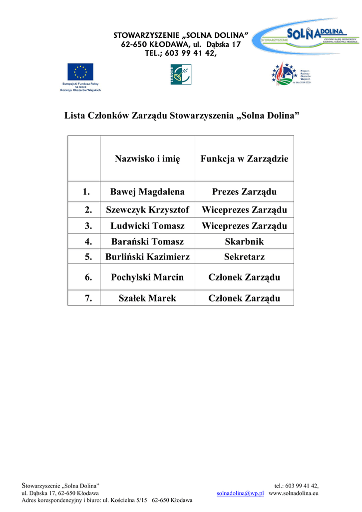 STOWARZYSZENIE „SOLNA DOLINA” 62-650 KŁODAWA, ul. Dąbska 17 TEL.; 603 99 41 42, Lista Członków Zarządu Stowarzyszenia „Solna Dolina” Nazwisko i imię Funkcja w Zarządzie 1. Bawej Magdalena Prezes Zarządu 2. Szewczyk Krzysztof Wiceprezes Zarządu 3. Ludwicki Tomasz Wiceprezes Zarządu 4. Barański Tomasz Skarbnik 5. Burliński Kazimierz Sekretarz 6. Pochylski Marcin Członek Zarządu 7. Szałek Marek Członek Zarządu Stowarzyszenie „Solna Dolina” ul. Dąbska 17, 62-650 Kłodawa Adres korespondencyjny i biuro: ul. Kościelna 5/15 62-650 Kłodawa tel.: 603 99 41 42, [email protected] www.solnadolina.eu