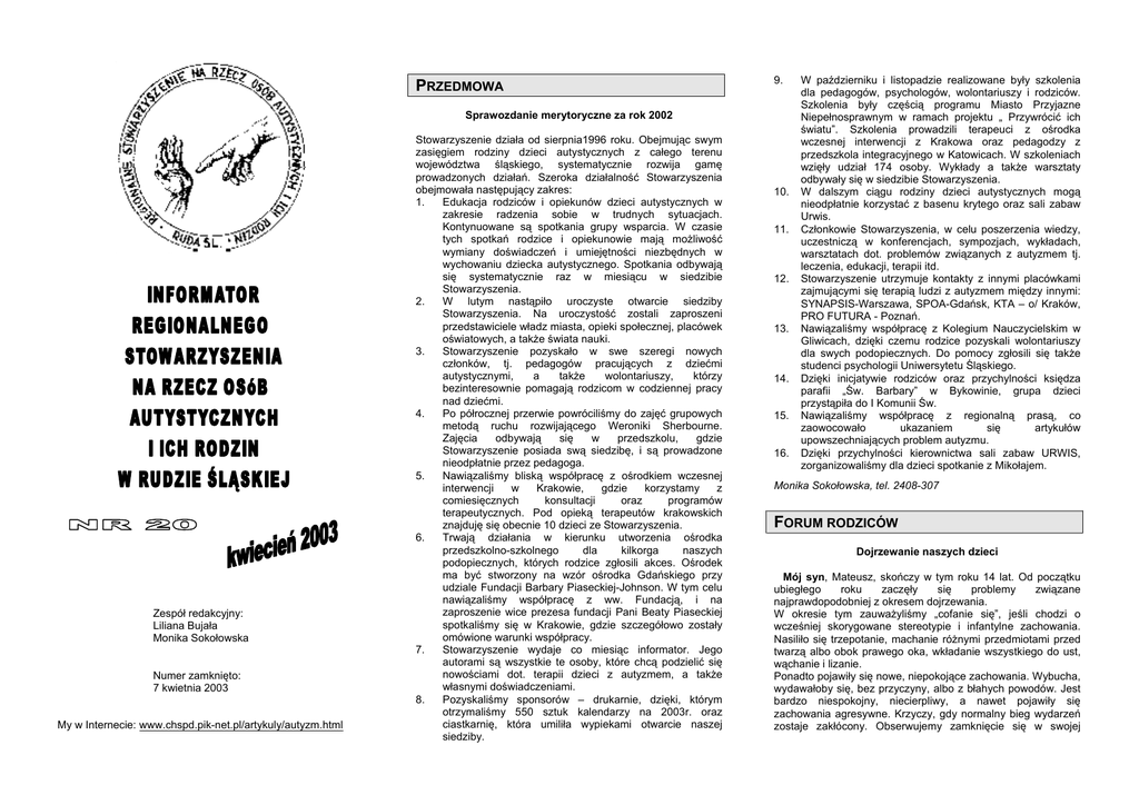 PRZEDMOWA 9. Sprawozdanie merytoryczne za rok 2002 Zespół redakcyjny: Liliana Bujała Monika Sokołowska Numer zamknięto: 7 kwietnia 2003 My w Internecie: www.chspd.pik-net.pl/artykuly/autyzm.html Stowarzyszenie działa od sierpnia1996 roku. Obejmując swym zasięgiem rodziny dzieci autystycznych z całego terenu województwa śląskiego, systematycznie rozwija gamę prowadzonych działań. Szeroka działalność Stowarzyszenia obejmowała następujący zakres: 1. Edukacja rodziców i opiekunów dzieci autystycznych w zakresie radzenia sobie w trudnych sytuacjach. Kontynuowane są spotkania grupy wsparcia. W czasie tych spotkań rodzice i opiekunowie mają możliwość wymiany doświadczeń i umiejętności niezbędnych w wychowaniu dziecka autystycznego. Spotkania odbywają się systematycznie raz w miesiącu w siedzibie Stowarzyszenia. 2. W lutym nastąpiło uroczyste otwarcie siedziby Stowarzyszenia. Na uroczystość zostali zaproszeni przedstawiciele władz miasta, opieki społecznej, placówek oświatowych, a także świata nauki. 3. Stowarzyszenie pozyskało w swe szeregi nowych członków, tj. pedagogów pracujących z dziećmi wolontariuszy, którzy autystycznymi, a także bezinteresownie pomagają rodzicom w codziennej pracy nad dziećmi. 4. Po półrocznej przerwie powróciliśmy do zajęć grupowych metodą ruchu rozwijającego Weroniki Sherbourne. Zajęcia odbywają się w przedszkolu, gdzie Stowarzyszenie posiada swą siedzibę, i są prowadzone nieodpłatnie przez pedagoga. 5. Nawiązaliśmy bliską współpracę z ośrodkiem wczesnej interwencji w Krakowie, gdzie korzystamy z comiesięcznych konsultacji oraz programów terapeutycznych. Pod opieką terapeutów krakowskich znajduję się obecnie 10 dzieci ze Stowarzyszenia. 6. Trwają działania w kierunku utworzenia ośrodka przedszkolno-szkolnego dla kilkorga naszych podopiecznych, których rodzice zgłosili akces. Ośrodek ma być stworzony na wzór ośrodka Gdańskiego przy udziale Fundacji Barbary Piaseckiej-Johnson. W tym celu nawiązaliśmy współpracę z ww. Fundacją, i na zaproszenie wice prezesa fundacji Pani Beaty Piaseckiej spotkaliśmy się w Krakowie, gdzie szczegółowo zostały omówione warunki współpracy. 7. Stowarzyszenie wydaje co miesiąc informator. Jego autorami są wszystkie te osoby, które chcą podzielić się nowościami dot. terapii dzieci z autyzmem, a także własnymi doświadczeniami. 8. Pozyskaliśmy sponsorów – drukarnie, dzięki, którym otrzymaliśmy 550 sztuk kalendarzy na 2003r. oraz ciastkarnię, która umiliła wypiekami otwarcie naszej siedziby. 10. 11. 12. 13. 14. 15. 16. W październiku i listopadzie realizowane były szkolenia dla pedagogów, psychologów, wolontariuszy i rodziców. Szkolenia były częścią programu Miasto Przyjazne Niepełnosprawnym w ramach projektu „ Przywrócić ich światu”. Szkolenia prowadzili terapeuci z ośrodka wczesnej interwencji z Krakowa oraz pedagodzy z przedszkola integracyjnego w Katowicach. W szkoleniach wzięły udział 174 osoby. Wykłady a także warsztaty odbywały się w siedzibie Stowarzyszenia. W dalszym ciągu rodziny dzieci autystycznych mogą nieodpłatnie korzystać z basenu krytego oraz sali zabaw Urwis. Członkowie Stowarzyszenia, w celu poszerzenia wiedzy, uczestniczą w konferencjach, sympozjach, wykładach, warsztatach dot. problemów związanych z autyzmem tj. leczenia, edukacji, terapii itd. Stowarzyszenie utrzymuje kontakty z innymi placówkami zajmującymi się terapią ludzi z autyzmem między innymi: SYNAPSIS-Warszawa, SPOA-Gdańsk, KTA – o/ Kraków, PRO FUTURA - Poznań. Nawiązaliśmy współpracę z Kolegium Nauczycielskim w Gliwicach, dzięki czemu rodzice pozyskali wolontariuszy dla swych podopiecznych. Do pomocy zgłosili się także studenci psychologii Uniwersytetu Śląskiego. Dzięki inicjatywie rodziców oraz przychylności księdza parafii „Św. Barbary” w Bykowinie, grupa dzieci przystąpiła do I Komunii Św. Nawiązaliśmy współpracę z regionalną prasą, co zaowocowało ukazaniem się artykułów upowszechniających problem autyzmu. Dzięki przychylności kierownictwa sali zabaw URWIS, zorganizowaliśmy dla dzieci spotkanie z Mikołajem. Monika Sokołowska, tel. 2408-307 FORUM RODZICÓW Dojrzewanie naszych dzieci Mój syn, Mateusz, skończy w tym roku 14 lat. Od początku ubiegłego roku zaczęły się problemy związane najprawdopodobniej z okresem dojrzewania. W okresie tym zauważyliśmy „cofanie się”, jeśli chodzi o wcześniej skorygowane stereotypie i infantylne zachowania. Nasiliło się trzepotanie, machanie różnymi przedmiotami przed twarzą albo obok prawego oka, wkładanie wszystkiego do ust, wąchanie i lizanie. Ponadto pojawiły się nowe, niepokojące zachowania. Wybucha, wydawałoby się, bez przyczyny, albo z błahych powodów. Jest bardzo niespokojny, niecierpliwy, a nawet pojawiły się zachowania agresywne. Krzyczy, gdy normalny bieg wydarzeń zostaje zakłócony. Obserwujemy zamknięcie się w swojej własnej fizyczności, gdzie kilka stereotypowych ruchów może dostarczyć mu przyjemności. Leży na brzuchu i delikatnie porusza się, albo leżąc pod kocem dotyka swoich narządów płciowych (rodzaj masturbacji). Zachowania te pojawiają się, kiedy nie ma co robić. Męczące również jest ciągłe odczuwanie przez syna nieugaszalnego pragnienia, zmuszające nas do zabierania „picia” (głównie herbaty, tylko ciepłej) w każde miejsce. Zanim syn wszedł w wiek dorastania, kierując się zasłyszanymi opiniami osób trzecich, spodziewałam się problemów - ale chyba nie aż takich. Tym bardziej, że w literaturze pisano również o przypadkach cudownej poprawy zachowań, a nawet ilorazu inteligencji. Staramy się z synem pracować jak dotychczas. Pomimo, że głośno manifestował swoje niezadowolenie z pobytu w szkole, nadal uczęszcza na wybrane zajęcia (chociaż niekiedy obecność opiekuna jest konieczna). Staramy się, aby nie popadał w nudę,