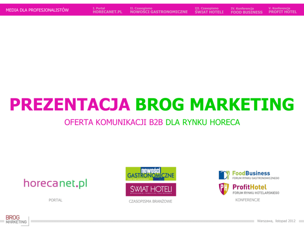 MEDIA DLA PROFESJONALISTÓW I. Portal HORECANET.PL II. Czasopismo NOWOŚCI GASTRONOMICZNE III. Czasopismo ŚWIAT HOTELI IV. Konferencja FOOD BUSINESS V. Konferencja PROFIT HOTEL PREZENTACJA BROG MARKETING OFERTA KOMUNIKACJI B2B DLA RYNKU HORECA PORTAL CZASOPISMA BRANŻOWE KONFERENCJE Warszawa, listopad 2012 MEDIA DLA PROFESJONALISTÓW I. Portal HORECANET.PL II. Czasopismo NOWOŚCI GASTRONOMICZNE III. Czasopismo ŚWIAT HOTELI O NAS BROG Marketing Sp. z o.o. S.K. jest wiodącą firmą komunikacji biznesowej w Polsce. Od 15 lat dostarczamy aktualne informacje rynkowe zapewniając profesjonalny kanał komunikacji B2B dla ponad 10 000 firm i instytucji. Nasza oferta trafia wprost do wyspecjalizowanego grona profesjonalistów – zarządów, menedżerów oraz przedsiębiorców działających na rynkach: horeca – hotele, restauracje, catering stacji benzynowych & conveniece store szpitali i placówek medycznych IV. Konferencja FOOD BUSINESS V. Konferencja PROFIT HOTEL MEDIA DLA PROFESJONALISTÓW I. Portal HORECANET.PL II. Czasopismo NOWOŚCI GASTRONOMICZNE III. Czasopismo ŚWIAT HOTELI IV. Konferencja FOOD BUSINESS V. Konferencja PROFIT HOTEL PRODUKTY EFEKTYWNEJ KOMUNIKACJI B2B – GRUPA DOCELOWA CZASOPISMA NASZYMI ODBIORCAMI SĄ WYŁĄCZNIE KONFERENCJE OSOBY DECYZYJNE PROFESJONALIŚCI PORTAL BRANŻY GASTRONOMICZNEJ I HOTELARSKIEJ MEDIA DLA PROFESJONALISTÓW I. Portal HORECANET.PL II. Czasopismo NOWOŚCI GASTRONOMICZNE III. Czasopismo ŚWIAT HOTELI IV. Konferencja FOOD BUSINESS OFERTA PORTALU RYNKU GASTRONOMICZNEGO I HOTELARSKIEGO V. Konferencja PROFIT HOTEL MEDIA DLA PROFESJONALISTÓW I. Portal HORECANET.PL II. Czasopismo NOWOŚCI GASTRONOMICZNE III. Czasopismo ŚWIAT HOTELI IV. Konferencja FOOD BUSINESS V. Konferencja PROFIT HOTEL PORTAL – CZYM JEST? Profesjonalnym źródłem najświeższych informacji dla osób zarządzających oraz profesjonalistów rynku gastronomicznego i hotelarskiego. Nasz newsroom, każdego dnia, dostarcza najbardziej aktualne i praktyczne informacje dla przedstawicieli branży. Profesjonaliści rynku horeca rozpoczynają swój dzień od lektury newslettera i odwiedzin naszego portalu. To idealne miejsce w sieci na prezentację oferty Państwa firmy. MEDIA DLA PROFESJONALISTÓW I. Portal HORECANET.PL II. Czasopismo NOWOŚCI GASTRONOMICZNE III. Czasopismo ŚWIAT HOTELI IV. Konferencja FOOD BUSINESS V. Konferencja PROFIT HOTEL PORTAL – UŻYTKOWNICY Portal skierowany jest do kadry zarządzającej oraz profesjonalistów związanych z szeroko pojętym rynkiem horeca. zarządzający oraz właściciele: - sieci gastronomicznych firm cateringowych restauracji i kawiarni niezależnych firm oferujących wyposażenie lub usługi dla rynku gastronomicznego - uzdrowisk właściciele spółek inwestujących w obiekty noclegowe sieci hotelarskie, hotele niezależne, uzdrowiska osoby zarządzające w firmach obszaru usług dla rynku HoReCa portal w liczbach Miesięczna liczba odsłon 82 412 Subskrybenci newslettera 13 500 Liczba unikalnych użytkowników 33 917 Dane: gemiusTraffic marzec 2011 Profesjonaliści rynku horeca rozpoczynają swój dzień od lektury newslettera i odwiedzin naszego portalu. To idealne miejsce w sieci na prezentację oferty Państwa firmy. MEDIA DLA PROFESJONALISTÓW I. Portal HORECANET.PL II. Czasopismo NOWOŚCI GASTRONOMICZNE III. Czasopismo ŚWIAT HOTELI IV. Konferencja FOOD BUSINESS PORTAL – SEKCJE TEMATYCZNE TEMAT DNIA ARTYKUŁY WG KATEGORII NAJCZĘŚCIEJ CZYTANE KOMENTARZ DNIA V. Konferencja PROFIT HOTEL MEDIA DLA PROFESJONALISTÓW I. Portal HORECANET.PL II. Czasopismo NOWOŚCI GASTRONOMICZNE III. Czasopismo ŚWIAT HOTELI IV. Konferencja FOOD BUSINESS V. Konferencja PROFIT HOTEL PORTAL – SEKCJE TEMATYCZNE NEWSOWE MATERIAŁY VIDEO W CENTRUM UWAGI KALENDARIUM NAJNOWSZE PLIKI PARTNERÓW PORTALU MEDIA DLA PROFESJONALISTÓW I. Portal HORECANET.PL II. Czasopismo NOWOŚCI GASTRONOMICZNE PORTAL – NEWSLETTER Codziennie, ok. godz. 10.00, do poczty elektronicznej naszych subskrybentów trafia oczekiwany newsletter horecanet.pl zawierający pakiet najbardziej aktualnych informacji dla profesjonalistów branży. Rozrastająca się baza subskrybentów to precyzyjna grupa odbiorców Państwa reklamy. Zapraszamy do naszej oferty mailingowej. III. Czasopismo ŚWIAT HOTELI IV. Konferencja FOOD BUSINESS V. Konferencja PROFIT HOTEL MEDIA DLA PROFESJONALISTÓW I. Portal HORECANET.PL II. Czasopismo NOWOŚCI GASTRONOMICZNE III. Czasopismo ŚWIAT HOTELI IV. Konferencja FOOD BUSINESS V. Konferencja PROFIT HOTEL PORTAL – KORZYŚCI OFERTY Dotarcie do kadry zarządzającej, właścicieli firm oraz profesjonalistów związanych z polskim rynkiem horeca, zainteresowanych tematyką oraz reklamą z obszarów: nowych inwestycji – budowy i modernizacji obiektów, rozwoju sieci – zakupu wyposażenia i sprzętu do placówek HoReCa usług gastronomii, hoteli i obiektów noclegowych – oprogramowania i sprzętu IT – utrzymania czystości, prania, cateringu, zapewnienia bezpieczeństwa prawa i finansów – rozwiązań prawnych regulujących działalność rynku – finansowania działalności – usług doradczych i finansowych działalności gastronomicznej, hoteli i obiektów noclegowych – podnoszenia jakości usług i atrakcyjności obiektów – stosowania nowych technologii usług dla biznesu – branża FINANSE i UBEZPIECZENIA: kredyty, polisy itp. – branża TELEKOMUNIKACJA: aktualności, promocje dla biznesu – branża MOTORYZACJA: auta dostawcze, leasing itp. – usługi franczyzowe Każdego dnia trafiamy z najświeższymi informacjami wprost do Państwa potencjalnych klientów! MEDIA DLA PROFESJONALISTÓW I. Portal HORECANET.PL II. Czasopismo NOWOŚCI GASTRONOMICZNE III. Czasopismo ŚWIAT HOTELI IV. Konferencja FOOD BUSINESS V. Konferencja PROFIT HOTEL PODSTAWOWA OFERTA REKLAMOWA – PORTAL MEDIA DLA PROFESJONALISTÓW I. Portal HORECANET.PL II. Czasopismo NOWOŚCI GASTRONOMICZNE III. Czasopismo ŚWIAT HOTELI IV. Konferencja FOOD BUSINESS V. Konferencja PROF
