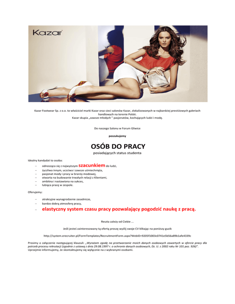 Kazar Footwear Sp. z o.o. to właściciel marki Kazar oraz sieci salonów Kazar, zlokalizowanych w najbardziej prestiżowych galeriach handlowych na terenie Polski. Kazar skupia „zawsze młodych ” pasjonatów, kochających ludzi i modę. Do naszego Salonu w Forum Gliwice poszukujemy OSÓB DO PRACY posiadających status studenta Idealny kandydat to osoba: szacunkiem odnosząca się z najwyższym do ludzi, życzliwa innym, uczciwa i zawsze uśmiechnięta, pasjonat mody i pracy w branży modowej, otwarta na budowanie trwałych relacji z Klientami, ambitna i nastawiona na sukces, lubiąca pracę w zespole. Oferujemy: atrakcyjne wynagrodzenie zasadnicze, bardzo dobrą atmosferę pracy, elastyczny system czasu pracy pozwalający pogodzić naukę z pracą. Reszta zależy od Ciebie ... Jeśli jesteś zainteresowany tą ofertą proszę wyślij swoje CV klikając na poniższy guzik http://system.erecruiter.pl/FormTemplates/RecruitmentForm.aspx?WebID=9205f1003c0741e5b56a89b1afe4339c Prosimy o załączenie następującej klauzuli: „Wyrażam zgodę na przetwarzanie moich danych osobowych zawartych w ofercie pracy dla potrzeb procesu rekrutacji (zgodnie z ustawą z dnia 29.08.1997 r. o ochronie danych osobowych, Dz. U. z 2002 roku Nr 101 poz. 926)”. Uprzejmie informujemy, że skontaktujemy się wyłącznie na z wybranymi osobami.