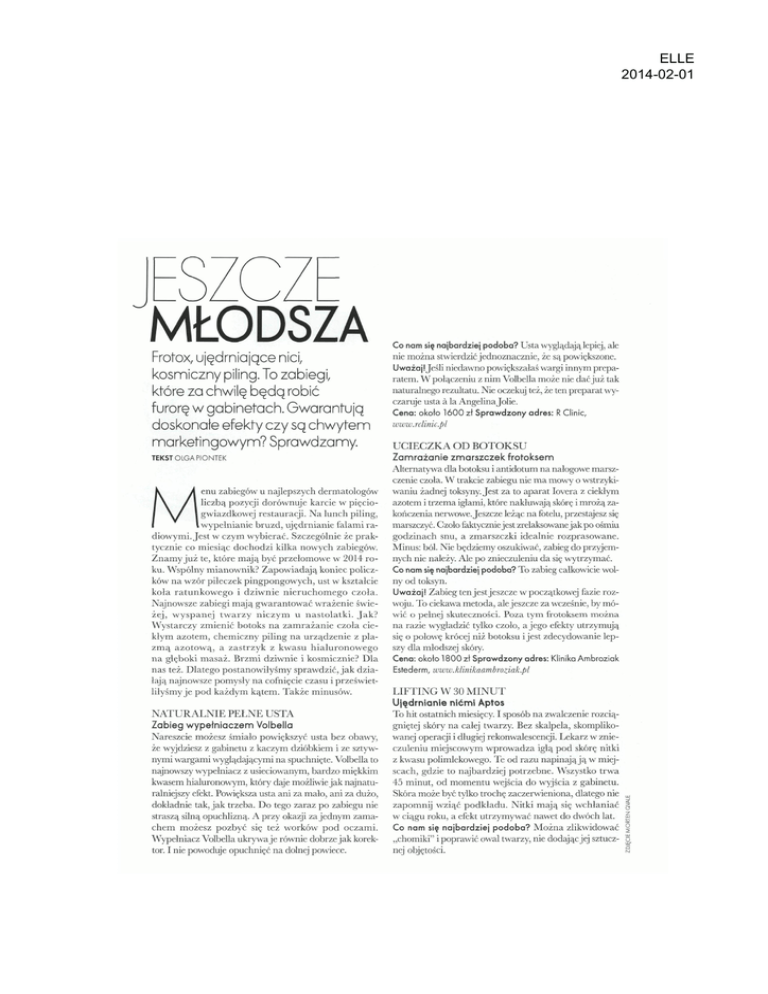 ELLE 2014-02-01 MŁODSZA Frofox, ujędrniające nici, kosmiczny piling. To zabiegi, które za chwilę będą robić furorę w gabinetach. Gwarantują doskonałe efekty czy są chwytem marketingowym? Sprawdzamy. TEKST OLGA PIONTEK enu zabiegów u najlepszych dermatologów liczbą pozycji dorównuje karcie w pięcio gwiazdkowej restauracji. N a lunch piling, I wypełnianie bruzd, ujędrnianie falami ra diowymi. Jest w czym wybierać. Szczególnie że prak tycznie co miesiąc dochodzi kilka nowych zabiegów. Z n a m y już te, które mają być przełomowe w 2014 ro ku. Wspólny mianownik? Zapowiadają koniec policz ków na wzór piłeczek pingpongowych, ust w kształcie koła r a t u n k o w e g o i dziwnie n i e r u c h o m e g o czoła. Najnowsze zabiegi mają gwarantować wrażenie świe żej, w y s p a n e j t w a r z y n i c z y m u n a s t o l a t k i . J a k ? Wystarczy zmienić botoks na z a m r a ż a n i e czoła cie kłym azotem, chemiczny piling n a urządzenie z pla z m ą azotową, a zastrzyk z kwasu h i a l u r o n o w e g o na głęboki masaż. Brzmi dziwnie i kosmicznie? Dla nas też. Dlatego postanowiłyśmy sprawdzić, j a k dzia łają najnowsze pomysły na cofnięcie czasu i przeświet liłyśmy je pod każdym kątem. Także minusów. Co nam się najbardziej podoba? Usta wyglądają lepiej, ale nie można stwierdzić jednoznacznie, że są powiększone. Uważaj! Jeśli niedawno powiększałaś wargi innym prepa ratem. W połączeniu z nim Volbella może nie dać już tak naturalnego rezultatu. Nie oczekuj też, że ten preparat wy czaruje usta a la Angelina Jolie. Cena: około 1600 zł Sprawdzony adres: R Ginie, www.rclinic.pl UCIECZKA OD BOTOKSU Zamrażanie zmarszczek frotoksem Alternatywa dla botoksu i antidotum na nałogowe marsz czenie czoła. W trakcie zabiegu nie m a mowy o wstrzyki waniu żadnej toksyny. Jest za to aparat Iovera z ciekłym azotem i trzema igłami, które nakłuwają skórę i mrożą za kończenia nerwowe. Jeszcze leżąc na fotelu, przestajesz się marszczyć. Czoło faktycznie jest zrelaksowane jak po ośmiu godzinach snu, a zmarszczki idealnie rozprasowane. Minus: ból. Nie będziemy oszukiwać, zabieg do przyjem nych nie należy. Ale po znieczuleniu da się wytrzymać. Co nam się najbardziej podoba? To zabieg całkowicie wol ny od toksyn. Uważaj! Zabieg ten jest jeszcze w początkowej fazie roz woju. To ciekawa metoda, ale jeszcze za wcześnie, by mó wić o pełnej skuteczności. Poza tym frotoksem można na razie wygładzić tylko czoło, a jego efekty utrzymują się o połowę krócej niż botoksu i jest zdecydowanie lep szy dla młodszej skóry. Cena: okoto 1800 zł Sprawdzony adres: Klinika Ambroziak Estederm, www.klinikaambroziak.pl L I F T I N G W 30 M I N U T Ujędrnianie nićmi Aptos NATURALNIE PEŁNE USTA Zabieg wypełniaczem Volbella Nareszcie możesz śmiało powiększyć usta bez obawy, że wyjdziesz z gabinetu z kaczym dzióbkiem i ze sztyw nymi wargami wyglądającymi na spuchnięte. Volbella to najnowszy wypełniacz z usieciowanym, bardzo miękkim kwasem hialuronowym, który daje możliwie jak najnaturalniejszy efekt. Powiększa usta ani za mało, ani za dużo, dokładnie tak, jak trzeba. Do tego zaraz po zabiegu nie straszą silną opuchlizną. A przy okazji za jednym zama chem możesz pozbyć się też worków p o d oczami. Wypełniacz Volbella ukrywa je równie dobrze jak korek tor. I nie powoduje opuchnięć na dolnej powiece. To hit ostatnich miesięcy. I sposób na zwalczenie rozcią gniętej skóry na całej twarzy. Bez skalpela, skompliko wanej operacji i długiej rekonwalescencji. Lekarz w znie czuleniu miejscowym wprowadza igłą p o d skórę nitki z kwasu polimlekowego. Te od razu napinają ją w miej scach, gdzie to najbardziej potrzebne. Wszystko trwa 45 minut, od momentu wejścia do wyjścia z gabinetu. Skóra może być tylko trochę zaczerwieniona, dlatego nie zapomnij wziąć podkładu. Nitki mają się wchłaniać w ciągu roku, a efekt utrzymywać nawet do dwóch lat. Co nam się najbardziej p o d o b a ? M o ż n a zlikwidować „chomiki" i poprawić owal twarzy, nie dodając jej sztucznej objętości. „j g | § 8 8 ELLE 2014-02-01 O* Uważaj! Jeśli masz bardzo cienką skórę. Nitki mogą przez nią prześwitywać. Przy bardzo rozciągniętej nie zastąpi też trady cyjnego liftingu. Cena: od 2 8 0 0 zł Sprawdzony adres: SkinClinic, www.skinclinic.pl KOSMICZNY PILING Złuszczanie aparatem NeoGen Plasma Zabieg przeznaczony dla osób po czter dziestce. Zmniejsza przebarwienia, pory i działa jak minilifting. A to dzięki połą czeniu działania fal radiowych i plazmy azotowej, które silnie pobudzają produk cję kolagenu. I magicznej głowicy, która naświetla nimi każdy centymetr skóry, nie pomijając ani skrawka. Ból? Nie ma, chy ba że patrzysz w lustro po zabiegu. Przez siedem dni skóra łuszczy się jak po bardzo intensywnym pilingu. Potem jednak staje się supergładka i napięta zupełnie jak roz ciągnięte dżinsy po praniu. Nawet na gór nych powiekach. Wystarczy zrobić jeden zabieg, a efekt pogłębia z każdym dniem. I utrzymuje do dwóch lat. Co nam się najbardziej podoba? Kompleksowe działanie na skórę. Uważaj! Jeśli dopiero zdmuchnę łaś trzydziestką świeczkę na torcie to jeszcze zdecydowanie za silny zabieg dla ciebie. Cena: 4 0 0 0 zł Sprawdzony adres: Gabinet Bella Derm, www.bella-derm.pl 1, ZABIEGI rób zawsze z głową. Młody wygląd nie lubi przesady. ODMŁADZAJĄCY PAKIET Rewitalizacja z Restylane SkinLift J u ż nie musisz zaliczać kilku wizyt u dermatologa, aby powiększyć policzki, pozbyć się zmarszczek i zregene rować skórę. T e r a z wystarczy ekspresowy zabieg Restylane SkinLift. D e r m a t o l o g najpierw wypełnia bruzdy i okolicę kości policzkowych preparatem Perlane z gęstym kwasem hialuronowym, a potem ostrzykuje całą twarz rewitalizującą mezoterapią Skinboosters. Skóra od razu wygląda świeżej, promienniej, a wypeł nione ok