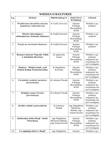 WIEDZA O KULTURZE Lp. TEMAT PROWADZĄCY INSTYTUT, WYDZIAŁ UWAGI 1. Współczesna ukraińska muzyka popularna i alternatywna dr Andrij Saweneć Instytut Filologii Słowiańskiej, WNH Wykład w jęz. polskim Obcość zniewalająca i dr Andrij Saweneć niebezpieczna: dylematy tłumacza Instytut Filologii Słowiańskiej, WNH Wykład w jęz. polskim 2. 3. Poezja na warsztacie tłumacza dr Andrij Saweneć Instytut Filologii Słowiańskiej, WNH Wykład w jęz. polskim 4. Rosyjscy laureaci Nagrody Nobla w dziedzinie literatury dr Agnieszka Lenart Instytut Filologii Słowiańskiej, WNH Wykład w jęz. polskim, znajomość jęz. rosyjskiego nie jest wymagana 5. Moskwa - Władywostok, czyli Podróż Koleją Transsyberyjską dr Magdalena Kawęcka Instytut Filologii Słowiańskiej, WNH Wykład w jęz. polskim, znajomość jęz. rosyjskiego nie jest wymagana 6. Ukraińskie symbole narodowe (prezentacja) dr Lubomir Puszak Instytut Filologii Słowiańskiej, WNH Wykład w jęz. polskim, znajomość jęz. rosyjskiego nie jest wymagana 7. Religijna mapa Ukrainy (prezentacja) dr Lubomir Puszak Instytut Filologii Słowiańskiej, WNH Wykład w jęz. polskim, znajomość jęz. rosyjskiego nie jest wymagana 8. Krótki wykład o prawosławiu dr Lubomyr Pushak mgr Magdalena MichockaBabiuk, mgr Joanna Kozieł Wykład w jęz. polskim, znajomość jęz. rosyjskiego nie jest wymagana 9. Kulturalna stolica Rosji - Sankt Petersburg mgr Magdalena Michocka-Babiuk, mgr Joanna Kozieł Instytut Filologii Słowiańskiej, WNH Wykład w jęz. polskim, znajomość jęz. rosyjskiego nie jest wymagana 10. Co oglądają dzieci w Rosji? mgr Magdalena Instytut Wykład w jęz. Michocka-Babiuk, mgr Joanna Kozieł Filologii Słowiańskiej, WNH polskim, znajomość jęz. rosyjskiego nie jest wymagana 11. Aleksander Sołżenicyn, świadek XX wieku dr Monika Sidor Instytut Filologii Słowiańskiej, WNH Wykład w jęz. polskim, znajomość jęz. rosyjskiego nie jest wymagana 12. Wenecja Północy, czyli niezwykły urok Sankt Petersburga mgr Ewelina JasińskaGrabowska Instytut Filologii Słowiańskiej, WNH Wykład w jęz. polskim, znajomość jęz. rosyjskiego nie jest wymagana