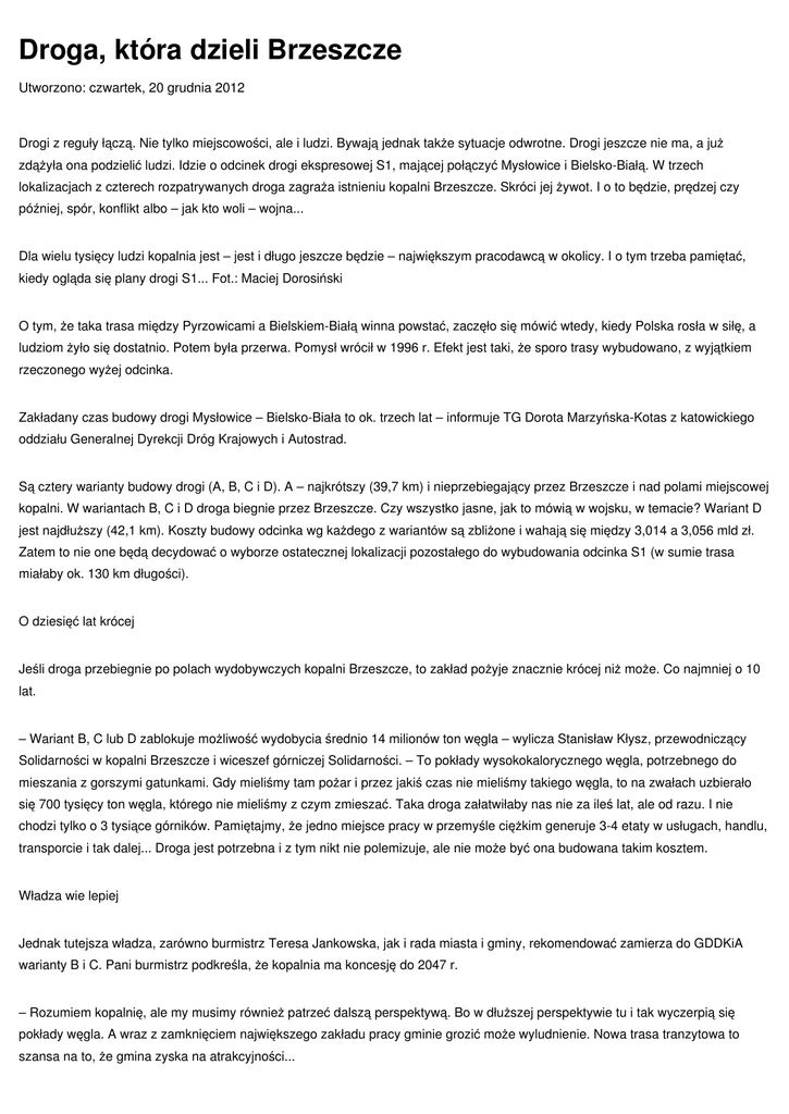 Droga, która dzieli Brzeszcze Utworzono: czwartek, 20 grudnia 2012 Drogi z reguły łączą. Nie tylko miejscowości, ale i ludzi. Bywają jednak także sytuacje odwrotne. Drogi jeszcze nie ma, a już zdążyła ona podzielić ludzi. Idzie o odcinek drogi ekspresowej S1, mającej połączyć Mysłowice i Bielsko-Białą. W trzech lokalizacjach z czterech rozpatrywanych droga zagraża istnieniu kopalni Brzeszcze. Skróci jej żywot. I o to będzie, prędzej czy później, spór, konflikt albo – jak kto woli – wojna... Dla wielu tysięcy ludzi kopalnia jest – jest i długo jeszcze będzie – największym pracodawcą w okolicy. I o tym trzeba pamiętać, kiedy ogląda się plany drogi S1... Fot.: Maciej Dorosiński O tym, że taka trasa między Pyrzowicami a Bielskiem-Białą winna powstać, zaczęło się mówić wtedy, kiedy Polska rosła w siłę, a ludziom żyło się dostatnio. Potem była przerwa. Pomysł wrócił w 1996 r. Efekt jest taki, że sporo trasy wybudowano, z wyjątkiem rzeczonego wyżej odcinka. Zakładany czas budowy drogi Mysłowice – Bielsko-Biała to ok. trzech lat – informuje TG Dorota Marzyńska-Kotas z katowickiego oddziału Generalnej Dyrekcji Dróg Krajowych i Autostrad. Są cztery warianty budowy drogi (A, B, C i D). A – najkrótszy (39,7 km) i nieprzebiegający przez Brzeszcze i nad polami miejscowej kopalni. W wariantach B, C i D droga biegnie przez Brzeszcze. Czy wszystko jasne, jak to mówią w wojsku, w temacie? Wariant D jest najdłuższy (42,1 km). Koszty budowy odcinka wg każdego z wariantów są zbliżone i wahają się między 3,014 a 3,056 mld zł. Zatem to nie one będą decydować o wyborze ostatecznej lokalizacji pozostałego do wybudowania odcinka S1 (w sumie trasa miałaby ok. 130 km długości). O dziesięć lat krócej Jeśli droga przebiegnie po polach wydobywczych kopalni Brzeszcze, to zakład pożyje znacznie krócej niż może. Co najmniej o 10 lat. – Wariant B, C lub D zablokuje możliwość wydobycia średnio 14 milionów ton węgla – wylicza Stanisław Kłysz, przewodniczący Solidarności w kopalni Brzeszcze i wiceszef górniczej Solidarności. – To pokłady wysokokalorycznego węgla, potrzebnego do mieszania z gorszymi gatunkami. Gdy mieliśmy tam pożar i przez jakiś czas nie mieliśmy takiego węgla, to na zwałach uzbierało się 700 tysięcy ton węgla, którego nie mieliśmy z czym zmieszać. Taka droga załatwiłaby nas nie za ileś lat, ale od razu. I nie chodzi tylko o 3 tysiące górników. Pamiętajmy, że jedno miejsce pracy w przemyśle ciężkim generuje 3-4 etaty w usługach, handlu, transporcie i tak dalej... Droga jest potrzebna i z tym nikt nie polemizuje, ale nie może być ona budowana takim kosztem. Władza wie lepiej Jednak tutejsza władza, zarówno burmistrz Teresa Jankowska, jak i rada miasta i gminy, rekomendować zamierza do GDDKiA warianty B i C. Pani burmistrz podkreśla, że kopalnia ma koncesję do 2047 r. – Rozumiem kopalnię, ale my musimy również patrzeć dalszą perspektywą. Bo w dłuższej perspektywie tu i tak wyczerpią się pokłady węgla. A wraz z zamknięciem największego zakładu pracy gminie grozić może wyludnienie. Nowa trasa tranzytowa to szansa na to, że gmina zyska na atrakcyjności... Brzeszcze – wyjaśnia burmistrz – w planie zagospodarowania przestrzennego mają do zaoferowania tereny przemysłowe. Rzecz w tym, że dziś dojazd do nich jest kiepski. S1 – w wariantach B i C – zdaniem władzy zmieniałaby tę sytuację. W wariancie A od drogi do tych terenów byłoby jakieś 3,5 km... Dodaje, że do kasy z tytułu podatków od kopalni wpływa ok. 1,2 mln zł rocznie. Pani burmistrz nie przecenia wpływu z podatków PIT, gdyż nie wszyscy pracownicy mieszkają w gminie, a ten podatek płaci się tam, gdzie się mieszka. Nie ukrywa irytacji rzecznik Kompanii Węglowej, zapytany o komentarz do sprawy. Dobro narodowe – To rząd Polski nie robi strategii rozwoju po roku 2050, a w Brzeszczach burmistrz snuje takie dalekosiężne plany? A tego, że gmina straci szybciej solidny zakład, a ludzie stabilną pracę, już władza gminy pod uwagę nie bierze? – pyta Zbigniew Madej. – Z całym szacunkiem, ale nie sądzę, by na tych przemysłowych terenach w Brzeszczach pojawił się jakiś wielki biznes, większy od kopalni Brzeszcze. Poza tym nie można pozwolić, by na zatracenie poszło tyle milionów ton dobrego węgla. Węgla, który – przypomnę – jest naszym dobrem narodowym! A w kopalni zbierają podpisy pod petycją do GDDKiA. Mają ją przekazać jeszcze w lutym. W styczniu mieli kilka tysięcy podpisów przeciwko wariantom B, C i D. – Jeśli nie zostanie wybrany wariant A, to skończy się to tak, że pracę stracą tysiące ludzi, a w zamian powstanie jedna stacja benzynowa i bar szybkiej obsługi – alarmuje Stanisław Kłysz. Konflikt zaostrza się. Na tyle, że burmistrz złożyła (na stronie gminy) stosowne wyjaśnienie, puentując je następująco: „Ciągle trwa proces projektowy i do dziś nie zapadły żadne decyzje związane z wyborem wariantu przebiegu drogi S1 od węzła Kosztowy II w Mysłowicach do węzła Suchy Potok w Bielsku-Białej”. Trybuna Górnicza pyta W odpowiedzi na pytania TG Dorota Marzyńska-Kotas z Dyrekcji wyjaśnia: „W pierwszym kwartale br. opracowana będzie dokumentacja w zakresie Studium Techniczno-Ekonomiczno-Środowiskowego i materiałów do decyzji środowiskowej dla wszystkich 4 wariantów przebiegu trasy S-1 z Mysłowic do Bielska-Białej. Dokumentacja ta jest niezbędna, aby złożyć wniosek do Regionalnego Dyrektora Ochrony Środowiska o wydanie decyzji o środowiskowych uwarunkowaniach, która to decyzja ostatecznie wyznaczy wariant drogi, który będzie realizowany. Chcielibyśmy uzyskać ją do końca 2013 roku. Inwestycja ta jest ujęta w rządowym Programie Budowy Dróg Krajowych na lata 2011-2015. W związku z tym, że w chwili obecnej trwają prace projektowe (wariantowanie trasy), na 