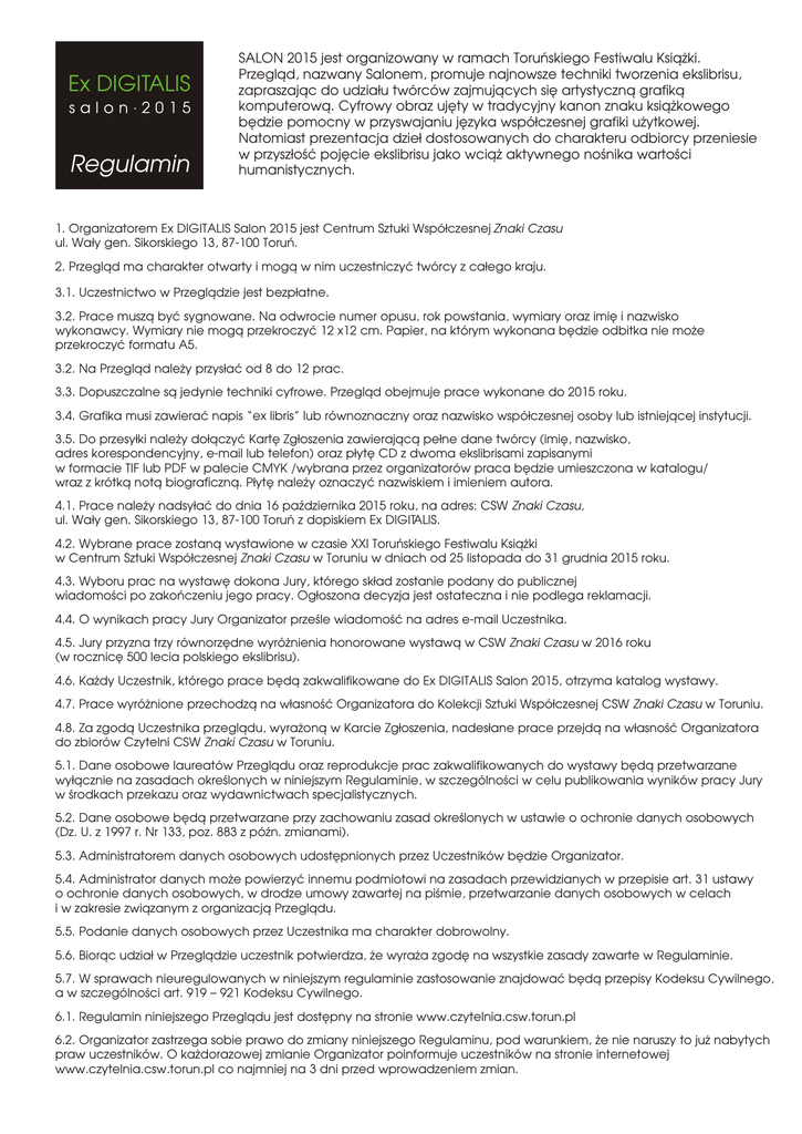 Ex DIGITALIS salon 2015 Regulamin SALON 2015 jest organizowany w ramach Toruñskiego Festiwalu Ksi¹¿ki. Przegl¹d, nazwany Salonem, promuje najnowsze techniki tworzenia ekslibrisu, zapraszaj¹c do udzia³u twórców zajmuj¹cych siê artystyczn¹ grafik¹ komputerow¹. Cyfrowy obraz ujêty w tradycyjny kanon znaku ksi¹¿kowego bêdzie pomocny w przyswajaniu jêzyka wspó³czesnej grafiki u¿ytkowej. Natomiast prezentacja dzie³ dostosowanych do charakteru odbiorcy przeniesie w przysz³oœæ pojêcie ekslibrisu jako wci¹¿ aktywnego noœnika wartoœci humanistycznych. 1. Organizatorem Ex DIGITALIS Salon 2015 jest Centrum Sztuki Wspó³czesnej Znaki Czasu ul. Wa³y gen. Sikorskiego 13, 87-100 Toruñ. 2. Przegl¹d ma charakter otwarty i mog¹ w nim uczestniczyæ twórcy z ca³ego kraju. 3.1. Uczestnictwo w Przegl¹dzie jest bezp³atne. 3.2. Prace musz¹ byæ sygnowane. Na odwrocie numer opusu, rok powstania, wymiary oraz imiê i nazwisko wykonawcy. Wymiary nie mog¹ przekroczyæ 12 x12 cm. Papier, na którym wykonana bêdzie odbitka nie mo¿e przekroczyæ formatu A5. 3.2. Na Przegl¹d nale¿y przys³aæ od 8 do 12 prac. 3.3. Dopuszczalne s¹ jedynie techniki cyfrowe. Przegl¹d obejmuje prace wykonane do 2015 roku. 3.4. Grafika musi zawieraæ napis “ex libris” lub równoznaczny oraz nazwisko wspó³czesnej osoby lub istniej¹cej instytucji. 3.5. Do przesy³ki nale¿y do³¹czyæ Kartê Zg³oszenia zawieraj¹c¹ pe³ne dane twórcy (imiê, nazwisko, adres korespondencyjny, e-mail lub telefon) oraz p³ytê CD z dwoma ekslibrisami zapisanymi w formacie TIF lub PDF w palecie CMYK /wybrana przez organizatorów praca bêdzie umieszczona w katalogu/ wraz z krótk¹ not¹ biograficzn¹. P³ytê nale¿y oznaczyæ nazwiskiem i imieniem autora. 4.1. Prace nale¿y nadsy³aæ do dnia 16 paŸdziernika 2015 roku, na adres: CSW Znaki Czasu, ul. Wa³y gen. Sikorskiego 13, 87-100 Toruñ z dopiskiem Ex DIGITALIS. 4.2. Wybrane prace zostan¹ wystawione w czasie XXI Toruñskiego Festiwalu Ksi¹¿ki w Centrum Sztuki Wspó³czesnej Znaki Czasu w Toruniu w dniach od 25 listopada do 31 grudnia 2015 roku. 4.3. Wyboru prac na wystawê dokona Jury, którego sk³ad zostanie podany do publicznej wiadomoœci po zakoñczeniu jego pracy. Og³oszona decyzja jest ostateczna i nie podlega reklamacji. 4.4. O wynikach pracy Jury Organizator przeœle wiadomoœæ na adres e-mail Uczestnika. 4.5. Jury przyzna trzy równorzêdne wyró¿nienia honorowane wystaw¹ w CSW Znaki Czasu w 2016 roku (w rocznicê 500 lecia polskiego ekslibrisu). 4.6. Ka¿dy Uczestnik, którego prace bêd¹ zakwalifikowane do Ex DIGITALIS Salon 2015, otrzyma katalog wystawy. 4.7. Prace wyró¿nione przechodz¹ na w³asnoœæ Organizatora do Kolekcji Sztuki Wspó³czesnej CSW Znaki Czasu w Toruniu. 4.8. Za zgod¹ Uczestnika przegl¹du, wyra¿on¹ w Karcie Zg³oszenia, nades³ane prace przejd¹ na w³asnoœæ Organizatora do zbiorów Czytelni CSW Znaki Czasu w Toruniu. 5.1. Dane osobowe laureatów Przegl¹du oraz reprodukcje prac zakwalifikowanych do wystawy bêd¹ przetwarzane wy³¹cznie na zasadach okreœlonych w niniejszym Regulaminie, w szczególnoœci w celu publikowania wyników pracy Jury w œrodkach przekazu oraz wydawnictwach specjalistycznych. 5.2. Dane osobowe bêd¹ przetwarzane przy zachowaniu zasad okreœlonych w ustawie o ochronie danych osobowych (Dz. U. z 1997 r. Nr 133, poz. 883 z póŸn. zmianami). 5.3. Administratorem danych osobowych udostêpnionych przez Uczestników bêdzie Organizator. 5.4. Administrator danych mo¿e powierzyæ innemu podmiotowi na zasadach przewidzianych w przepisie art. 31 ustawy o ochronie danych osobowych, w drodze umowy zawartej na piœmie, przetwarzanie danych osobowych w celach i w zakresie zwi¹zanym z organizacj¹ Przegl¹du. 5.5. Podanie danych osobowych przez Uczestnika ma charakter dobrowolny. 5.6. Bior¹c udzia³ w Przegl¹dzie uczestnik potwierdza, ¿e wyra¿a zgodê na wszystkie zasady zawarte w Regulaminie. 5.7. W sprawach nieuregulowanych w niniejszym regulaminie zastosowanie znajdowaæ bêd¹ przepisy Kodeksu Cywilnego, a w szczególnoœci art. 919 – 921 Kodeksu Cywilnego. 6.1. Regulamin niniejszego Przegl¹du jest dostêpny na stronie www.czytelnia.csw.torun.pl 6.2. Organizator zastrzega sobie prawo do zmiany niniejszego Regulaminu, pod warunkiem, ¿e nie naruszy to ju¿ nabytych praw uczestników. O ka¿dorazowej zmianie Organizator poinformuje uczestników na stronie internetowej www.czytelnia.csw.torun.pl co najmniej na 3 dni przed wprowadzeniem zmian.