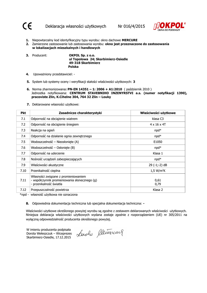 Deklaracja własności użytkowych Nr 016/4/2015 1. 2. Niepowtarzalny kod identyfikacyjny typu wyrobu: okno dachowe MERCURE Zamierzone zastosowanie lub zastosowania wyrobu: okno jest przeznaczone do zastosowania w lokalizacjach mieszkalnych i handlowych 3. Producent: 4. OKPOL Sp. z o.o. ul Topolowa 24; Skarbimierz-Osiedle 49-318 Skarbimierz Polska Upoważniony przedstawiciel: - 5. System lub systemy oceny i weryfikacji stałości właściwości użytkowych: 3 6. Norma zharmonizowana: PN-EN 14351 – 1: 2006 + A1:2010 ( październik 2010 ) Jednostka notyfikowana: CENTRUM STAVEBNIHO INZENYRSTVI a.s. (numer notyfikacji 1390), pracoviste Zlin, K.Cihelne 304, 764 32 Zlin – Louky 7. Deklarowane własności użytkowe: Pkt Zasadnicze charakterystyki Właściwości użytkowe 7.1 Odporność na obciążenie wiatrem klasa C3 7.2 Odporność na obciążenie śniegiem 4 x 16 x 4T 7.3 Reakcja na ogień npd* 7.4 Odporność na działanie ognia zewnętrznego npd* 7.5 Wodoszczelność – Nieosłonięte (A) E1050 7.6 Wodoszczelność – Osłonięte (B) npd* 7.7 Odporność na uderzenie 7.8 Nośność urządzeń zabezpieczających 7.9 Właściwości akustyczne 7.10 Przenikalność cieplna 7.11 Własności związane z promieniowaniem - współczynnik promieniowania słonecznego (g) - przenikalność światła 7.12 Przepuszczalność powietrza Klasa 1 npd* 29 (-1;-2) dB 1,5 W/m2K 0,61 0,79 Klasa 2 *npd - własność użytkowa nie oznaczona 8. Odpowiednia dokumentacja techniczna lub specjalna dokumentacja techniczna: - Właściwości użytkowe określonego powyżej wyrobu są zgodne z zestawem deklarowanych właściwości użytkowych. Niniejsza deklaracja właściwości użytkowych wydana zostaje zgodnie z rozporządzeniem (UE) nr 305/2011 na wyłączną odpowiedzialność producenta określonego powyżej . W imieniu producenta podpisała Dorota Wełeszczuk – Wiceprezes Skarbimierz-Osiedle, 17.12.2015