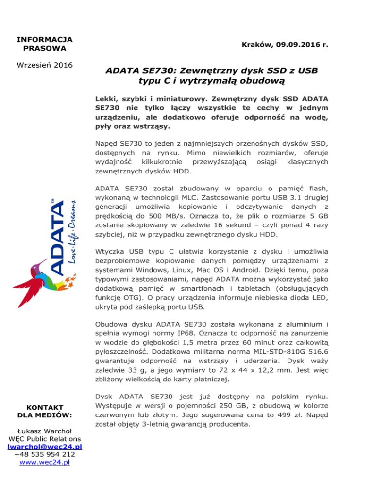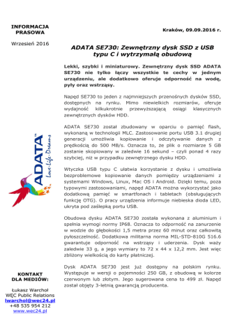 INFORMACJA PRASOWA Wrzesień 2016 Kraków, 09.09.2016 r. ADATA SE730: Zewnętrzny dysk SSD z USB typu C i wytrzymałą obudową Lekki, szybki i miniaturowy. Zewnętrzny dysk SSD ADATA SE730 nie tylko łączy wszystkie te cechy w jednym urządzeniu, ale dodatkowo oferuje odporność na wodę, pyły oraz wstrząsy. Napęd SE730 to jeden z najmniejszych przenośnych dysków SSD, dostępnych na rynku. Mimo niewielkich rozmiarów, oferuje wydajność kilkukrotnie przewyższającą osiągi klasycznych zewnętrznych dysków HDD. ADATA SE730 został zbudowany w oparciu o pamięć flash, wykonaną w technologii MLC. Zastosowanie portu USB 3.1 drugiej generacji umożliwia kopiowanie i odczytywanie danych z prędkością do 500 MB/s. Oznacza to, że plik o rozmiarze 5 GB zostanie skopiowany w zaledwie 16 sekund – czyli ponad 4 razy szybciej, niż w przypadku zewnętrznego dysku HDD. Wtyczka USB typu C ułatwia korzystanie z dysku i umożliwia bezproblemowe kopiowanie danych pomiędzy urządzeniami z systemami Windows, Linux, Mac OS i Android. Dzięki temu, poza typowymi zastosowaniami, napęd ADATA można wykorzystać jako dodatkową pamięć w smartfonach i tabletach (obsługujących funkcję OTG). O pracy urządzenia informuje niebieska dioda LED, ukryta pod zaślepką portu USB. Obudowa dysku ADATA SE730 została wykonana z aluminium i spełnia wymogi normy IP68. Oznacza to odporność na zanurzenie w wodzie do głębokości 1,5 metra przez 60 minut oraz całkowitą pyłoszczelność. Dodatkowa militarna norma MIL-STD-810G 516.6 gwarantuje odporność na wstrząsy i uderzenia. Dysk waży zaledwie 33 g, a jego wymiary to 72 x 44 x 12,2 mm. Jest więc zbliżony wielkością do karty płatniczej. KONTAKT DLA MEDIÓW: Łukasz Warchoł WĘC Public Relations [email protected] +48 535 954 212 www.wec24.pl Dysk ADATA SE730 jest już dostępny na polskim rynku. Występuje w wersji o pojemności 250 GB, z obudową w kolorze czerwonym lub złotym. Jego sugerowana cena to 499 zł. Napęd został objęty 3-letnią gwarancją producenta. INFORMACJA PRASOWA Wrzesień 2016 Tagi: ADATA, ADATA SE730, dysk zewnętrzny SSD, dysk przenośny SSD, SSD, niedrogi dysk SSD z USB 3.1, IP68, dysk dla grafika, dysk do montażu wideo, dysk dla biznesu, wydajny dysk zewnętrzny, magazynowanie danych, archiwizacja danych Strona produktu (opis i specyfikacja): # SE730: http://www.adata.com/en/ext-ssd/feature/392 Komplet materiałów na Dysku Google: # Link: O marce ADATA ADATA™ Technology to jeden z największych na świecie producentów modułów DRAM, przenośnych pamięci masowych oraz kart microSD i SD. Firma została założona w 2001 roku. Od samego początku rozwija się w oparciu o filozofię tworzenia innowacyjnych oraz wyjątkowych produktów. Ten prosty przepis, realizowany przez ponad dekadę, pozwolił stopniowo rozszerzać ofertę marki ADATA i zdobyć zaufanie milionów klientów na całym świecie. ADATA kieruje się hasłem – Love, Life, Dreams. Więcej informacji: www.adata.com ADATA Polska na FB: www.facebook.com/ADATAPolska KONTAKT DLA MEDIÓW: Łukasz Warchoł WĘC Public Relations [email protected] +48 535 954 212 www.wec24.pl