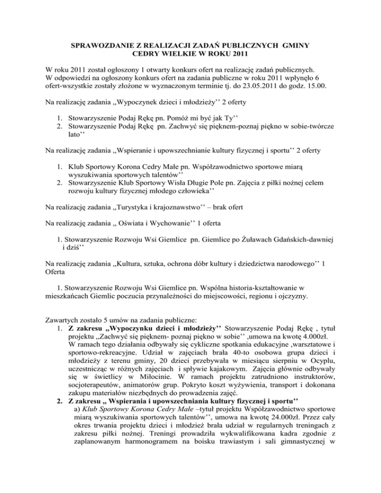 SPRAWOZDANIE Z REALIZACJI ZADAŃ PUBLICZNYCH GMINY CEDRY WIELKIE W ROKU 2011 W roku 2011 został ogłoszony 1 otwarty konkurs ofert na realizację zadań publicznych. W odpowiedzi na ogłoszony konkurs ofert na zadania publiczne w roku 2011 wpłynęło 6 ofert-wszystkie zostały złożone w wyznaczonym terminie tj. do 23.05.2011 do godz. 15.00. Na realizację zadania ,,Wypoczynek dzieci i młodzieży’’ 2 oferty 1. Stowarzyszenie Podaj Rękę pn. Pomóż mi być jak Ty’’ 2. Stowarzyszenie Podaj Rękę pn. Zachwyć się pięknem-poznaj piękno w sobie-twórcze lato’’ Na realizację zadania ,,Wspieranie i upowszechnianie kultury fizycznej i sportu’’ 2 oferty 1. Klub Sportowy Korona Cedry Małe pn. Współzawodnictwo sportowe miarą wyszukiwania sportowych talentów’’ 2. Stowarzyszenie Klub Sportowy Wisła Długie Pole pn. Zajęcia z piłki nożnej celem rozwoju kultury fizycznej młodego człowieka’’ Na realizację zadania ,,Turystyka i krajoznawstwo’’ – brak ofert Na realizację zadania ,, Oświata i Wychowanie’’ 1 oferta 1. Stowarzyszenie Rozwoju Wsi Giemlice pn. Giemlice po Żuławach Gdańskich-dawniej i dziś’’ Na realizację zadania ,,Kultura, sztuka, ochrona dóbr kultury i dziedzictwa narodowego’’ 1 Oferta 1. Stowarzyszenie Rozwoju Wsi Giemlice pn. Wspólna historia-kształtowanie w mieszkańcach Giemlic poczucia przynależności do miejscowości, regionu i ojczyzny. Zawartych zostało 5 umów na zadania publiczne: 1. Z zakresu ,,Wypoczynku dzieci i młodzieży’’ Stowarzyszenie Podaj Rękę , tytuł projektu ,,Zachwyć się pięknem- poznaj piękno w sobie’’ ,umowa na kwotę 4.000zł. W ramach tego działania odbywały się cykliczne spotkania edukacyjne ,warsztatowe i sportowo-rekreacyjne. Udział w zajęciach brała 40-to osobowa grupa dzieci i młodzieży z terenu gminy, 20 dzieci przebywała w miesiącu sierpniu w Ocyplu, uczestnicząc w różnych zajęciach i spływie kajakowym. Zajęcia głównie odbywały się w świetlicy w Miłocinie. W ramach projektu zatrudniono instruktorów, socjoterapeutów, animatorów grup. Pokryto koszt wyżywienia, transport i dokonana zakupu materiałów niezbędnych do prowadzenia zajęć. 2. Z zakresu ,, Wspierania i upowszechniania kultury fizycznej i sportu’’ a) Klub Sportowy Korona Cedry Małe –tytuł projektu Współzawodnictwo sportowe miarą wyszukiwania sportowych talentów’’, umowa na kwotę 24.000zł. Przez cały okres trwania projektu dzieci i młodzież brała udział w regularnych treningach z zakresu piłki nożnej. Treningi prowadziła wykwalifikowana kadra zgodnie z zaplanowanym harmonogramem na boisku trawiastym i sali gimnastycznej w Cedrach Małych, na Orliku przy Zespole Szkół w Cedrach Wielkich. Zawodnicy klubu reprezentowali gminę na zewnątrz. Odbywały się rozgrywki w Tczewie, Luzinie, Stegnie, Żukowie, Somoninie, Kleszczewie, Choczewie, Kolbudach. Zakupiono sprzęt sportowy w postaci piłek i strojów sportowych. Dbano o prawidłowy stan boiska w Cedrach Małych. Finałem tego zadania był Turniej o Puchar Wójta Gminy który odbył się 17.08.2011 na Orliku. Zaproszenie na turniej było skierowane nie tylko dla uczestników Klubu Sportowego , ale dla całych rodziny. Odbyły się liczne konkursy i zabawy z nagrodami. W projekcie udział brali również wolontariusze. a) Stowarzyszenie Klub Sportowy Długie Pole-tytuł projektu Zajęcia z piłki nożnej celem rozwoju kultury fizycznej młodego człowieka, umowa na kwotę 16.000zł. Przedmiotem działań było prowadzenie zajęć treningowych i rozgrywek sportowych, oraz zaznajomienie uczniów z zasadami taktyki i techniki gry w piłkę nożną. Celem projektu było zagospodarowanie czasu wolnego, wyłonienie uzdolnionej sportowo młodzieży i wprowadzenie do dalszego kształtowania sportowych umiejętności w klubie. W ramach projektu zakupiono sprzęt sportowy w postaci piłek i strojów sportowych. Dbano o prawidłowy stan boiska w Długim Polu. 3. Z zakresu ,,Oświata i Wychowanie’’ –Stowarzyszenie Rozwoju Wsi Giemlice, tytuł projektu –Giemlice po Żuławach Gdańskich-dawnej i dziś’’, umowa na kwotę 3.000zł W ramach tego działania odbyły się warsztaty malarskie, muzyczne, dziennikarskie oraz zajęcia w ramach koła regionalnego szlakiem domów podcieniowych. Dokonano zakupu art. malarskich, papierniczych Wykonano folder ,,Giemlice 720-lecie wsi. Zaznaczając, że folder finansowany był w ramach zadania publicznego w zakresie ,,Oświata i wychowanie’’ 4. Z zakresu ,,Kultura, sztuka, ochrona dóbr kultury i dziedzictwa narodowego’ ’Stowarzyszenie Rozwoju Wsi Giemlice , tytuł projektu ,,Wspólna historiakształtowanie w mieszkańcach Giemlic poczucia przynależności do miejscowości, regionu i ojczyzny’’, umowa na kwotę 3.000zł. Zadanie polegało na dokończeniu prac na placu pamięci w Giemlicach. Zwieńczeniem całego projektu był festyn rodzinny podczas którego nastąpiło uroczyste odsłonięcie tablicy pamiątkowej. W ramach zadania został wykonany folder ,,Giemlice, wczoraj, dziś ,jutro 1291-2011. Zakupiono flagi, księgę pamiątkową, art. spożywcze. Uroczystość odbyła się w Szkole Podstawowej w Giemlicach. Liczba beneficjentów zrealizowanych zadań 5 Wysokość środków finansowych przeznaczonych z budżetu gminy na realizację zadań publicznych przez podmioty 52.000 .zł Wysokość środków przyznanych w ramach ofert w otwartym konkursie 50.000 zł. Projekt uchwały w sprawie przyjęcia rocznego programu współpracy Gminy Cedry Wielkie z organizacjami pozarządowymi oraz podmiotami prowadzącymi działalność pożytku publicznego na rok 2011 został poddany konsultacji w dniach od 21 stycznia 2011 do 31 stycznia 2011 w formie wyrażenia pisemnej opinii którą można było przekazać na formularzu stanowiącym załącznik do Zarządzenia Wójta Gminy nr 5/2011 z dnia 19.01.2011 lub w formie elektronicznej , oraz na spotkaniu w dniu 9 lutego 2011r 