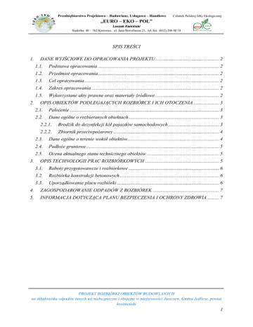 Przedsiębiorstwo Projektowo – Budowlane, Usługowo – Handlowe Członek Polskiej Izby Ekologicznej „EURO – EKO – POL” Leszek Kamiński Siedziba: 40 – 762 Katowice, ul. Jana Heweliusza 21, tel./fax (032) 206 40 18 SPIS TREŚCI 1. 2. 3. DANE WYJŚCIOWE DO OPRACOWANIA PROJEKTU.................................................. 2 1.1. Podstawa opracowania ............................................................................................... 2 1.2. Przedmiot opracowania............................................................................................... 2 1.3. Cel opracowania.......................................................................................................... 2 1.4. Zakres opracowania .................................................................................................... 2 1.5. Wykorzystane akty prawne oraz materiały źródłowe .................................................. 2 OPIS OBIEKTÓW PODLEGAJĄCYCH ROZBIÓRCE I ICH OTOCZENIA .................... 3 2.1. Położenie ..................................................................................................................... 3 2.2. Dane ogólne o rozbieranych obiektach ....................................................................... 3 2.2.1. Brodzik do dezynfekcji kół pojazdów samochodowych ........................................ 3 2.2.2. Zbiornik przeciwpożarowy ................................................................................... 4 2.3. Dane ogólne o terenie wokół obiektów........................................................................ 4 2.4. Podłoże gruntowe ........................................................................................................ 5 2.5. Ocena aktualnego stanu technicznego obiektów ......................................................... 5 OPIS TECHNOLOGII PRAC ROZBIÓRKOWYCH .......................................................... 5 3.1. Roboty przygotowawcze i rozbiórkowe ....................................................................... 6 3.2. Rozbiórka konstrukcji betonowych .............................................................................. 6 3.3. Uporządkowanie placu rozbiórki ................................................................................ 6 4. ZAGOSPODAROWANIE ODPADÓW Z ROZBIÓREK .................................................... 7 5. INFORMACJA DOTYCZĄCA PLANU BEZPIECZENIA I OCHRONY ZDROWIA ......... 7 PROJEKT ROZBIÓRKI OBIEKTÓW BUDOWLANYCH na składowisku odpadów innych niż niebezpieczne i obojętne w miejscowości Jaszczew, Gmina Jedlicze, powiat krośnieński 1 Przedsiębiorstwo Projektowo – Budowlane, Usługowo – Handlowe Członek Polskiej Izby Ekologicznej „EURO – EKO – POL” Leszek Kamiński Siedziba: 40 – 762 Katowice, ul. Jana Heweliusza 21, tel./fax (032) 206 40 18 1. DANE WYJŚCIOWE DO OPRACOWANIA PROJEKTU 1.1. Podstawa opracowania Podstawę niniejszego opracowania stanowi umowa o dzieło Nr OŚ 7050 – 51/327/2009, zawarta w dniu 1 sierpnia 2009 r. pomiędzy Gminą Jedlicze a Przedsiębiorstwem Projektowo – Budowlanym Usługowo – Handlowym „EURO – EKO – POL” Leszek Kamiński w Katowicach. 1.2. Przedmiot opracowania Przedmiotem opracowania jest projekt rozbiórki brodzika do dezynfekcji kół pojazdów samochodowych oraz basenu ppoż. na składowisku odpadów innych niż niebezpieczne i obojętne w miejscowości Jaszczew, Gmina Jedlicze, powiat krośnieński. 1.3. Cel opracowania Celem niniejszego opracowania jest wykonanie projektu robót rozbiórkowych brodzika do dezynfekcji kół pojazdów samochodowych oraz basenu ppoż. na składowisku odpadów innych niż niebezpieczne i obojętne w miejscowości Jaszczew, Gmina Jedlicze, powiat krośnieński. Obiekty zostaną rozebrane ze względu na ich nieprzydatność w ramach planowanych prac rekultywacyjnych na składowisku odpadów innych niż niebezpieczne i obojętne w miejscowości Jaszczew, Gmina Jedlicze, powiat krośnieński (rekultywacja techniczna). 1.4. Zakres opracowania Zakres opracowania obejmuje: Wykonanie projektu rozbiórki budynków użytkowych, Sporządzenie informacji dotyczącej bezpieczeństwa i ochrony zdrowia (BIOZ). 1.5. Wykorzystane akty prawne oraz materiały źródłowe Do sporządzenia niniejszej dokumentacji wykorzystano następujące akty prawne oraz materiały źródłowe: Ustawa z dnia 7 lipca 1994 r. Prawo budowlane (Dz. U. z 2006 r., Nr 156, poz. 1118 z późn. zm.), Ustawa z dnia 27 kwietnia 2001 r. o odpadach (Dz. U. z 2007 r., Nr 39, poz. 251 z późn. zm.), PROJEKT ROZBIÓRKI OBIEKTÓW BUDOWLANYCH na składowisku odpadów innych niż niebezpieczne i obojętne w miejscowości Jaszczew, Gmina Jedlicze, powiat krośnieński 2 Przedsiębiorstwo Projektowo – Budowlane, Usługowo – Handlowe Członek Polskiej Izby Ekologicznej „EURO – EKO – POL” Leszek Kamiński Siedziba: 40 – 762 Katowice, ul. Jana Heweliusza 21, tel./fax (032) 206 40 18 Rozporządzenie Ministra Infrastruktury z dnia 6 lutego 2003 r. w sprawie bezpieczeństwa i higieny pracy podczas wykonywania robót budowlanych (Dz. U. z 2003 r., Nr 47, poz. 401), Rozporządzenie Ministra Infrastruktury z dnia 23 czerwca 2003 r. w sprawie informacji dotyczącej bezpieczeństwa i ochrony zdrowia oraz planu bezpieczeństwa i ochrony zdrowia (Dz. U. z 2003 r., Nr 120, poz. 1126), Rozporządzenie Ministra Infrastruktury z dnia 3 lipca 2003 r. w sprawie szczegółowego zakresu i formy projektu budowlanego (Dz. U. z 2003 r., Nr 120, poz. 1133 z późn. zm.), Rozporządzenie Ministra Infrastruktury z dnia 2 września 2004 r. w sprawie szczegółowego zakresu i formy dokumentacji projektowej, specyfikacji technicznych wykonania i odbioru robót budowlanych oraz programu funkcjonalno – użytkowego (Dz. U. z 2004 r., Nr 202, poz. 2072), Rozporządzenie Ministra Środowiska z dnia 27 września 2001 r. w sprawie katalogu odpadów (Dz. U. z 2001 r., Nr 112, poz. 