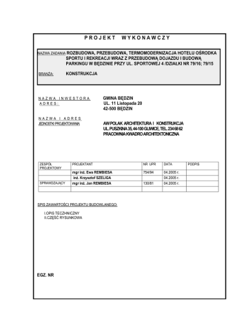 PROJEKT WYKONAWCZY NAZWA ZADANIA ROZBUDOWA, PRZEBUDOWA, TERMOMODERNIZACJA HOTELU OŚRODKA SPORTU I REKREACJI WRAZ Z PRZEBUDOWĄ DOJAZDU I BUDOWĄ PARKINGU W BĘDZINIE PRZY UL. SPORTOWEJ 4 /DZIAŁKI NR 79/16; 79/15 BRANśA: KONSTRUKCJA NAZWA INWESTORA ADRES: NAZWA I ADRES JEDNOSTKI PROJEKTOWANIA: ZESPÓŁ PROJEKTOWY SPRAWDZAJĄCY GMINA BĘDZIN UL. 11 Listopada 20 42-500 BĘDZIN AW POLAK ARCHITEKTURA I KONSTRUKCJA UL. PUSZKINA 35, 44-100 GLIWICE, TEL. 234 68 62 PRACOWNIA KWADRO ARCHITEKTONICZNA PROJEKTANT NR UPR DATA mgr inŜ. Ewa REMBIESA inŜ. Krzysztof SZELIGA mgr inŜ. Jan REMBIESA 754/94 04.2005 r. 04.2005 r. 04.2005 r. SPIS ZAWARTOŚCI PROJEKTU BUDOWLANEGO: I.OPIS TECZHNICZNY II.CZĘŚĆ RYSUNKOWA EGZ. NR 130/81 PODPIS OPIS TECHNICZNY Spis treści: 1.0. Podstawa opracowania...........................................................................3 2.0. Przedmiot i zakres opracowania.......................................................... ..3 3.0. Opis ogólny obiektu istniejącego............................................................3 4.0. Opis ogólny obiektu projektowanego......................................................3 5.0. Posadowienie, kategoria geotechniczna................................................3 6.0. Rozbiórka...............................................................................................3 7.0. Opis obiektu projektowanego................................................................ 3 8.0. Elementy wyposaŜenia..........................................................................4 9.0. Izolacje 10.0. Podstawowe materiały........................................................................... 4 11.0. Zabezpieczenia antykorozyjne konstrukcji stalowej...............................5 12.0. Informacja dotycząca bezpieczeństwa i ochrony zdrowia......................5 13.0. Wytyczne realizacji..................................................................................6 I. CZĘŚĆ GRAFICZNA Spis rysunków: Rzut fundamentów, przekroje ścian wewnętrznych nr rys. W - K - 01 Rzut piwnic – zmiany konstrukcyjne W - K - 02 Rzut parteru – zmiany konstrukcyjne W - K - 03 Rzut I piętra– zmiany konstrukcyjne W - K - 04 Klatka schodowa nr I- fundamenty W - K – 05 Klatka schodowa nr I - rzuty W - K – 06 Klatka schodowa nr I – przekrój A -A W - K – 07 Klatka schodowa nr I - bieg schodowy B/1 W - K – 08 Klatka schodowa nr I – bieg schodowy B/2 W - K – 09 Klatka schodowa nr I – schody zewnętrzne nr I W - K – 10 Klatka schodowa nr I – rzut stropu W - K – 11 Klatka schodowa nr I- rzut dachu W - K – 12 Klatka schodowa nr II – rzut fundamentów W - K – 13 Klatka schodowa nr II – rzut piwnic i parteru W - K – 14 Klatka schodowa nr II – rzut piętra W - K – 15 2 Klatka schodowa nr II – przekrój A - A W - K – 16 Klatka schodowa nr II – bieg schodowy B/3 W - K – 17 Klatka schodowa nr II – bieg schodowy B/5 W - K – 18 Klatka schodowa nr II – schody zewnętrzne W - K – 19 Klatka schodowa nr II – rzut stropu W - K – 20 Klatka schodowa nr II – rzut konstrukcji dachu W - K – 21 Klatka schodowa nr II – rzut stropu nad parterem i słupy Ŝelbetowe W - K – 22 Pochylnia W - K – 23 Wejście główne, schody zewnętrzne W - K – 24 Klatka schodowa nr III - rzut fundamentów W - K – 25 Klatka schodowa nr III – rzut parteru i piętra W - K – 26 Klatka schodowa nr III – przekrój A -A W - K – 27 Klatka schodowa nr III - bieg schodowy B/6 W - K – 28 Klatka schodowa nr III – bieg schodowy B/7 W - K – 29 Klatka schodowa nr III – rzut stropu W - K – 30 Klatka schodowa nr III – rzut konstrukcji dachu W - K – 31 Klatka schodowa nr III – łącznik W - K – 32 Klatka schodowa nr III – łącznik, przekroje W - K – 33 Schody wewnętrzne W - K – 34 Konstrukcja wsporcza centrali wentylacyjnej W - K – 35 Taras - rzut W - K – 36 Taras - przekroje W - K – 37 Rama R1 i R1a W - K – 38 Strop stalowo- Ŝelbetowy nad piwnicą W - K – 39 Schody wewnętrzne Sch./2 W - K – 40 3 OPIS TECHNICZNY 1.0. PODSTAWA OPRACOWANIA - zlecenie Inwestora - inwentaryzacja budowlana budynku hotelu OSiR w Będzinie - PB architektury - ocena nośności podłoŜa gruntowego pod projektowanymi fundamentami przebudowywanego Ośrodka Sportu i Rekreacji w Będzinie opracowana przez dr inŜ. Stanisława Chmielniaka w lutym , 2005 r 2.0. PRZEDMIOT I ZAKRES OPRACOWANIA - Projekt budowlany konstrukcji: przebudowy i rozbudowy hoteli OSiR W Będzinie 3.0. OPIS OGÓLNY OBIEKTU ISTNIEJĄCEGO Obiekt pięciosegmentowy; cztery dwukondygnacyjne a jeden parterowy, Częściowo podpiwniczony, wykonany w tradycji. Stropy gęstoŜebrowe, Akermana. Układ konstrukcyjny mieszany. Stropodach wentylowany, a częściowo Ŝelbetowy, spadzisty, ze spadkiem poprzecznym. 4.0. OPIS OGÓLNY OBIEKTU PROJEKTOWANEGO Przebudowa polegać będzie na: zmianie wielkości otworów okiennych, przebudowie pomieszczeń, wykonaniu stropu w miejscu rozebranej klatki schodowej, budowie nowych ścian konstrukcyjnych w segmencie wysokim, które będą oparciem dla nowoprojektowanego stropu w projektowanym zapleczu kuchni, głównych schodów zewnętrznych. Rozbudowa przewiduje budowę oddylatowanych trzech klatek schodowych, schodów zewnętrznych , pochylni dla niepełnosprawnych i tarasu zewnętrznego. 5.0. POSADOWIENIE, KATEGORIA GEOTECHNICZNA Projektowana dobudowa posadowiona będzie na poziomie wynikającym z posadowienia części istniejącej. Nośność podłoŜa w poziomie posadowienia : istniejących fundamentów ławowych przyjęto 200 kPa, dla nowych fundamentów pod ściany klatek schodowych 150 kPa a dla ław pod ściany w hali wysokiej 200 kPa. Przyjęto I kategorię geotechniczną. 6.0. ROZBIÓRKA Przewiduje się działowych. 7.0. rozbiórkę: istniejącej , wewnętrznej klatki schodowej, ścian OPIS OBIEKTU PROJEKTOWANEGO Przebudowa polegać będzie na: • zmianie wielkości otworów okiennych i drzwiowych – na