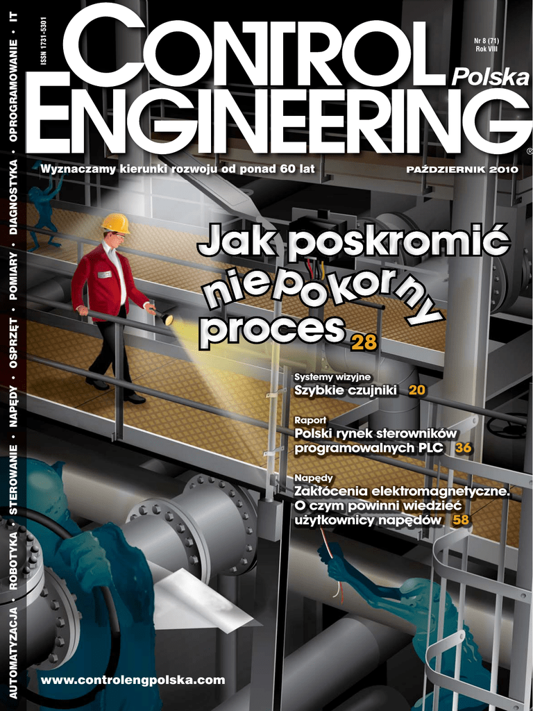 ISSN 1731-5301 AUTOMATYZACJA • ROBOTYKA • STEROWANIE • NAPĘDY • OSPRZĘT • POMIARY • DIAGNOSTYKA • OPROGRAMOWANIE • IT Nr 8 (71) Rok VIII Wyznaczamy kierunki rozwoju od ponad 60 lat PAŹDZIERNIK 2010 28 Systemy wizyjne Szybkie czujniki 20 Raport Polski rynek sterowników programowalnych PLC 36 Napędy Zakłócenia elektromagnetyczne. O czym powinni wiedzieć użytkownicy napędów 58 www.controlengpolska.com OD REDAKCJI Redakcja Polska Redaktor naczelny Tomasz Kurzacz [email protected] Redaktor prowadzący Krzysztof Ziemkiewicz [email protected] Wydarzenie godne uwagi – PROTECH 2010 M iło jest mi powitać Państwa jako redaktor prowadzący magazynu Control Engineering Polska. Wspólnie z redaktorem naczelnym – panem Tomaszem Kurzaczem, dopełnimy wszelkich starań, aby magazyn Control Engineering Polska spełniał Państwa oczekiwania odnośnie naszego czasopisma. Z niniejszym wydaniem magazynu Control Engineering Polska wprowadziliśmy parę zmian związanych z uporządkowaniem tematycznym zamieszczanych artykułów i ulepszyliśmy szatę graficzną magazynu. Zauważalna zmiana widoczna jest już na okładce czasopisma. Uwypukliliśmy między innymi główne działy tematyczne, które cyklicznie pojawiają się na łamach naszego magazynu. Już wkrótce we Wrocławiu rozpocznie się Kongres Produkcji i Technologii PROTECH 2010. Jego nowa nazwa precyzyjniej określa nasze coroczne spotkania z najnowszymi technologiami i trendami w produkcji. Największą wartością tych spotkań były i pozostają seminaria. Zgrupowane one zostały w czterech panelach tematycznych: MAINTECH, ROBOTECH, SYSTECH, ENERGOTECH (www.kongres-protech.pl). Kongresowi towarzyszyć będą cieszące się dużym zainteresowaniem Dni Kariery dla Inżynierów. Tegoroczny Kongres Produkcji i Technologii PROTECH 2010 odbędzie się w dniach 26 i 27 października, w nowo powstałym Regionalnym Centrum Turystyki Biznesowej – tuż obok Hali Stulecia. Swój udział zapowiedziało ponad 70 firm oraz ok. 300 uczestników seminariów. W bieżącym numerze tematem z okładki jest nieustający problem niestabilności procesów produkcyjnych i sposoby ustalenia ich przyczyn. Co sprawia, że proces jest „nieposłuszny” i jak poradzić sobie z odnalezionym problemem? Czasem trudno jest na podstawie symptomu określić źródło problemu, bo skutek wydaje się być niezwiązany z przyczyną. Wtedy zaczyna się prawdziwa praca detektywistyczna... O tym, jak zabezpieczyć kosztowne formy wtryskowe przed ich uszkodzeniem i jednocześnie poprawić jakość wykonywanych na nich elementów, opisujemy w artykule dotyczącym zastosowania systemów wizyjnych. Zastosowanie właściwych czujników lub systemów wizyjnych umożliwia przeprowadzanie sprawdzania jakości wytwarzanych produktów przy bardzo szybkich procesach produkcyjnych. Zrobotyzowane systemy wizyjne (2D i 3D) oraz czujniki umożliwiają utrzymanie wysokiej jakości produkcji przy jednoczesnym obniżeniu jej kosztów. Czy obecna sytuacja ekonomiczna w kraju ma wpływ na zapotrzebowanie na sterowniki programowalne? Załączony raport pt. „PLC idzie do przodu” przedstawia bieżącą sytuację na rynku sterowników programowalnych. Nowości techniczne zostały przedstawione w dziale „Produkty”. Mamy nadzieję, że przedstawione nowości i rozwiązania techniczne pomogą Państwu we właściwym wyborze rozwiązań projektowych i ułatwią bezpośrednie dotarcie do ich źródła. W dziale „Wydarzenia” przedstawiamy interesujące relacje z targów, osoby, zdarzenia oraz planowane w najbliższym czasie imprezy dotyczące przemysłu i technologii. Krzysztof Ziemkiewicz, redaktor prowadzący [email protected] 2 • PAŹDZIERNIK 2010 CONTROL ENGINEERING POLSKA • www.controlengpolska.com Redakcja merytoryczna dr inż. Paweł Dworak dr inż. Andrzej Ożadowicz mgr inż. Łukasz Urbański dr inż. Krzysztof Pietrusewicz Współpraca mgr inż. Izabela Cieniak [email protected] Redaktor witryny internetowej Paweł Szczepański [email protected] Redakcja stylistyczna Małgorzata Wyrwicz Opracowanie graficzne i skład Grzegorz Solecki [email protected] Key Account Manager Agnieszka Gumienna [email protected] Marketing Aleksander Poniatowski [email protected] Administracja/prenumerata Anna Jedlińska [email protected] Druk i oprawa Drukarnia Taurus www.drukarniataurus.com.pl Redakcja USA Mark T. Hoske, Peter Welander, Patrick Lynch, Bob Vavra, Amara Rozgus, Sara Arami Wydawnictwo Trade Media International Holdings sp. z o.o. ul. Wita Stwosza 59a, 02-661 Warszawa tel. 022 852 44 15 www.trademedia.us Prezes zarządu Michael J. Majchrzak [email protected] Redakcja zastrzega sobie prawo do adiustacji i skracania tekstów oraz zmiany ich tytułów. Nie zwracamy tekstów niezamówionych. Nie odpowiadamy za treść reklam i ogłoszeń. Magazyn wydawany jest na licencji Reed Business Information. Wybrane materiały redakcyjne zamieszczone w niniejszym numerze zostały zamieszczone za pozwoleniem wydawcy Control Engineering Magazine, Copyright © 2010 CFE Media LLC. Wszelkie prawa zastrzeżone. Powielanie lub rozpowszechnianie zamieszczonego materiału redakcyjnego w jakiejkolwiek postaci, w jakimkolwiek języku, w całości lub jego części, bez poprzedzającej pisemnej zgody CFE Media LLC jest wyraźnie zabronione. Control Engineering jest zastrzeżonym znakiem towarowym CFE Media LLC. Control Engineering jest znakiem towarowym CFE Media LLC używanym w ramach licencji. SPIS TREŚCI PAŹDZIERNIK 2010 Nr 8 (71) Rok VIII W NUMERZE pomagają rozwiązać problem 14 Podobieństwa Wiedza oparta na znajomości podstawowych reguł i mechanizmów różnych zjawisk fizycznych jest kluczem do innowacyjnego rozwiązywania problemów multidyscyplinarnych. uszkodzeń form wtryskowych 16 Eliminowanie System wizyjny zapobiega uszkodzeniom oprzyrządowania form wtryskowych i poprawia jakość wykonywanych elementów. 20 Szybkie czujniki Projektowanie uwzględniające czujniki m