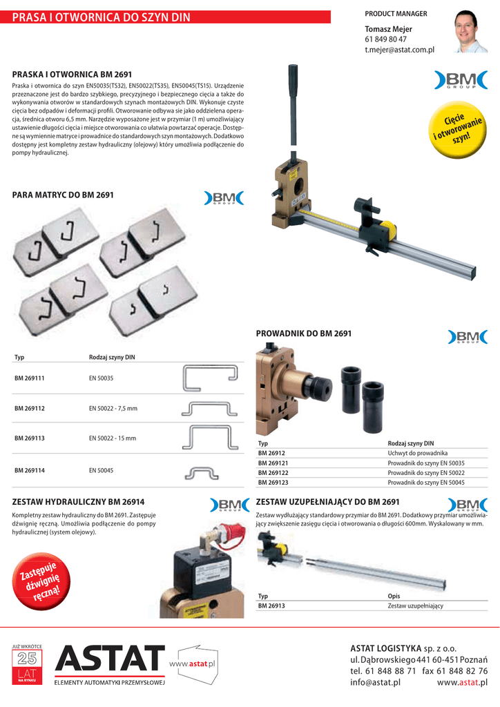 PRODUCT MANAGER PRASA I OTWORNICA DO SZYN DIN Tomasz Mejer 61 849 80 47 [email protected] PRASKA I OTWORNICA BM 2691 Praska i otwornica do szyn EN50035(TS32), EN50022(TS35), EN50045(TS15). Urządzenie przeznaczone jest do bardzo szybkiego, precyzyjnego i bezpiecznego cięcia a także do wykonywania otworów w standardowych szynach montażowych DIN. Wykonuje czyste cięcia bez odpadów i deformacji profili. Otworowanie odbywa sie jako oddzielena operacja, średnica otworu 6,5 mm. Narzędzie wyposażone jest w przymiar (1 m) umożliwiający ustawienie długości cięcia i miejsce otworowania co ułatwia powtarzać operacje. Dostępne są wymiennie matryce i prowadnice do standardowych szyn montażowych. Dodatkowo dostępny jest kompletny zestaw hydrauliczny (olejowy) który umożliwia podłączenie do pompy hydraulicznej. e Cięci wanie or o i otw szyn! PARA MATRYC DO BM 2691 PROWADNIK DO BM 2691 Typ Rodzaj szyny DIN BM 269111 EN 50035 BM 269112 EN 50022 - 7,5 mm BM 269113 EN 50022 - 15 mm BM 269114 EN 50045 Typ BM 26912 BM 269121 BM 269122 BM 269123 Rodzaj szyny DIN Uchwyt do prowadnika Prowadnik do szyny EN 50035 Prowadnik do szyny EN 50022 Prowadnik do szyny EN 50045 ZESTAW HYDRAULICZNY BM 26914 ZESTAW UZUPEŁNIAJĄCY DO BM 2691 Kompletny zestaw hydrauliczny do BM 2691. Zastępuje dźwignię ręczną. Umożliwia podłączenie do pompy hydraulicznej (system olejowy). Zestaw wydłużający standardowy przymiar do BM 2691. Dodatkowy przymiar umożliwiający zwiększenie zasięgu cięcia i otworowania o długości 600mm. Wyskalowany w mm. puje Zastę ignię dźw ną! ręcz JUŻ WKRÓTCE Typ BM 26913 Opis Zestaw uzupełniający ASTAT LOGISTYKA sp. z o.o. ul. Dąbrowskiego 441 60-451 Poznań tel. 61 848 88 71 fax 61 848 82 76 [email protected] www.astat.pl