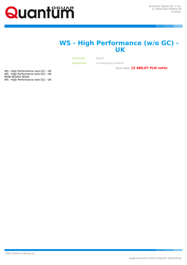 Quantum Qguar Sp. z o.o. ul. Walerego Sławka 3A Kraków WS - High Performance (w/o GC) UK Producent: Bosch Dostępność: w magazynie polskim Cena netto: 15 088,07 PLN netto WS - High Performance (w/o GC) - UK WS - High Performance (w/o GC) - UK MHW-WZ4R2-NGUK WS - High Performance (w/o GC) - UK http://www.it-zakupy.pl wygenerowano przez program AptusShop
