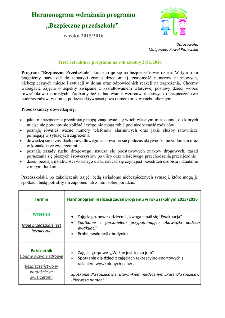 Harmonogram wdrażania programu ,,Bezpieczne przedszkole” w roku 2015/2016 Opracowała: Małgorzata Kowal Paziewska Treść i struktura programu na rok szkolny 2015/2016 Program "Bezpieczne Przedszkole" koncentruje się na bezpieczeństwie dzieci. W tym roku pragniemy nawiązać do tematyki znanej dzieciom tj. znajomość numerów alarmowych, niebezpiecznych miejsc i sytuacji w domu oraz odpowiednich reakcji na zagrożenia. Chcemy wzbogacić zajęcia o aspekty związane z kształtowaniem właściwej postawy dzieci wobec rówieśników i dorosłych. Zadbamy też o budowanie wzorców ruchowych i bezpieczeństwa podczas zabaw, w domu, podczas aktywności poza domem oraz w ruchu ulicznym. Przedszkolacy dowiedzą się: jakie niebezpieczne przedmioty mogą znajdować się w ich własnym mieszkaniu, do których miejsc nie powinny się zbliżać i czego nie mogą robić pod nieobecność rodziców poznają również ważne numery telefonów alarmowych oraz jakie służby ratownicze pomagają w sytuacjach zagrożenia dowiedzą się o zasadach prawidłowego zachowania się podczas aktywności poza domem oraz w kontakcie ze zwierzętami poznają zasady ruchu drogowego, nauczą się podstawowych znaków drogowych, zasad poruszania się pieszych i rowerzystów po ulicy oraz właściwego przechodzenia przez jezdnię dzieci poznają możliwości własnego ciała, nauczą się czym jest przestrzeń osobista i działanie z innymi ludźmi. Przedszkolaki, po zakończeniu zajęć, będą świadome niebezpiecznych sytuacji, które mogą je spotkać i będą potrafiły im zapobiec lub z nimi sobie poradzić. Termin Wrzesień Moje przedszkole jest bezpieczne Październik Dbamy o swoje zdrowie Bezpieczeństwo w kontakcie ze zwierzętami Harmonogram realizacji zadań programu w roku szkolnym 2015/2016 Zajęcia grupowe z dziećmi „Uwaga – pali się! Ewakuacja” Spotkanie z personelem przypominające obowiązki podczas ewakuacji Próba ewakuacji z budynku Zajęcia grupowe ,,Ważne jest to, co jem” Spotkanie dla dzieci z zajęciach rekreacyjno-sportowych z udziałem wyszkolonych psów . Spotkanie dla rodziców z ratownikiem medycznym „Kurs dla rodziców -Pierwsza pomoc” Listopad Jesteśmy życzliwi i uprzejmi dla siebie i innych Grudzień Zajęcia grupowe ,,Ja, my, inni” Spotkanie warsztatowe dla rodziców z logopedą,, Usprawnianie narządów artykulacyjnych- zabawy logarytmiczne” Zajęcia grupowe ,, Produkty bezpieczne i niebezpieczne” Zajęcia grupowe ,,Czerwony kapturek- spotkanie z nieznajomym”. Mieszkanie jest miejscem bezpiecznym Styczeń Nie wpuszczam obcych do domu, wiem jak się zachować podczas spotkania z nieznajomym Spotkanie dla rodziców z psychologiem ,,Jestem chłopcem, jestem dziewczynką- jak wspomagać rozwój seksualny dziecka” Luty Rozumienie zjawisk atmosferycznych i unikanie zagrożeń Marzec Zajęcia grupowe „Bawimy się bezpiecznie” Konkurs plastyczny dla dzieci,, Bezpieczeństwo na drodze” Zajęcia grupowe ,, Gimnastyka bosych stóp- ćwiczenia przeciw płaskostopiu” Bawimy się bezpiecznie Spotkanie dla rodziców,, Jak wspierać rozwój fizyczny dziecka w okresie przedszkolnym” Kwiecień Kształtowanie czynności samoobsługowych nawyków higienicznych i kulturalnych Maj Spotkanie dla rodziców z psychologiem Bezpieczeństwo w sieci” Przedszkolna Olimpiada Sportowa ,, Ruch to zdrowie” Wycieczka dla dzieci do Straży Pożarnej, zapoznanie z pracą strażaka Udział w Ogólnopolskiej Akcji „Dni Bezpiecznych Przedszkoli” Zajęcia grupowe ,,Jak bezpiecznie podróżować” Bezpieczna droga Czerwiec Przestrzeganie zasad bezpieczeństwa Spotkanie dla dzieci ze stomatologiem,, Przedszkolaki dbają o zęby” Wręczenie dyplomów,, Odpowiedzialny rodzic” na festynie rodzinnym Ponadto planujemy: Cykliczne zajęcia gimnastyczno-ruchowe „Gimnastyka dla smyka” dla dzieci 5-letnich prowadzone nauczycielkę wych. fizycznego p. Magdalenę Dróżdź (raz w tygodniu) teledysku z udziałem naszych przedszkolaków związany z tematyką bezpieczeństwa Nagranie Udział w konkursach i akcjach ogólnopolskich dotyczących bezpieczeństwa i zdrowia Udział w Ogólnopolskiej kampanii społecznej „Zły dotyk” - Fundacji „Dzieci Niczyje” Przeprowadzenie gawęd – konwersatoriów na temat zagrożeń w kontaktach z przyrodą w układzie pór roku. Konkursy rysunkowe dla dzieci w konwencji „dobrze” - „źle”. Pierwsza pomoc – jak pomóc sobie lub koledze w przypadku zranienia czy urazu, jak wezwać pomoc – ćwiczenia. Zorganizowanie spotkania z policjantem, policjantem drogowym, strażnikiem miejskim. Spotkanie ze specjalistą od technik komputerowych - rozmowa nt. bezpieczeństwa korzystania z Internetu i zakazu kontaktów z nieznajomymi w Sieci (szczególne uczulenie na przekazanie swoich danych, adresu, zachęty do spotkania). Wycieczkę do siedziby straży pożarnej. Wycieczkę do schroniska dla zwierząt, albo wizyta w przedszkolu psa z treserką (lub innego zwierzęcia)- rozmowa nt. kontaktu z nieznajomymi, obcymi i dzikimi zwierzętami. Uczulenie dzieci na bezpieczeństwo w kontaktach z nieznajomymi zwierzętami, zachowanie ostrożności, zasady postępowania w sytuacji bezpośredniego zagrożenia. SPOTKANIE Z WETERYNARZEM Przeprowadzenie spotkania z lekarzem lub pielęgniarką albo wycieczka do gabinetu lekarskiego - rozmowa o bezwzględnym zakazie korzystania z lekarstw z apteczki domowej. Uświadomienie dzieciom o śmiertelnym niebezpieczeństwie zażywania wszelkich, zwłaszcza nieznanych, medykamentów. SPOTKANIE Z PIELĘGNIARKĄ SPOTKANIE Z OKULISTĄ WIZYTA W GABINETACH LEKARSKICH WIZYTA W GABINECIE STOMATOLOGICZNYM Przeprowadzenie zajęć w formie teatrzyku z wykorzystaniem zabawek przedszkolnych lub samodzielnie wykonanych pacynek nt. kontaktów z nieznajomymi. Konwersatorium nt. „Szanuj swoją koleżankę i swojego kolegę. Szacunek i wzajemna życzliwość pozwalają żyć w grupie i społeczeństwie” Prawa i obowiązki dziecka 