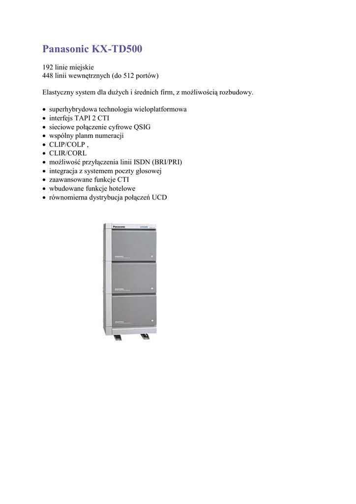 Panasonic KX-TD500 192 linie miejskie 448 linii wewnętrznych (do 512 portów) Elastyczny system dla dużych i średnich firm, z możliwością rozbudowy. • • • • • • • • • • • superhybrydowa technologia wieloplatformowa interfejs TAPI 2 CTI sieciowe połączenie cyfrowe QSIG wspólny planm numeracji CLIP/COLP , CLIR/CORL możliwość przyłączenia linii ISDN (BRI/PRI) integracja z systemem poczty głosowej zaawansowane funkcje CTI wbudowane funkcje hotelowe równomierna dystrybucja połączeń UCD