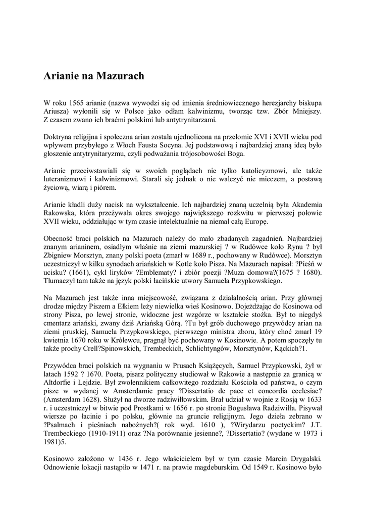 Arianie na Mazurach W roku 1565 arianie (nazwa wywodzi się od imienia średniowiecznego herezjarchy biskupa Ariusza) wyłonili się w Polsce jako odłam kalwinizmu, tworząc tzw. Zbór Mniejszy. Z czasem zwano ich braćmi polskimi lub antytrynitarzami. Doktryna religijna i społeczna arian została ujednolicona na przełomie XVI i XVII wieku pod wpływem przybyłego z Włoch Fausta Socyna. Jej podstawową i najbardziej znaną ideą było głoszenie antytrynitaryzmu, czyli podważania trójosobowości Boga. Arianie przeciwstawiali się w swoich poglądach nie tylko katolicyzmowi, ale także luteranizmowi i kalwinizmowi. Starali się jednak o nie walczyć nie mieczem, a postawą życiową, wiarą i piórem. Arianie kładli duży nacisk na wykształcenie. Ich najbardziej znaną uczelnią była Akademia Rakowska, która przeżywała okres swojego największego rozkwitu w pierwszej połowie XVII wieku, oddziałując w tym czasie intelektualnie na niemal całą Europę. Obecność braci polskich na Mazurach należy do mało zbadanych zagadnień. Najbardziej znanym arianinem, osiadłym właśnie na ziemi mazurskiej ? w Rudówce koło Rynu ? był Zbigniew Morsztyn, znany polski poeta (zmarł w 1689 r., pochowany w Rudówce). Morsztyn uczestniczył w kilku synodach ariańskich w Kotle koło Pisza. Na Mazurach napisał: ?Pieśń w ucisku? (1661), cykl liryków ?Emblematy? i zbiór poezji ?Muza domowa?(1675 ? 1680). Tłumaczył tam także na język polski łacińskie utwory Samuela Przypkowskiego. Na Mazurach jest także inna miejscowość, związana z działalnością arian. Przy głównej drodze między Piszem a Ełkiem leży niewielka wieś Kosinowo. Dojeżdżając do Kosinowa od strony Pisza, po lewej stronie, widoczne jest wzgórze w kształcie stożka. Był to niegdyś cmentarz ariański, zwany dziś Ariańską Górą. ?Tu był grób duchowego przywódcy arian na ziemi pruskiej, Samuela Przypkowskiego, pierwszego ministra zboru, który choć zmarł 19 kwietnia 1670 roku w Królewcu, pragnął być pochowany w Kosinowie. A potem spoczęły tu także prochy Crell?Spinowskich, Trembeckich, Schlichtyngów, Morsztynów, Kąckich?1. Przywódca braci polskich na wygnaniu w Prusach Książęcych, Samuel Przypkowski, żył w latach 1592 ? 1670. Poeta, pisarz polityczny studiował w Rakowie a następnie za granicą w Altdorfie i Lejdzie. Był zwolennikiem całkowitego rozdziału Kościoła od państwa, o czym pisze w wydanej w Amsterdamie pracy ?Dissertatio de pace et concordia ecclesiae? (Amsterdam 1628). Służył na dworze radziwiłłowskim. Brał udział w wojnie z Rosją w 1633 r. i uczestniczył w bitwie pod Prostkami w 1656 r. po stronie Bogusława Radziwiłła. Pisywał wiersze po łacinie i po polsku, głównie na gruncie religijnym. Jego dzieła zebrano w ?Psalmach i pieśniach nabożnych?( rok wyd. 1610 ), ?Wirydarzu poetyckim? J.T. Trembeckiego (1910-1911) oraz ?Na porównanie jesienne?, ?Dissertatio? (wydane w 1973 i 1981)5. Kosinowo założono w 1436 r. Jego właścicielem był w tym czasie Marcin Drygalski. Odnowienie lokacji nastąpiło w 1471 r. na prawie magdeburskim. Od 1549 r. Kosinowo było majątkiem rycerskim na prawie lennym. W latach 1666 ? 1800 dzierżawiła je gmina ariańska. Na początku XIX wieku gospodarzył tam Ferdynand Kątski, ożeniony z Katarzyną Sierakowską2. Kosinowo ? siedziba Samuela Przypkowskiego (nabył je wraz z zięciem Mikołajem Suchodolskim za 5 tysięcy florenów) ? było centrum religijnym i kulturalnym arian w Prusach. Istniała tam szkoła o wysokim poziomie nauczania. ?Zdolnych młodych ludzi wysyłano [stamtąd ? przyp. aut. ] na wyższe studia, głównie do Frankfurtu nad Odrą, gdzie ordynowano duchownych ariańskich?3. W Kosinowie i okolicach zaleźli swój azyl bracia polscy wygnani z Polski edyktem o banicji z 20 lipca 1658 r. Wśród znaczniejszych arian zamieszkali w Kosinowie, między innymi, Mikołaj Suchodolski i Krzysztof Crell ? Spinowski, syn rektora Akademii Rakowskiej. Arianie kosinowscy odprawiali nabożeństwa najprawdopodobniej w kaplicy, która stała na cmentarnym wzgórzu. Do Kosinowa na nabożeństwa zjeżdżali się bracia polscy z całego starostwa piskiego i okolicznych starostw. W XVII wieku jednym z duszpasterzy był Benedykt Wiszowaty, wnuk Fausta Socyna. Po zlikwidowaniu zboru w Rudówce (w 1753 r.) całe życie religijne i kulturalne arian skupiało się w Kosinowie. Nabożeństwa odprawiano tylko po polsku. Jeszcze w 1776 r. wystosowano pismo do Fryderyka II o pozwolenie na budowę nowej świątyni. Główną przeszkodą okazał się brak funduszy. Spowodowane to było również zmniejszającą się liczbą arian w Prusach. Z czasem wtopili się oni w ewangelicką społeczność. Ostatecznie parafię ariańską w Kosinowie rozwiązano w 1803 r.4. Miejsca, gdzie tętniło prężne życie religijne i kulturalne arian, gdzie rodziły się poglądy kształtujące kulturę oświecenia, dzisiaj zioną intelektualnym chłodem. Kosinowo w powiecie piskim podzieliło los Rakowa i Pińczowa. W byłym PGR Kosinowo świadomość historyczna miejsca jest nikła. Ariańska Góra w Kosinowie, na której spoczęły prochy Samuela Przypkowskiego i innych arian podzieli zapewne losy historii braci polskich. Pomału staje się wyrobiskiem żwiru. Na zakończenie warto dodać, że Kosinowo nie jest jedyną pamiątką po arianach z okolic Pisza. W XVII w. ariańska rodzina Domaradzkich gospodarzyła w odległym o kilka kilometrów od Kosinowa Rakowie Małym. Wieś tę Domaradzcy nazwali na cześć słynnego niegdyś Rakowa.