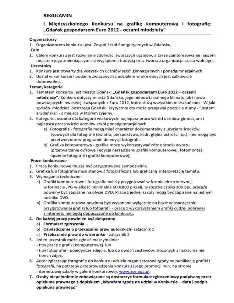 REGULAMIN I Międzyszkolnego Konkursu na grafikę komputerową i fotografię: „Gdańsk gospodarzem Euro 2012 - oczami młodzieży” Organizatorzy 1. Organizatorem konkursu jest Zespół Szkół Energetycznych w Gdańsku, Cele 1. Celem konkursu jest rozwijanie zdolności twórczych uczniów, a także zainteresowanie naszym miastem jego zmieniającym się wyglądem i tradycją oraz twórcza organizacja czasu wolnego. Uczestnicy 1. Konkurs jest otwarty dla wszystkich uczniów szkół gimnazjalnych i ponadgimnazjalnych. 2. Udział w konkursie i podanie związanych z udziałem w nim danych jest całkowicie dobrowolne. Temat, kategorie 1. Tematem konkursu jest miasto Gdańsk: „Gdańsk gospodarzem Euro 2012 – oczami młodzieży”. Konkurs dotyczy miasta Gdańska, jego niepowtarzalnego klimatu jak i nowo powstających inwestycji związanych z Euro 2012, które służą wszystkim mieszkańcom - W jaki sposób młodzież postrzega Gdańsk: krytycznie czy może przejawia poczucie dumy - "Jestem z Gdańska" - z miejsca w którym żyjemy. 2. Kategorie, osobno dla kategorii wiekowych: najlepsza praca wśród uczniów gimnazjum i najlepsza praca wśród uczniów szkół ponadgimnazjalnych. a) Fotografia - fotografie mogą mieć charakter dokumentalny z użyciem środków typowych dla fotografii (światło, perspektywa, kadr, głębia ostrości itp.) i nie mogą być przetworzone w programie do edycji fotografii. b) Grafika komputerowa - grafika może wykorzystywać różne środki wyrazu (przetwarzanie cyfrowe i edycja narzędziami grafiki komputerowej, fotomontaż, łączenie fotografii i grafiki komputerowej) Prace konkursowe 1. Prace konkursowe muszą być przygotowane samodzielnie. 2. Grafika lub fotografia musi stanowić fotograficzną lub graficzną interpretację tematu. 3. Wymagania techniczne: a) Grafiki komputerowe i fotografie należy przygotować w formie elektronicznej, w formacie JPG wielkość minimalna 600x800 pikseli, w rozdzielczości 300 ppi, praca/e powinny być zapisane na płycie DVD. Prace z jednej szkoły mogą być zapisane na jednym nośniku DVD. b) Grafika komputerowa powinna być wykonana wyłącznie na bazie własnoręcznie przygotowanej grafiki lub fotografii - prace z wykorzystaniem grafiki cudzej pobranej z Internetu nie będą dopuszczone do konkursu. 4. Do każdej pracy powinien być dołączony a) Formularz zgłoszenia b) Oświadczenie o przekazaniu praw autorskich- załącznik 1 c) Przekazanie praw do wizerunku - załącznik 2 5. Jeden uczestnik może zgłosić maksymalnie: - trzy prace z grafiki komputerowej lub - trzy fotografie - pojedyncze zdjęcia, lub do dwóch zestawów: złożonych z maksymalnie trzech zdjęć. 6. Autor zgłaszając fotografię do konkursu udziela organizatorowi zgody na publikację grafiki i fotografii, na potrzeby przeprowadzenia konkursu i jego promocji min. na stronie internetowej szkoły w galerii konkursowej: www.zse.gda.pl. 7. Osoby niepełnoletnie zobowiązane są dostarczyć formularz zgłoszeniowy podpisany przez opiekuna prawnego z dopiskiem „Wyrażam zgodę na udział w Konkursie – data i podpis opiekuna prawnego” 8. Zgłaszając fotografię do konkursu autor oświadcza, że posiada pełne prawa autorskie i majątkowe do zgłoszonej pracy, oraz posiada zgodę osób widniejących na fotografii do udziału w konkursie (o ile takie występują). Do fotografii lub grafiki z wizerunkiem osób Autor zobowiązany jest dostarczyć i uzyskać i przechowywać - potwierdzenie na piśmie zgody osób fotografowanych o przekazaniu praw do wizerunku w konkursie - Załącznik nr.2 do Regulaminu (patrz poniżej). 9. Organizatorzy zastrzegają sobie prawo do odrzucenia prac nie związanych z tematyką konkursu. 10. Zabronione jest przesyłanie prac, sprzecznych z dobrymi obyczajami, naruszających ogólnie przyjęte wartości, których tematyka narusza przepisy prawa, zawiera znaki lub symbole towarowe, symbole i gesty uznane zwyczajowo za obraźliwe. 11. Prace należy przesłać w trakcie trwania danej edycji na adres: ZSE w Gdańsku, ul. Mikołaja Reja 25; 80-333 Gdańsk do dnia 20 maja 2012 roku, z dopiskiem: Konkurs na grafikę i fotografię: „Gdańsk gospodarzem Euro 2012”. Terminarz konkursu 1. Rozpoczęcie konkursu 1 marzec 2012 2. Nadsyłanie prac – do 20 maja 2012 (decyduje data stempla pocztowego) 3. Wyłonienie prac nagrodzonych i ogłoszenie wyników konkursu – 1 czerwca 2012 4. Uroczyste rozdanie dyplomów, nagród uczestnikom konkursu w Zespole Szkół Energetycznych w Gdańsku – termin zostanie podany na stronie szkoły. Nagrody, zasady przyznawania nagród 1. Wszystkie przyznane nagrody są nagrodami równorzędnymi, a organizator zastrzega sobie prawo innego podziału nagród. 2. Jury w składzie: Przewodniczący: Marzena Parowińska (nauczyciel fotografii i grafiki komputerowej), Anna Barnicz (nauczyciel grafiki komputerowej , Aniceta Góra (nauczyciel informatyki) przyzna: a. nagrody za zajęcie I,II,III miejsca w kategoriach: fotografia, grafika komputerowa dla każdej grupy wiekowej osobno (najlepsza praca wśród gimnazjalistów, najlepsza praca wśród uczniów szkół ponadgimnazjalnych) b. trzy wyróżnienia w kategoriach: fotografia, grafika komputerowa dla każdej grupy wiekowej osobno (najlepsza praca wśród gimnazjalistów, najlepsza praca wśród uczniów szkół ponadgimnazjalnych) 3. Jury przewiduje podziękowania dla nauczyciela - którego uczniowie zajmą I,II,III miejsce organizującego i zgłaszającego prace uczniów z danej szkoły za uczestnictwo konkursie. 4. Jury przyzna nagrody kierując się następującymi kryteriami: oryginalność pomysłu, indywidualny i twórczy charakter wypowiedzi oraz poprawność techniczna. Postanowienia końcowe 1. Przesłanie zgłoszenia jest jednoznaczne z akceptacją warunków niniejszego regulaminu wraz z nieodpłatnym przekazaniem organizatorowi praw autorskich,(niewyłącznych) praw majątkowych do utworu w zakresie: publiczne udostępnianie utworu