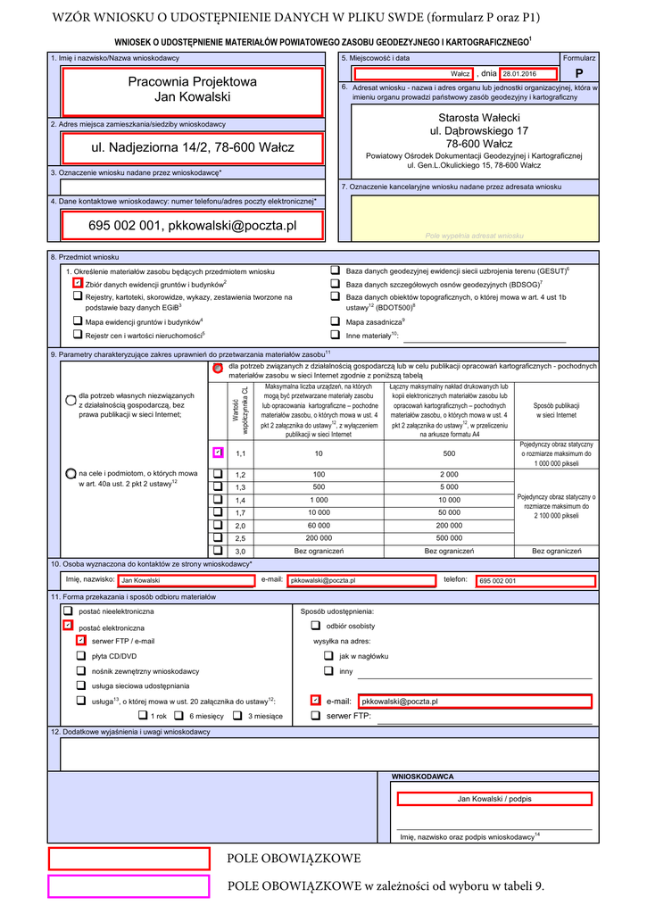 WZÓR WNIOSKU O UDOSTĘPNIENIE DANYCH W PLIKU SWDE (formularz P oraz P1) WNIOSEK O UDOSTĘPNIENIE MATERIAŁÓW POWIATOWEGO ZASOBU GEODEZYJNEGO I KARTOGRAFICZNEGO1 1. Imię i nazwisko/Nazwa wnioskodawcy 5. Miejscowość i data Formularz Wałcz Pracownia Projektowa Jan Kowalski , dnia 28.01.2016 P 6. Adresat wniosku - nazwa i adres organu lub jednostki organizacyjnej, która w imieniu organu prowadzi państwowy zasób geodezyjny i kartograficzny Starosta Wałecki ul. Dąbrowskiego 17 78-600 Wałcz 2. Adres miejsca zamieszkania/siedziby wnioskodawcy ul. Nadjeziorna 14/2, 78-600 Wałcz Powiatowy Ośrodek Dokumentacji Geodezyjnej i Kartograficznej ul. Gen.L.Okulickiego 15, 78-600 Wałcz 3. Oznaczenie wniosku nadane przez wnioskodawcę* 7. Oznaczenie kancelaryjne wniosku nadane przez adresata wniosku 4. Dane kontaktowe wnioskodawcy: numer telefonu/adres poczty elektronicznej* 695 002 001, [email protected] Pole wypełnia adresat wniosku 8. Przedmiot wniosku 1. Określenie materiałów zasobu będących przedmiotem wniosku Zbiór danych ewidencji gruntów i budynków Rejestry, kartoteki, skorowidze, wykazy, zestawienia tworzone na 2 ✔ podstawie bazy danych EGiB3 Baza danych geodezyjnej ewidencji siecii uzbrojenia terenu (GESUT)6 Baza danych szczegółowych osnów geodezyjnych (BDSOG)7 Baza danych obiektów topograficznych, o której mowa w art. 4 ust 1b ustawy12 (BDOT500)8 Mapa ewidencji gruntów i budynków Rejestr cen i wartości nieruchomości 4 5 Mapa zasadnicza9 Inne materiały10: 9. Parametry charakteryzujące zakres uprawnień do przetwarzania materiałów zasobu11 potrzeb własnych niezwiązanych dla z działalnością gospodarczą, bez prawa publikacji w sieci Internet; ✔ na cele i podmiotom, o których mowa w art. 40a ust. 2 pkt 2 ustawy12 dla potrzeb związanych z działalnością gospodarczą lub w celu publikacji opracowań kartograficznych - pochodnych materiałów zasobu w sieci Internet zgodnie z poniższą tabelą Maksymalna liczba urządzeń, na których Łączny maksymalny nakład drukowanych lub mogą być przetwarzane materiały zasobu kopii elektronicznych materiałów zasobu lub lub opracowania kartograficzne – pochodne opracowań kartograficznych – pochodnych Sposób publikacji w sieci Internet materiałów zasobu, o których mowa w ust. 4 materiałów zasobu, o których mowa w ust. 4 12 12 pkt 2 załącznika do ustawy , z wyłączeniem pkt 2 załącznika do ustawy , w przeliczeniu publikacji w sieci Internet na arkusze formatu A4 Pojedynczy obraz statyczny 1,1 10 500 o rozmiarze maksimum do 1 000 000 pikseli Wartość współczynnika CL 1,2 100 1,3 500 2 000 5 000 1,4 1 000 10 000 1,7 10 000 50 000 2,0 60 000 200 000 2,5 200 000 500 000 3,0 Bez ograniczeń Bez ograniczeń Pojedynczy obraz statyczny o rozmiarze maksimum do 2 100 000 pikseli Bez ograniczeń 10. Osoba wyznaczona do kontaktów ze strony wnioskodawcy* Imię, nazwisko: Jan Kowalski e-mail: telefon: [email protected] 695 002 001 11. Forma przekazania i sposób odbioru materiałów ✔ postać nieelektroniczna Sposób udostępnienia: postać elektroniczna ✔ odbiór osobisty wysyłka na adres: serwer FTP / e-mail płyta CD/DVD nośnik zewnętrzny wnioskodawcy jak w nagłówku inny usługa sieciowa udostępniania usługa13, o której mowa w ust. 20 załącznika do ustawy12: 1 rok 6 miesięcy 3 miesiące ✔ e-mail: [email protected] serwer FTP: 12. Dodatkowe wyjaśnienia i uwagi wnioskodawcy WNIOSKODAWCA Jan Kowalski / podpis Imię, nazwisko oraz podpis wnioskodawcy14 POLE OBOWIĄZKOWE POLE OBOWIĄZKOWE w zależności od wyboru w tabeli 9. Przypisy: 1. 2. 3. 4. 5. 6. 7. 8. 9. 10. 11. 12. Informacje o aktualnie dostępnych materiałach powiatowego zasobu geodezyjnego i kartograficznego udostępnia organ prowadzący ten zasób. Uszczegółowienie wniosku o udostępnienie zbioru danych EGiB zawiera formularz P1. Uszczegółowienie wniosku o udostępnienie rejestrów, kartotek, skorowidzów, wykazów, zestawień tworzonych na podstawie bazy danych EGiB zawiera formularz P2. Uszczegółowienie wniosku o udostępnienie mapy ewidencji gruntów i budynków zawiera formularz P3. Uszczegółowienie wniosku o udostępnienie rejestru cen i wartości nieruchomości zawiera formularz P4. Uszczegółowienie wniosku o udostępnienie zbiorów danych GESUT zawiera formularz P5. Uszczegółowienie wniosku o zbiorów danych BDSOG zawiera formularz P6. Uszczegółowienie wniosku o udostępnienie zbiorów danych bazy danych BDOT500 zawiera formularz P7. Uszczegółowienie wniosku o udostępnienie mapy zasadniczej zawiera formularz P3. Uszczegółowienie wniosku o o udostępnienie innych materiałów zawiera formularz P8. Dopuszczalne jest wskazanie tylko jednego celu. Ustawa z dnia 17 maja 1989r. - Prawo geodezyjne i kartograficzne (Dz. U. z 2010 r., Nr 193, poz. 1287, z późn. zm.). 13. Udostępnienie w formie okresowej usługi sieciowej ma zastosowanie w przypadku udostępniania ortofotomapy lub opracowań kartograficznych, tworzonych na podstawie odpowiednich baz danych, o których mowa w art. 4 ust. 1a pkt 1-3, 7, 8, 10, 11 lub ust. 1b ustawy - Prawo geodezyjne i kartograficzne. 14. Podpis odręczny, podpis elektroniczny, o którym mowa w art. 3 pkt 1 ustawy z dnia 18 września 2001 r. o podpisie elektronicznym, bezpieczny podpis elektroniczny, o którym mowa w art. 3 pkt 2 ustawy z dnia 18 września 2001 r. o podpisie elektronicznym, podpis potwierdzony profilem zaufanym ePUAP, o którym mowa w art. 3 pkt 15 ustawy z dnia 17 lutego 2005 r. o informatyzacji działalności podmiotów realizujących zadania publiczne lub w przypadku składania wniosku za pomocą systemu teleinformatycznego, o którym mowa w przepisach wydanych na podstawie art. 40 ust. 8 ustawy - Prawo geodezyjne i kartograficzne, identyfikator umożliwiający weryfikację wnioskodawcy w tym systemie. * Informacja nieobowiązkowa Wyjaśnienia: 1. Formularze drukowane nie muszą uwzględniać oznaczeń kolorystycznych. 2. Pola formularza można rozszerzać