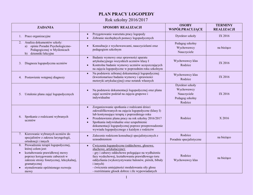 PLAN PRACY LOGOPEDY Rok szkolny 2016/2017