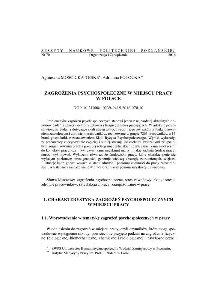 ZESZYTY Nr 70 NAUKOWE POLITECHNIKI Organizacja i Zarządzanie POZNAŃSKIEJ 2016 Agnieszka MOŚCICKA-TESKE*, Adrianna POTOCKA** ZAGROŻENIA PSYCHOSPOŁECZNE W MIEJSCU PRACY W POLSCE DOI: 10.21008/j.0239-9415.2016.070.10 Problematyka zagrożeń psychospołecznych stanowi jeden z najbardziej aktualnych obszarów badań z zakresu ochrony zdrowia i bezpieczeństwa pracujących. W artykule przedstawione są badania dotyczące skali stresu zawodowego i jego związków z funkcjonowaniem zawodowym i zdrowiem pracowników, realizowane w grupie 7263 pracowników z 15 branż gospodarki, z zastosowaniem Skali Ryzyka Psychospołecznego. Wyniki wykazały, że pracownicy zdecydowanie częściej i silniej stresują się cechami związanymi ze sposobem zorganizowania pracy i jakością relacji międzyludzkich (czyli czynnikami należącymi do kontekstu pracy, czyli tzw. czynnikami miękkimi) niż tym, jakie zadania (rodzaj pracy) muszą wykonywać. Wykazano również, że środowisko pracy, które charakteryzuje się wyższym poziomem stresogenności, generuje większą absencję zatrudnionych, większą fluktuację kadr, gorsze wskaźniki stanu zdrowia i poziomu zdolności do pracy zatrudnionych, ich słabsze zaangażowanie w pracę oraz niższy poziom satysfakcji zawodowej. Słowa kluczowe: zagrożenia psychospołeczne, stres zawodowy, skutki stresu, zdrowie pracowników, satysfakcja z pracy, zaangażowanie w pracę 1. CHARAKTERYSTYKA ZAGROŻEŃ PSYCHOSPOŁECZNYCH W MIEJSCU PRACY 1.1. Wprowadzenie w tematykę zagrożeń psychospołecznych w pracy W odniesieniu do zagrożeń w miejscu pracy, czyli czynników, które mogą spowodować wystąpienie szkody, powszechnie przyjęto podział na zagrożenia fizyczne (biologiczne, biomechaniczne, chemiczne i radiologiczne) i psychospołeczne. * ** SWPS Uniwersytet Humanistycznospołeczny Wydział Zamiejscowy w Poznaniu. Instytut Medycyny Pracy im. Prof. J. Nofera w Łodzi. 140 Agnieszka Mościcka-Teske, Adrianna Potocka Kryterium tego podziału stanowi sposób oddziaływania zagrożeń na człowieka. Jeżeli oddziaływanie ma charakter bezpośredni, fizykochemiczny, wówczas mamy do czynienia z zagrożeniami fizycznymi, jeżeli natomiast oddziaływanie ma charakter psychofizjologiczny za pośrednictwem mechanizmów stresu – z zagrożeniami psychospołecznymi. Zagrożenia psychospołeczne w miejscu pracy to inaczej „stresory zawodowe” lub „źródła stresu w pracy”. W 1984 r. Międzynarodowa Organizacja Pracy zdefiniowała zagrożenia psychospołeczne jako rodzaj interakcji zachodzących pomiędzy treścią pracy, organizacją pracy, systemami zarządzania, warunkami a kompetencjami, potrzebami i indywidualnymi właściwościami pracownika. Podejście Międzynarodowej Organizacji Pracy stanowi źródło najbardziej aktualnej i powszechnie akceptowanej definicji psychospołecznych zagrożeń zawodowych, wskazującej, że „psychospołeczne zagrożenia zawodowe to te aspekty organizacji i zarządzania w pracy, wraz z ich kontekstem społecznym i środowiskowym, które potencjalnie mogą powodować szkody psychiczne, społeczne lub fizyczne” (Cox et al., 2000, s. 36). W literaturze naukowej można znaleźć szereg doniesień, które stanowią próbę identyfikacji i porządkowania potencjalnie szkodliwych cech środowiska. Klasyfikacje te oparte są zazwyczaj na modelach teoretycznych stresu lub na bazie danych empirycznych (tzw. list stresorów), przy czym podobnie jak nie przyjmuje się istnienia jednej obowiązującej definicji stresu, tak nie ma również jednego obowiązującego wykazu stresorów zawodowych. Istnieją natomiast próby porządkowania tego rodzaju zagrożeń w pewne grupy, czy też kategorie. Jedną z najważniejszych, z punktu widzenia działań prewencyjnych, kategoryzacją psychospołecznych zagrożeń zawodowych jest podejście proponowane przez Coxa (Cox et al., 2000; 2005), stanowiące równocześnie podstawę dla opublikowanego w 2008 r. ramowego podejścia europejskiego do zarządzania stresem w miejscu pracy (Psychosocial Risk Management European Framework PRIMAEF, 2008). W ujęciu tym autor wskazuje dwie podstawowe grupy psychospołecznych czynników zagrażających: należące do treści pracy i należące do kontekstu pracy. Do pierwszej grupy związanej z treścią pracy, zalicza się takie wymiary jak: środowisko i sprzęt, charakter wykonywanych zadań (treść zadań), obciążenie pracą, tempo pracy oraz czasowe ramy pracy; do drugiej grupy związanej z kontekstem pracy: kulturę i funkcje organizacji, rolę w organizacji, kontrolę (zakres decyzyjności), relacje interpersonalne, oraz relację praca–dom (Cox et al., 2000, 2005; PRIMA-EF, 2008). 1.2. Konsekwencje psychospołecznych zagrożeń w miejscu pracy Zagrożenia psychospołeczne (stresory) stanowią potencjalne źródło stresu, a stres (utrzymujący się w czasie) zazwyczaj prowadzi do szkody (uszczerbku). Szkoda jako skutek działania zagrożeń może mieć charakter fizyczny, psychiczny Zagrożenia psychospołeczne w miejscu pracy w Polsce 141 i społeczny. Można więc wskazać, że skutki narażenia na psychospołeczne zagrożenia zawodowe należy rozpatrywać na trzech poziomach, na których zazwyczaj ujawnia się działanie stresu: fizjologicznym, psychologicznym i behawioralnym (w zachowaniu) (Cox et al., 2000, 2005; Ogińska-Bulik, 2006; Litzke, Schuh, 2007; Scot, 2010; Potocka, 2011). Zmiany fizjologiczne ujawniają się pod wpływem stymulacji aktywności autonomicznego układu nerwowego i układu hormonalnego. Zmiany te można analizować w oparciu o dwie skale czasowe: skutki natychmiastowe i długotrwałe. Te pierwsze to najczęściej skutki krótkotrwałe i zazwyczaj odwracalne, związane ze stanem pobudzenia podczas reakcji na stres. Skutki długotrwałe mogą obejmować stresozależne powikłania chorobowe (choroby stresozależne) i odnosić się tak samo do zdrowia psychicznego jak i fizycznego. Konsekwencje na poziomie psychiki obejmują